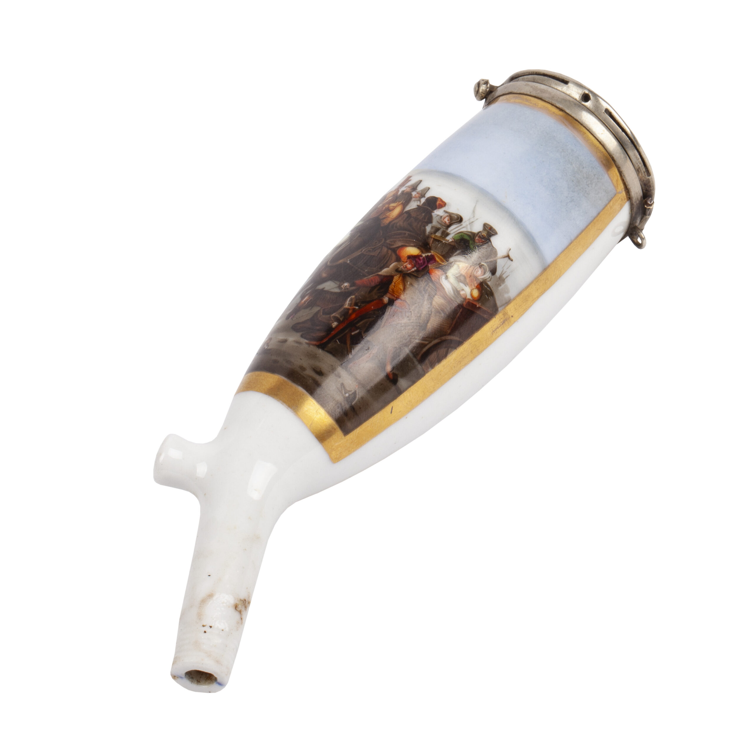 Estimate: 600-800€A porcelain tobacco pipe, the bowl finely painted with a miniature scene of the Battle of Berezina (1812) between Napoleon’s retreating army and Russian forces. The decoration is heightened with gilding, the mount fitted with a metal rim.