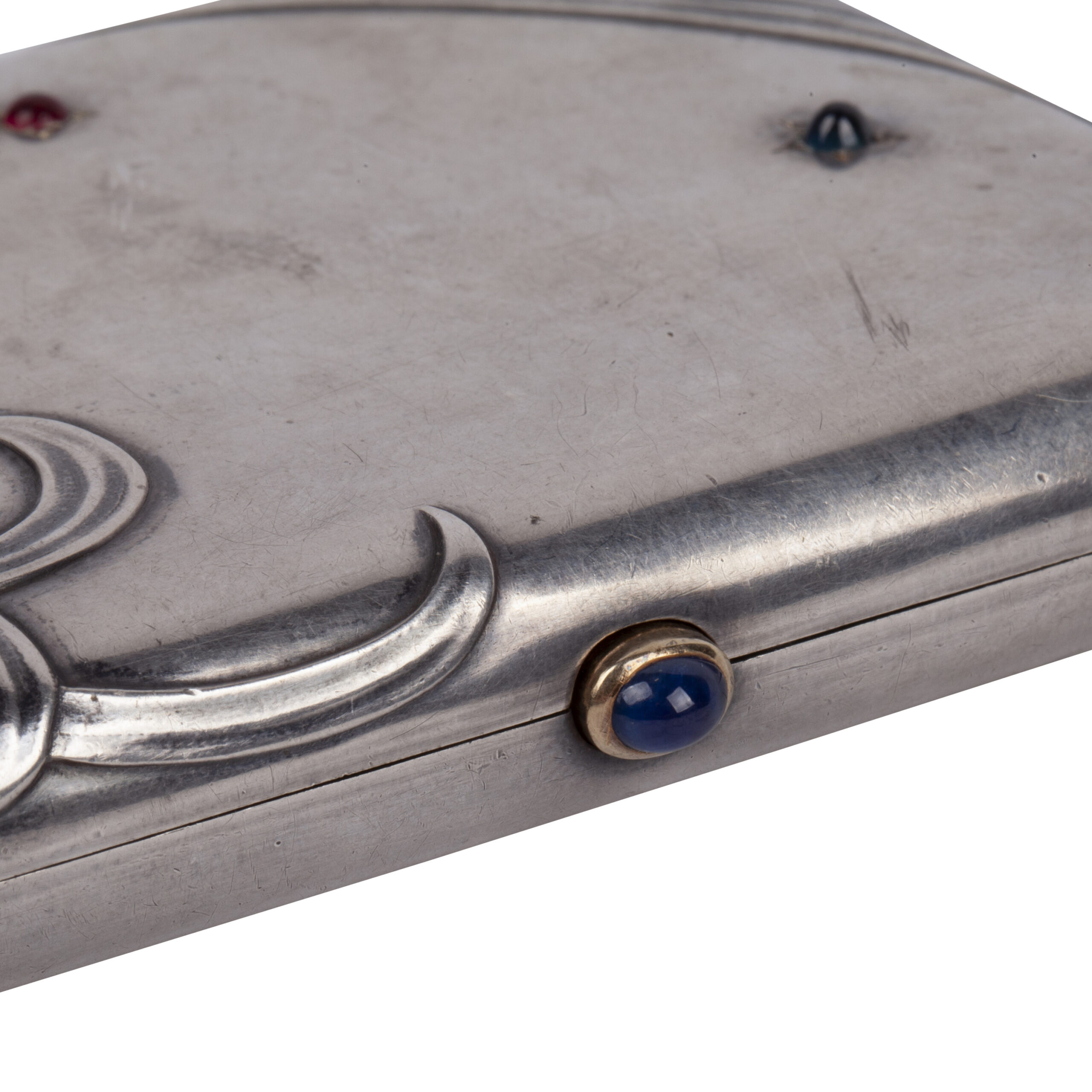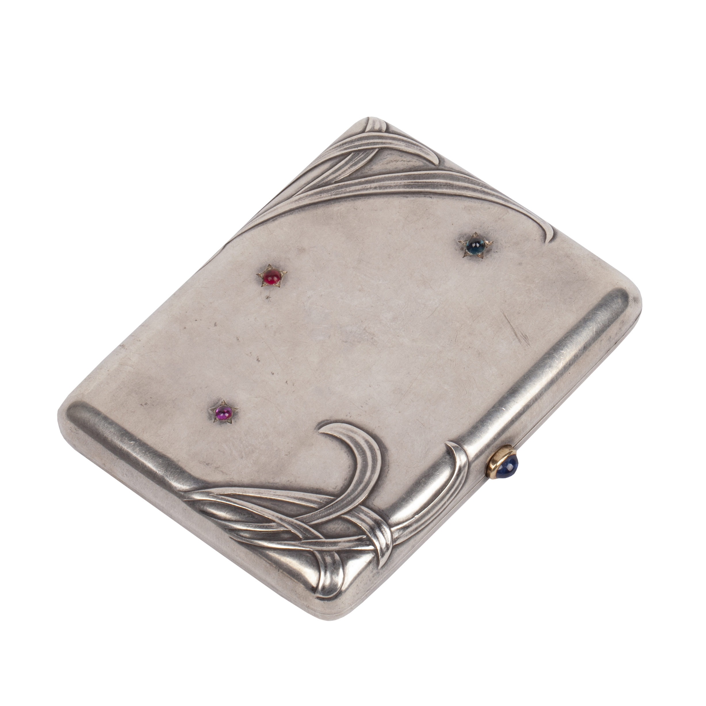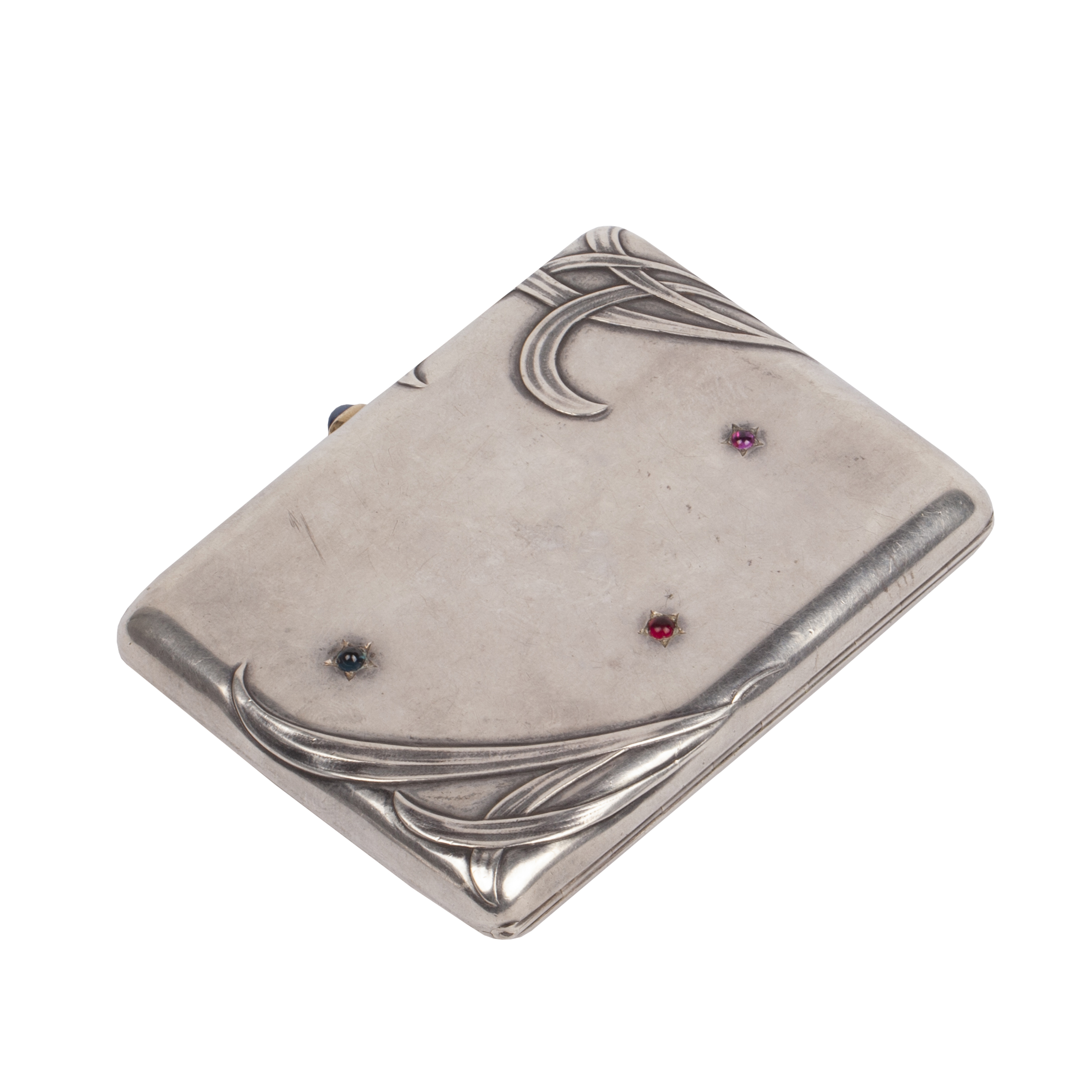 Rectangular silver cigarette case with rounded corners, decorated in the Art Nouveau style. The lid is adorned with flowing linear ornament in relief, resembling stylised plant forms, and set with small ruby cabochon stones in star-shaped casts. The clasp with gold rim is mounted with a cabochon sapphire.