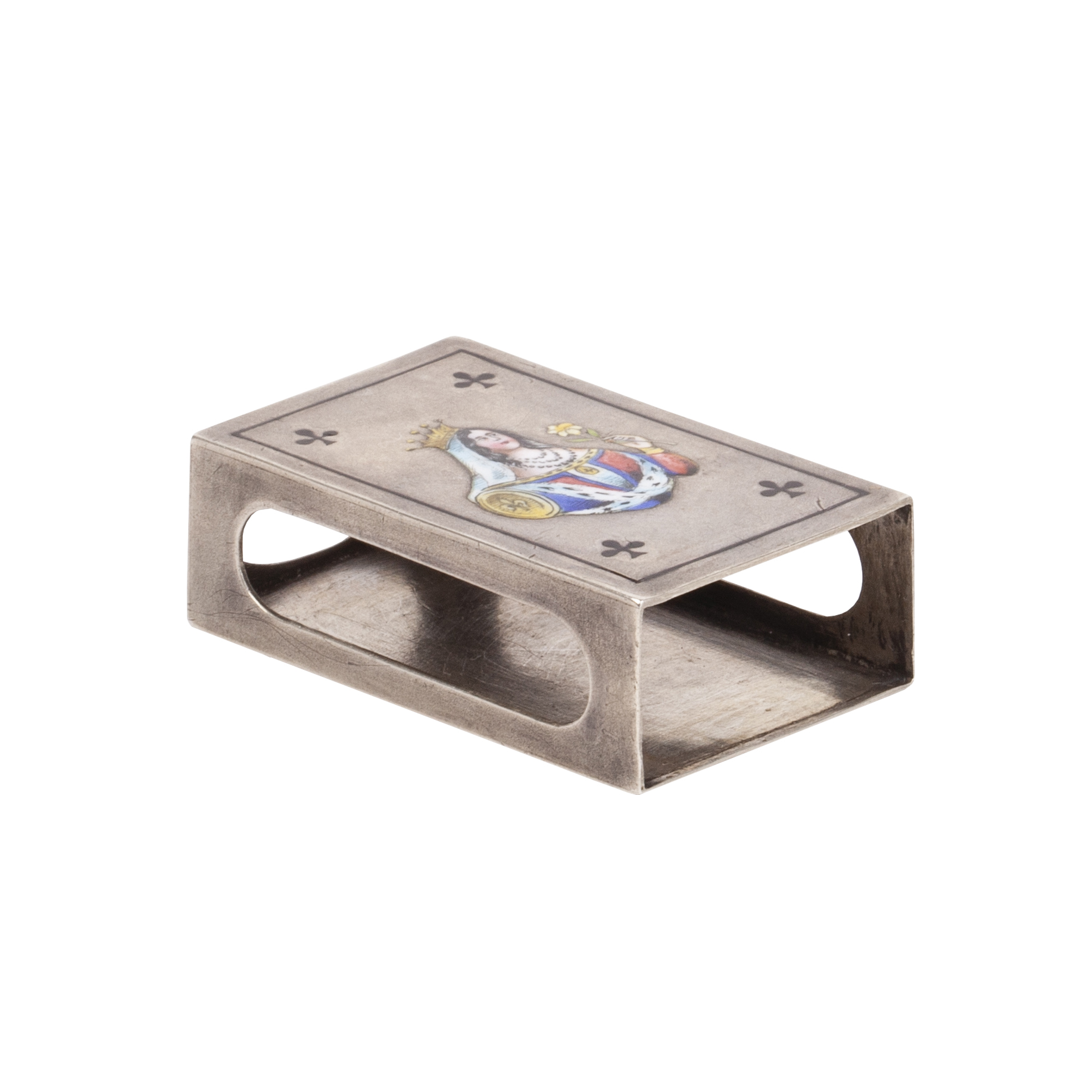 A rectangular silver vesta case designed as a playing card, the Queen of Clubs. The lid is finely enameled with a polychrome depiction of the crowned queen holding a flower, framed by club symbols at each corner. The sides are pierced for striking matches, combining functionality with playful design.Mikhail Pavlovich Ovchinnikov (1855–1915) Son of the firm’s founder, Pavel Akimovich Ovchinnikov. Supplier to the Imperial Court, and patron of the arts. Co-founder and member of the Council of the Imperial Stroganov School. After his father’s death in 1888, he continued the family business, becoming head of the trading house and director of the firm’s St. Petersburg branch.