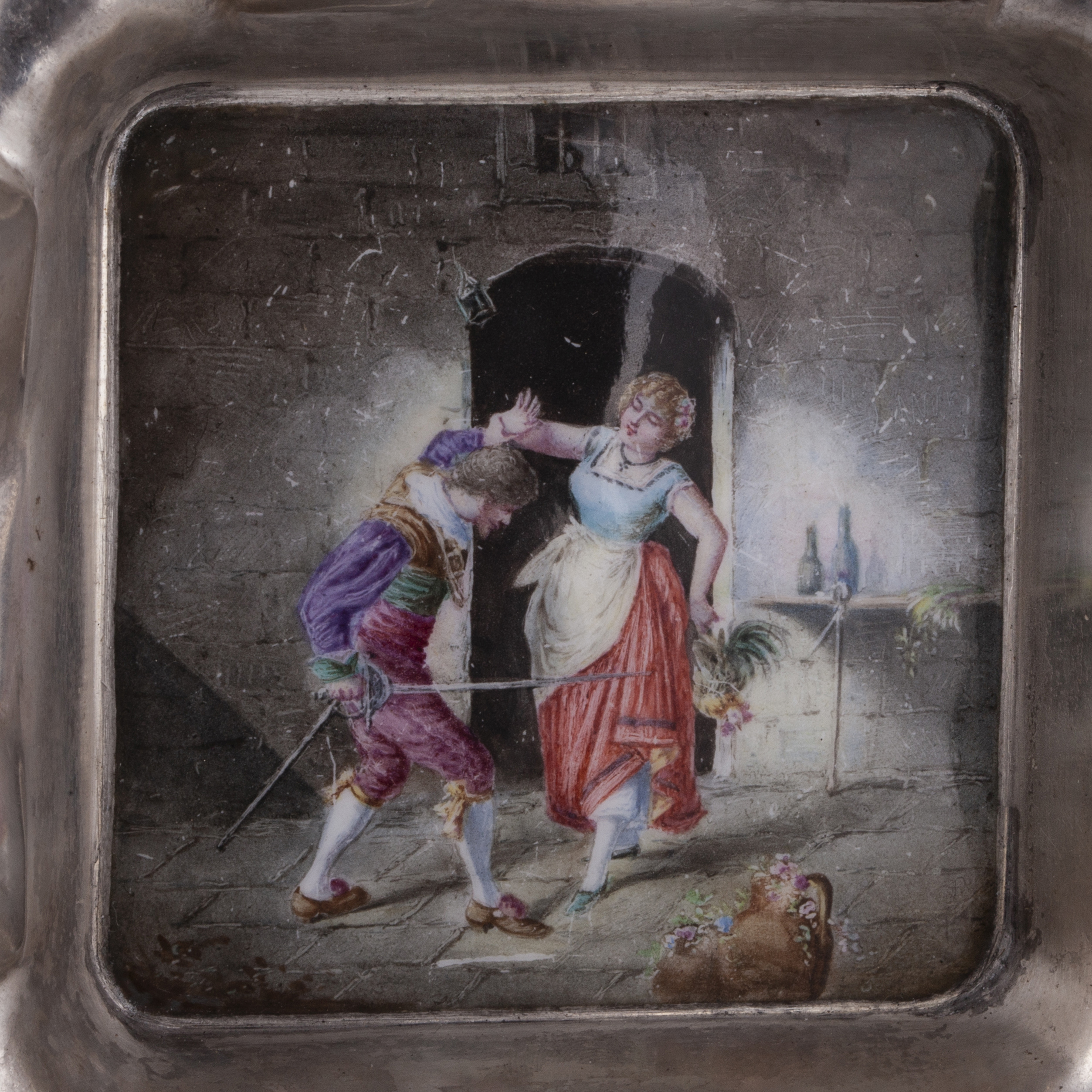 Weight: 161.6 g | Dimensions: 12.8 × 12.8 × 3.3 cmA finely crafted Russian silver ashtray featuring a beautifully executed en plein enamel panel depicting a lively medieval genre scene — a gallant courtier and a young woman engaged in playful conversation at a tavern doorway. The composition, rich in color and theatrical detail, reflects the popular fascination with romanticized historical subjects at the close of the 19th century.