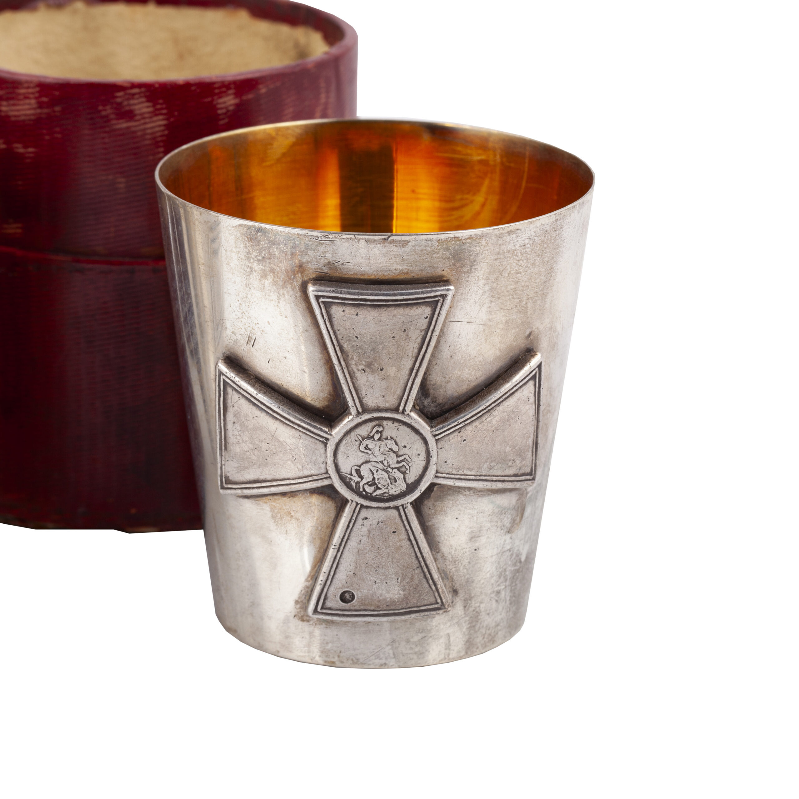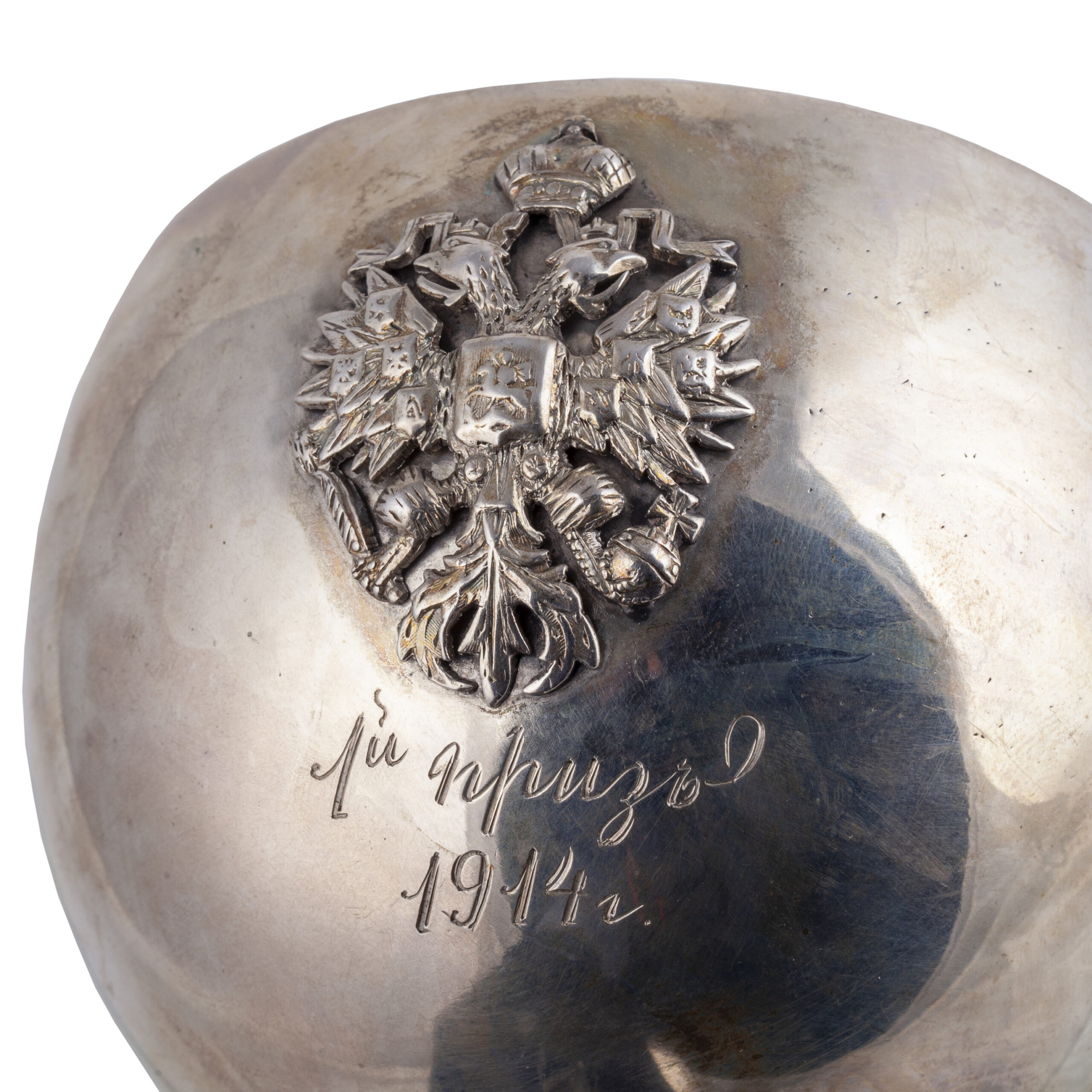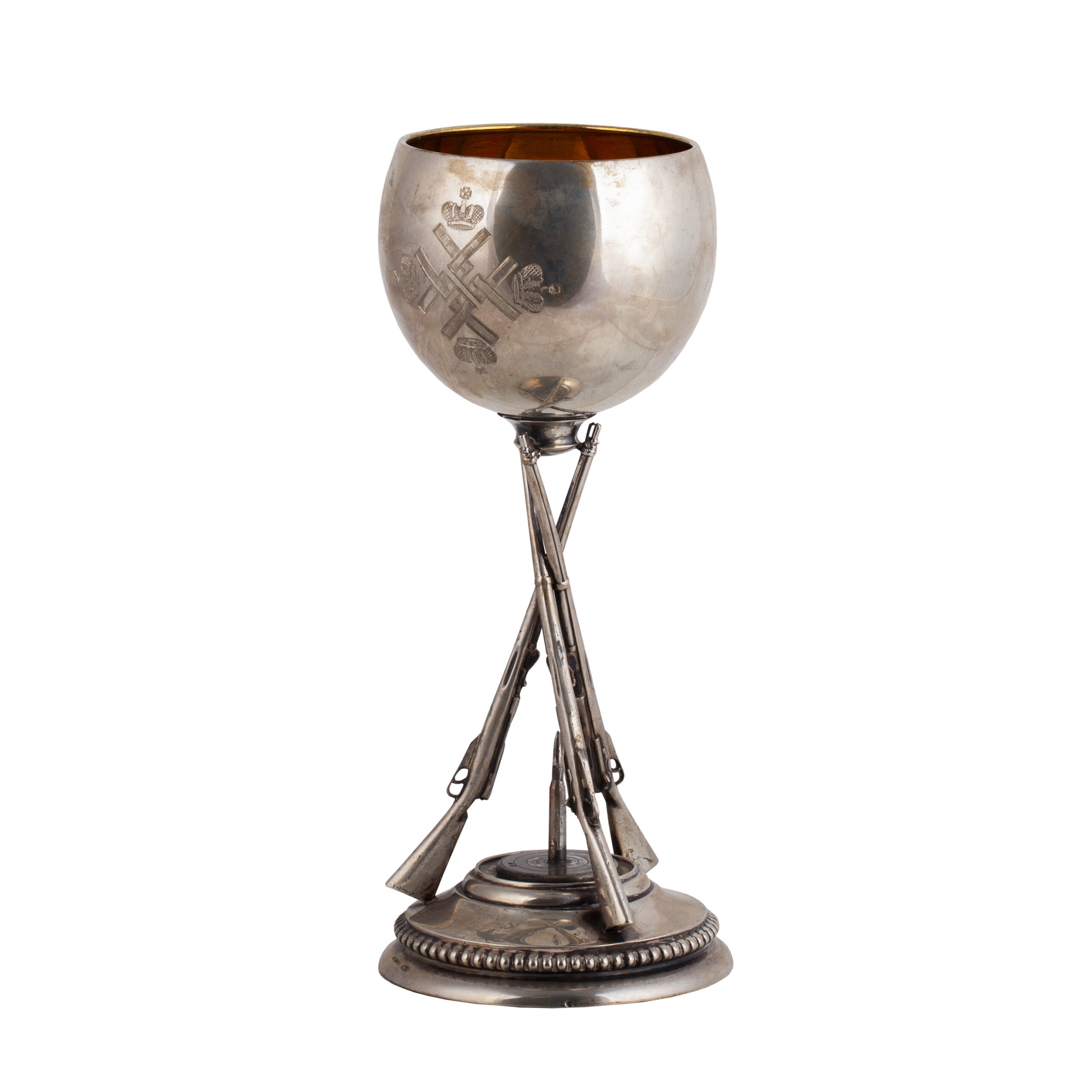 The prize goblet is designed in the form of a cup supported by three crossed rifles, set on a circular stepped base with a beaded rim. The bowl is engraved with crossed rifles beneath Imperial crowns, while the reverse is applied with the Russian Imperial double-headed eagle and the inscription “1-й призъ, 1914 г.” (“1st Prize, 1914”).