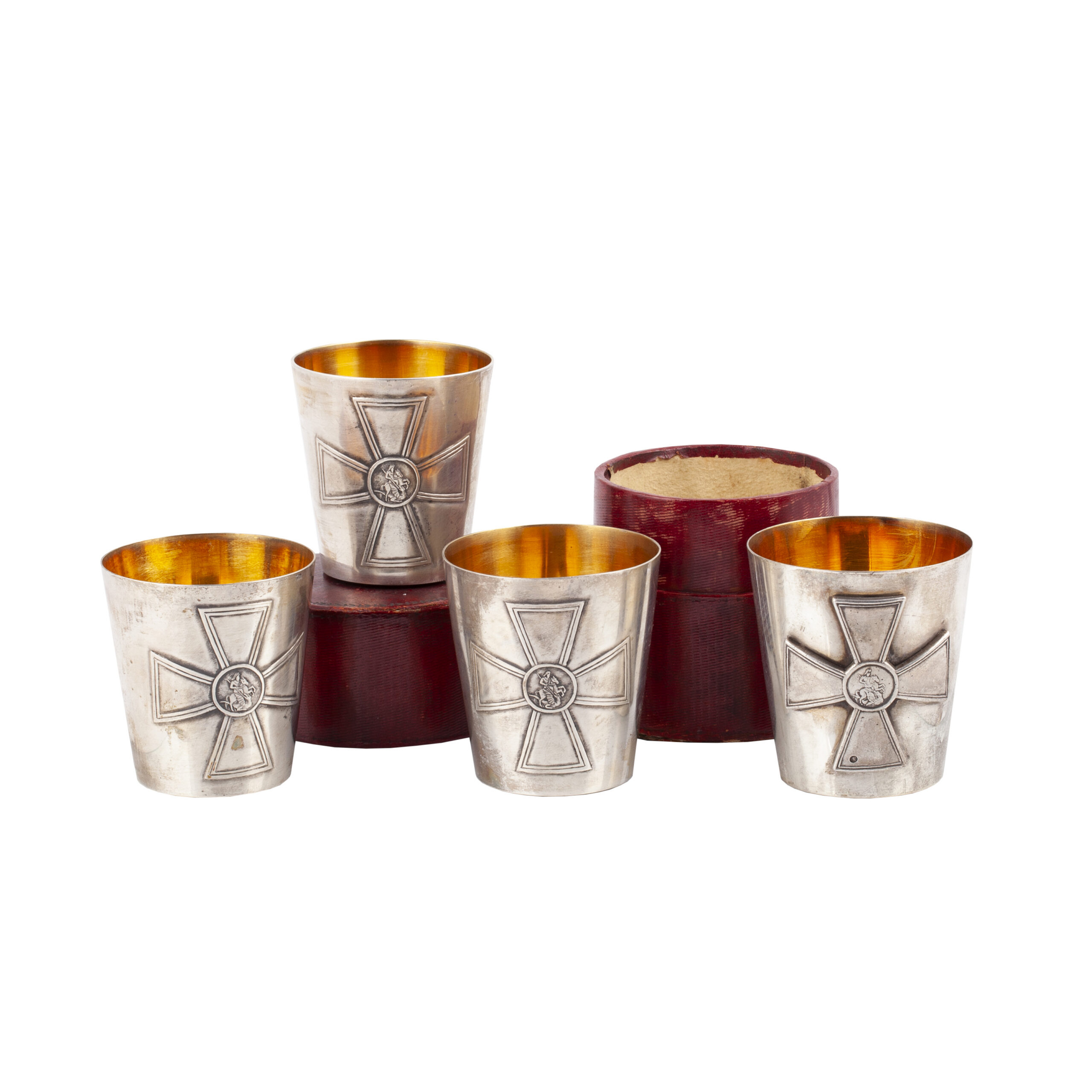 Estimate: 2000-2500€A Russian cast silver set of tableware stands in the form of rifles, presented as a shooting prize from the 85th Imperial Vyborg Infantry Regiment. Maker’s mark of V. Gordon firm, St. Petersburg, 1899–1904.