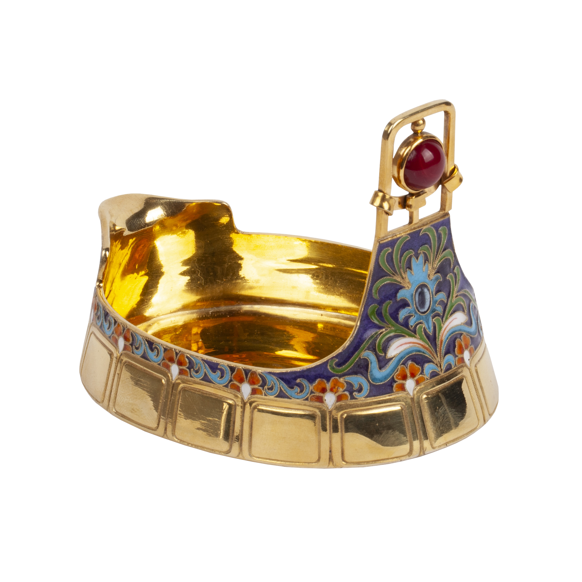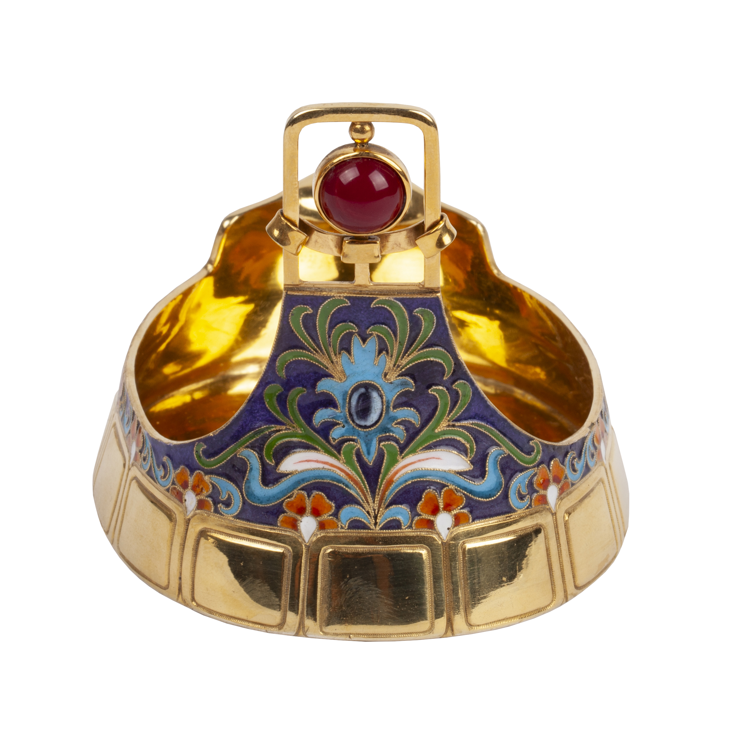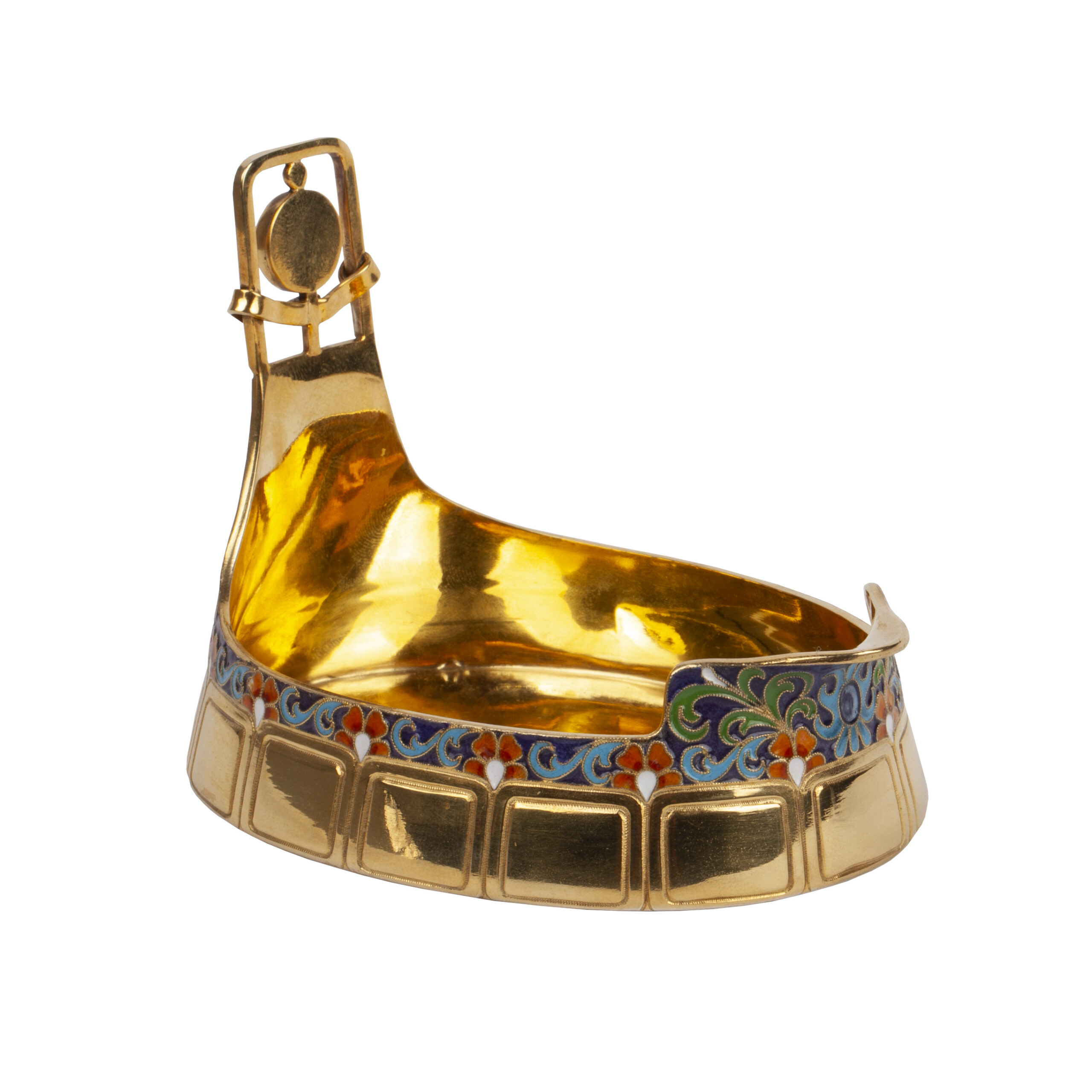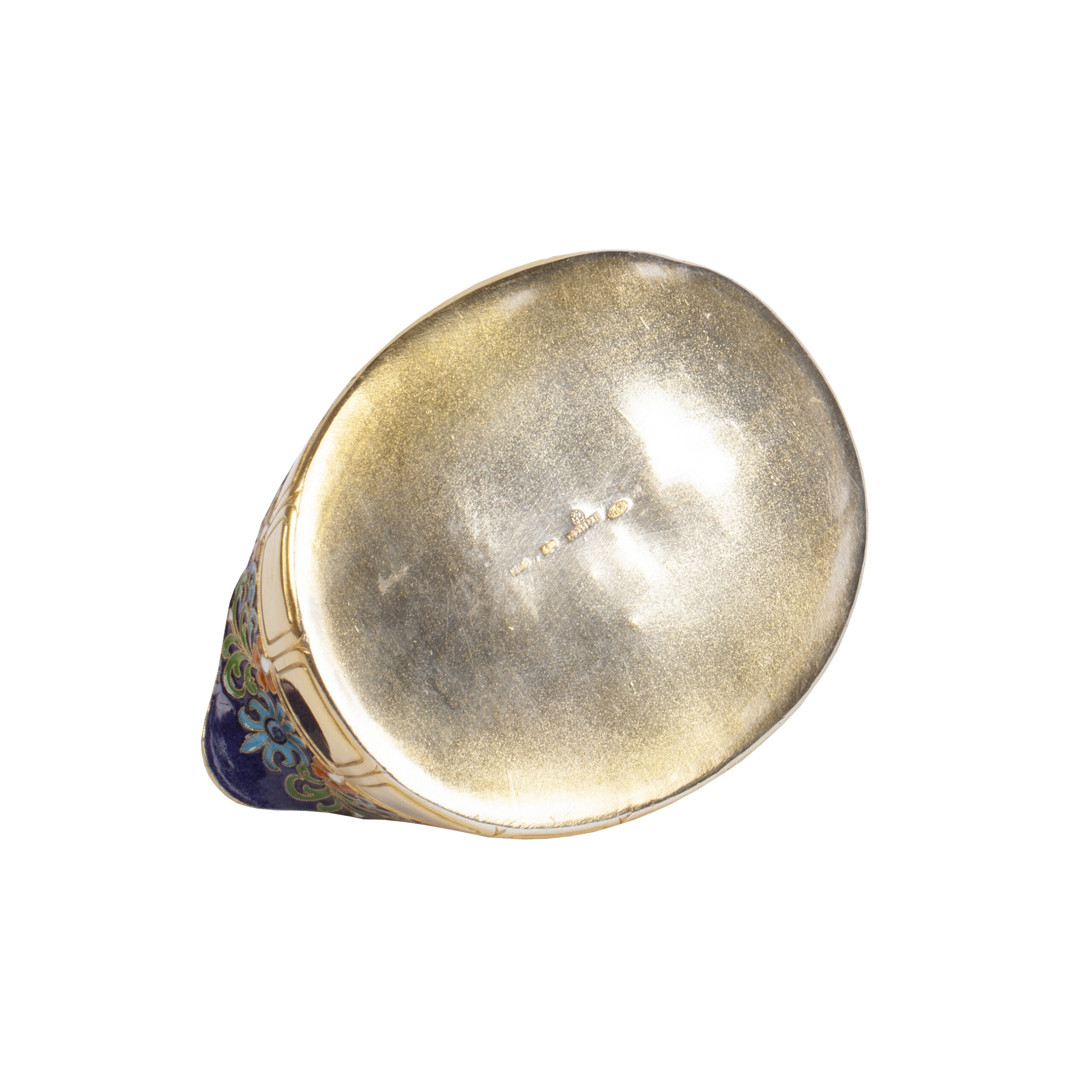 Estimate: 600-800€An interesting silver-gilt and champlevé enamel ashtray, decorated with polychrome enamel motifs and intricate floral engraving. Maker’s mark of Emil Radke, Minsk, 1894. Marked Radke 84.