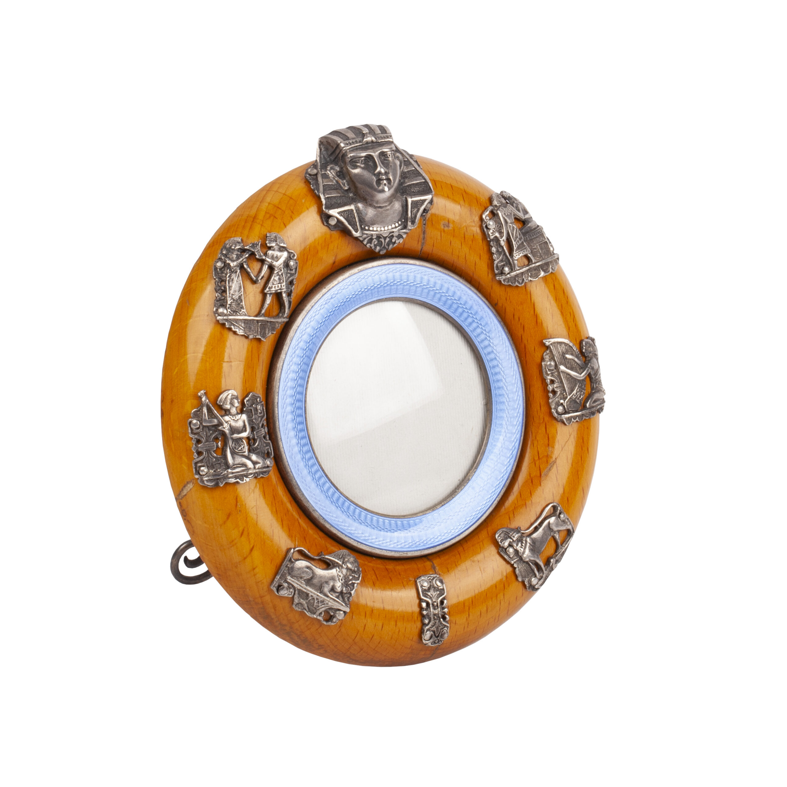 Estimate: 1200-1500€An unusual Russian box of Karelian birch wood, decorated with enamel. The lid set with an enamel monogram HF in Cyrillic, worked in polychrome enamels against a blue ground. The sides further enriched with geometric enamel ornament in red, white, and black. Maker’s mark of Andrei Lukich Perestronin, Vyatka, silver mounts with St. Petersburg assay marks, 1899–1908.
