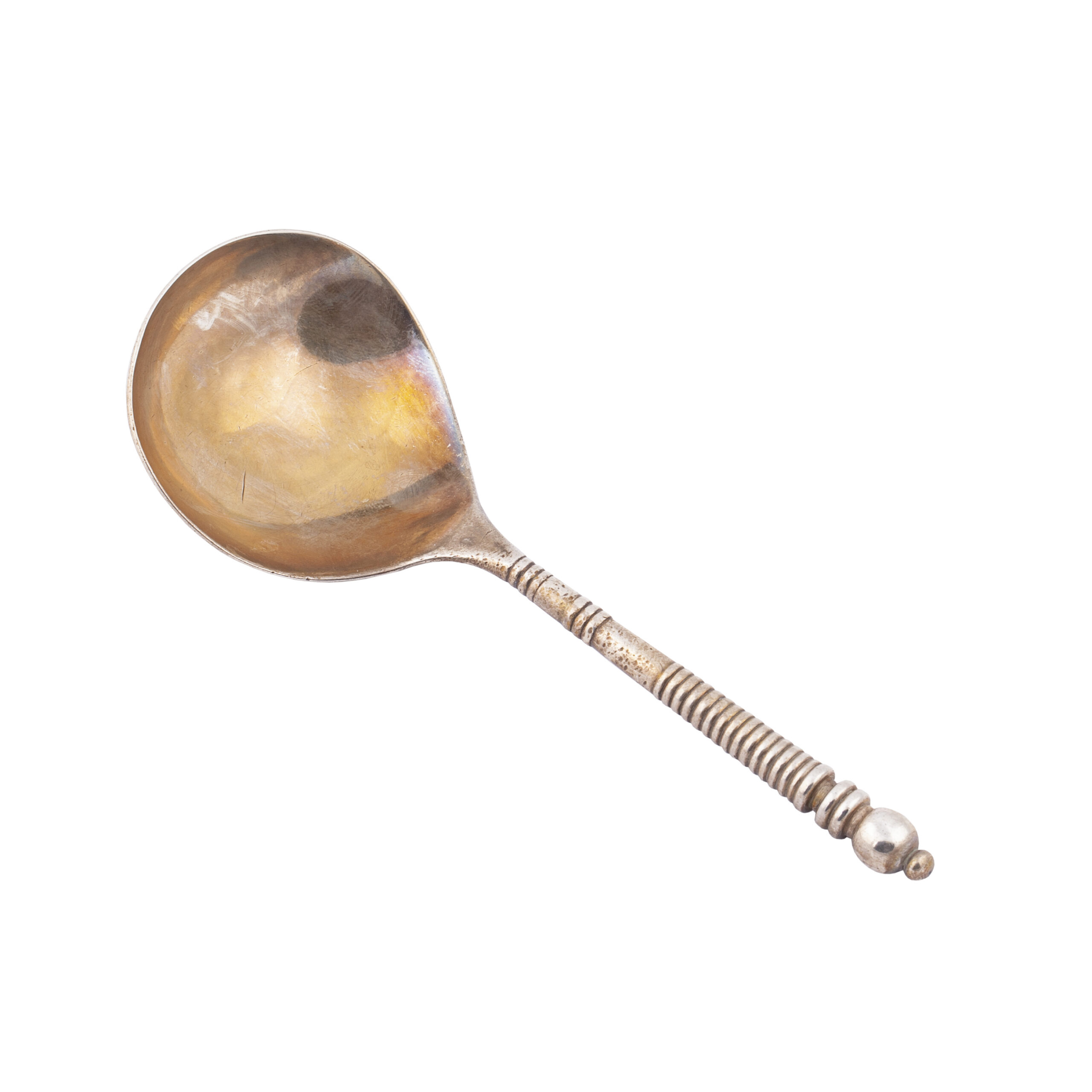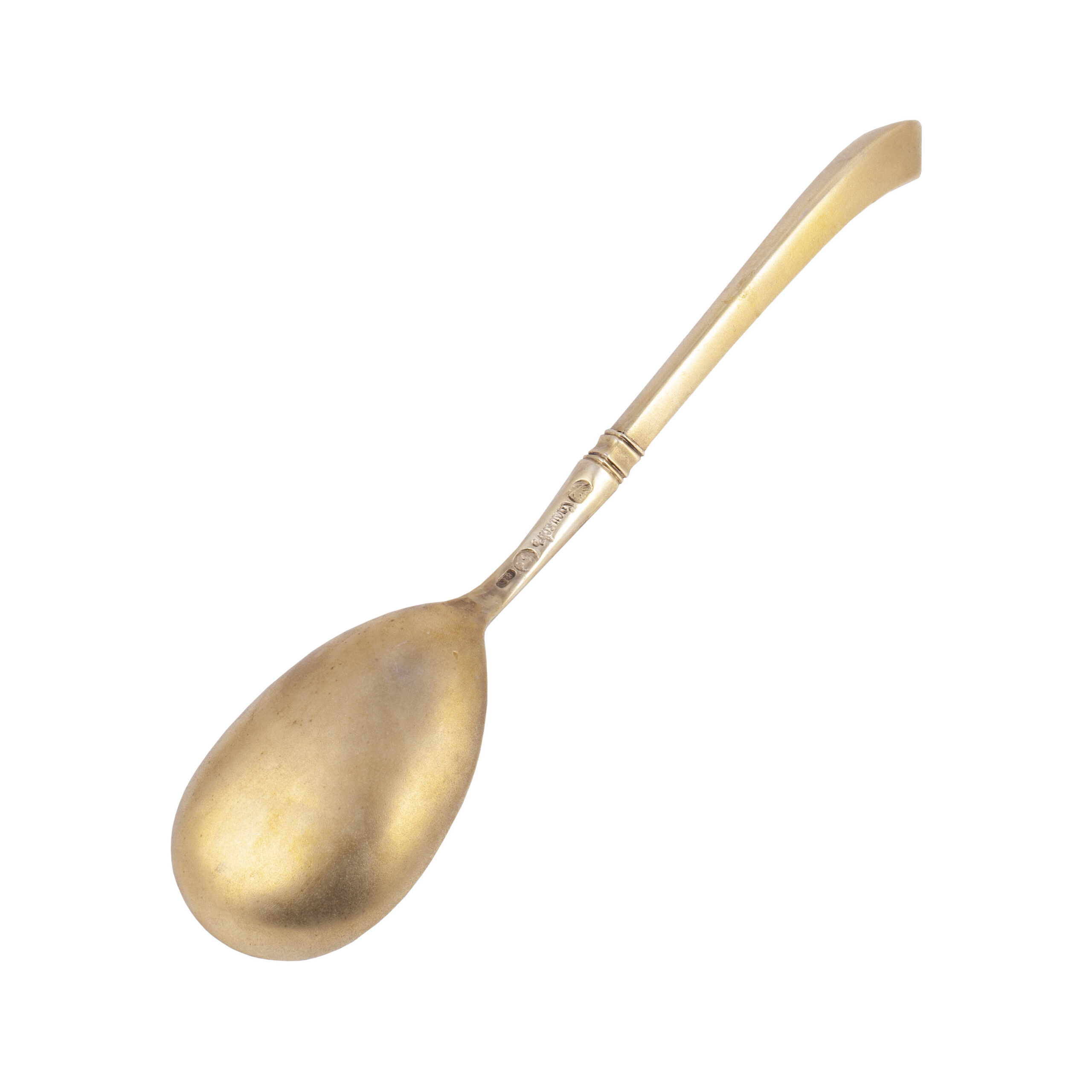Assay mark: Moscow, 1860, 84 zolotniks standardA finely crafted Russian silver-gilt jam spoon with a rounded, deep bowl and a ribbed cylindrical handle terminating in a knob finial. The elegant simplicity of form, combined with the precise turning of the handle, reflects the refined taste of mid-19th-century Moscow silversmiths.