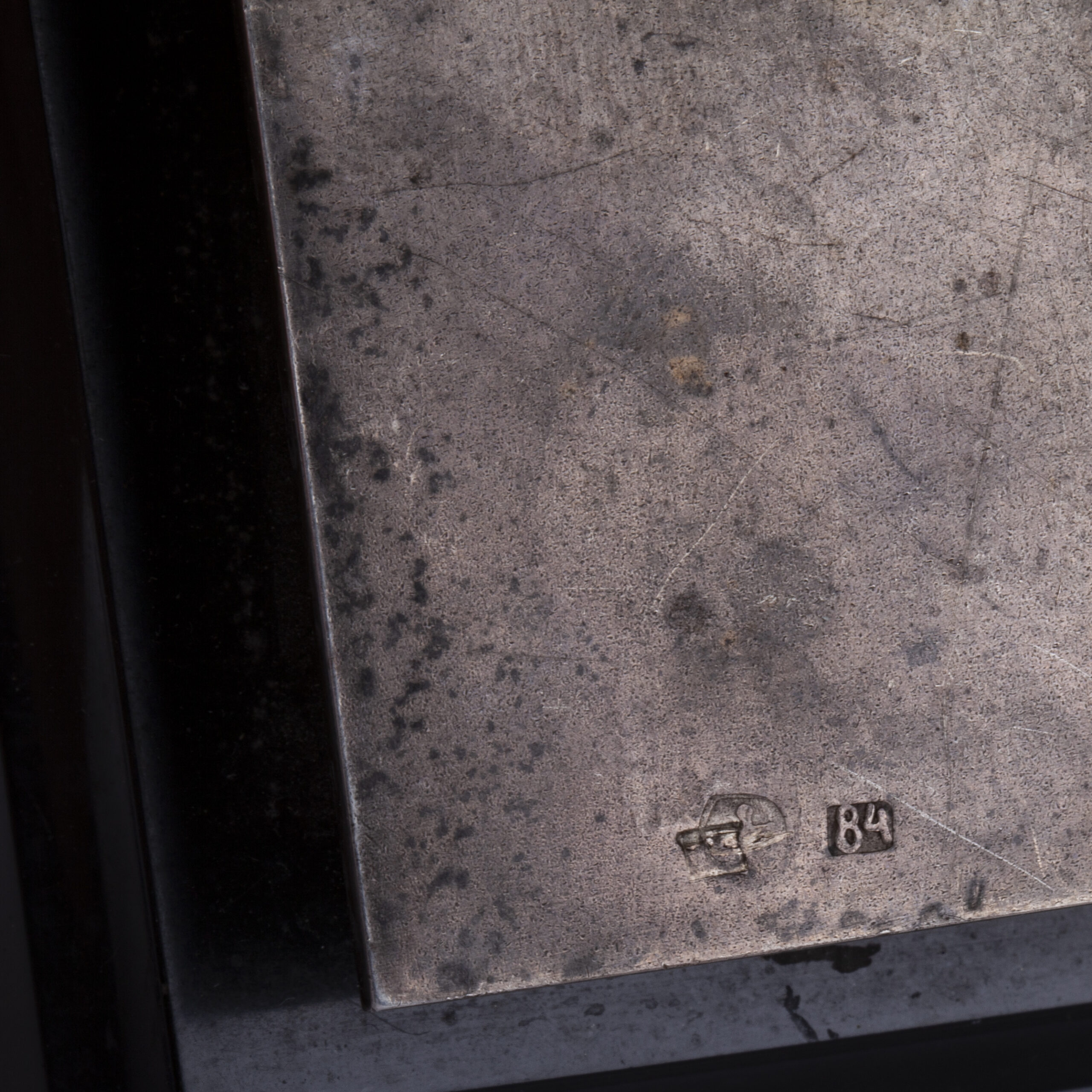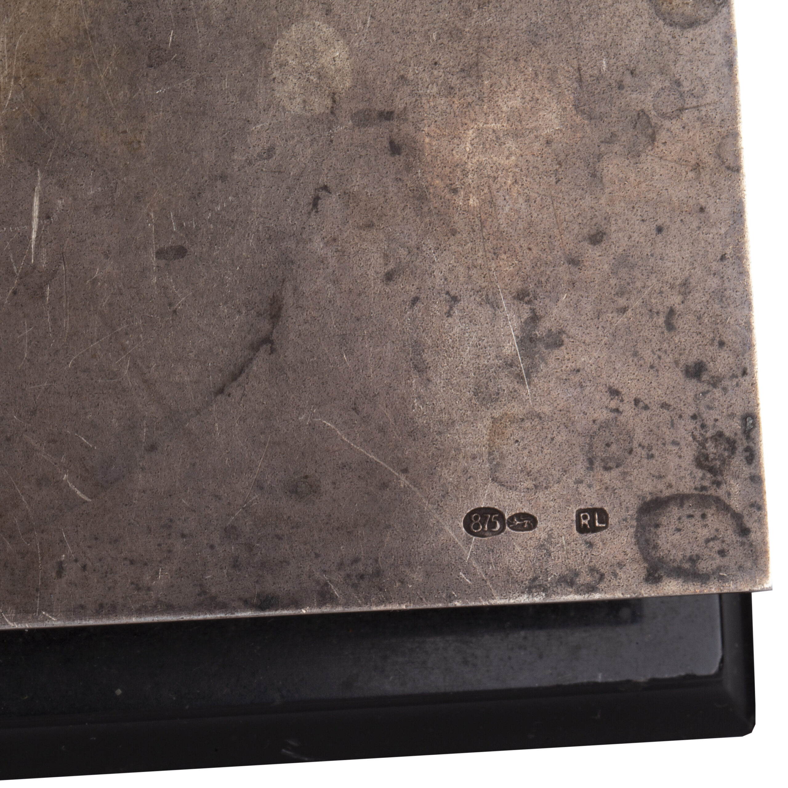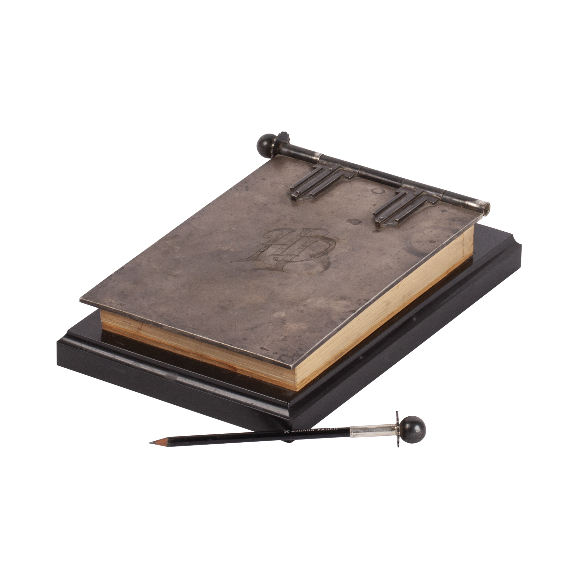 “To Chief Inspector Mr. Heino Ploom in memory of his 50th birthday from his colleagues at Estonian Lloyd. Tallinn, 19 May 1938.”Desk notebook with hinged silver cover and ball finials, mounted to a black marble base; fitted with the original pencil. The cover carries the engraved dedication and a monogram;