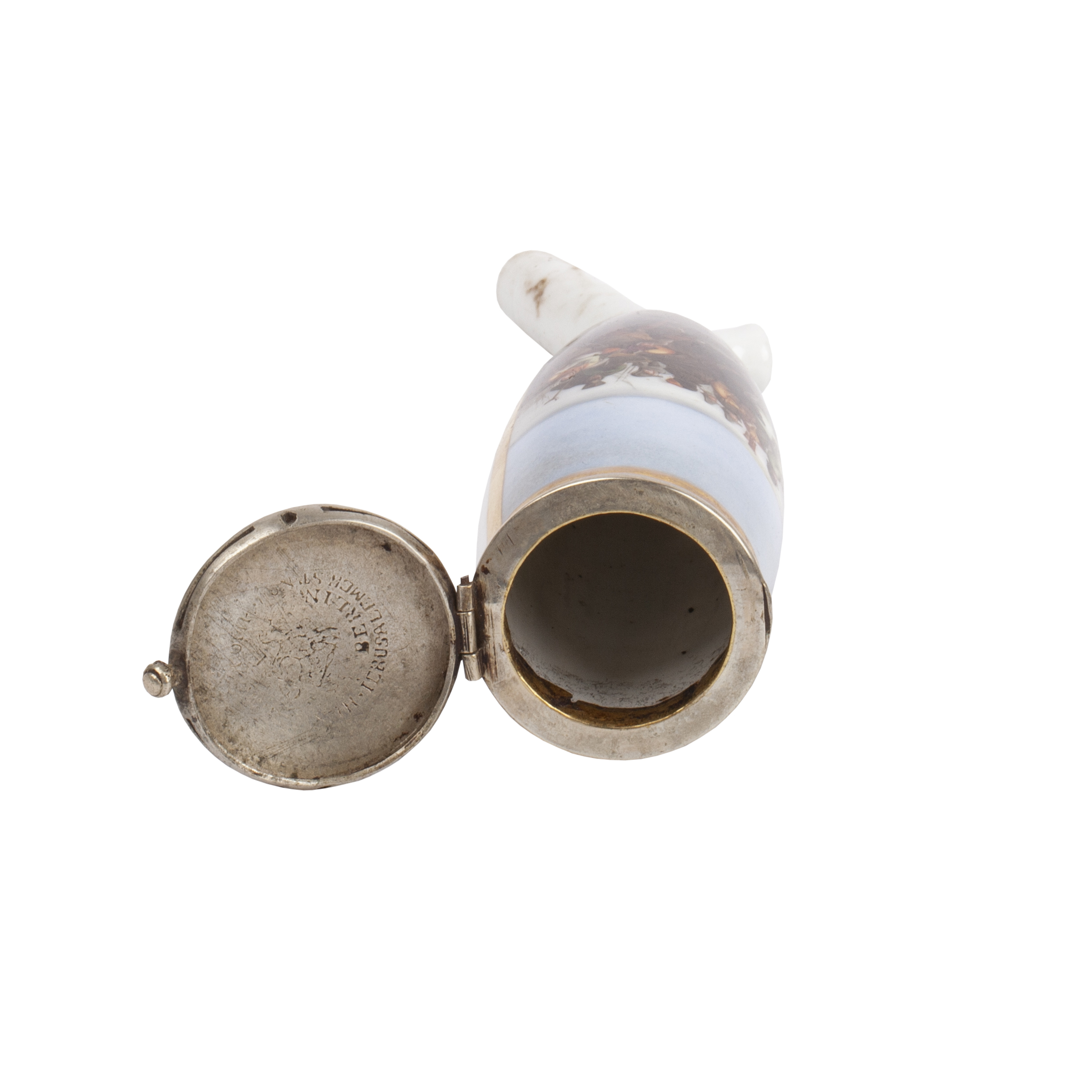 Dimensions: 13 × 3.5 cm.The pipe bowl is made in the most famous porcelain pipe form, the stummel — an oval bowl with a knob heel and a short stem, originally derived from the Gouda clay pipe. Its shape made it especially suitable for miniature painting, and from around 1780 workshops such as Meissen and the Königliche Porzellan Manufaktur in Berlin perfected the art of lifelike decoration, often based on contemporary engravings. Painted subjects included portraits, landscapes, and historical events such as the Napoleonic Wars.