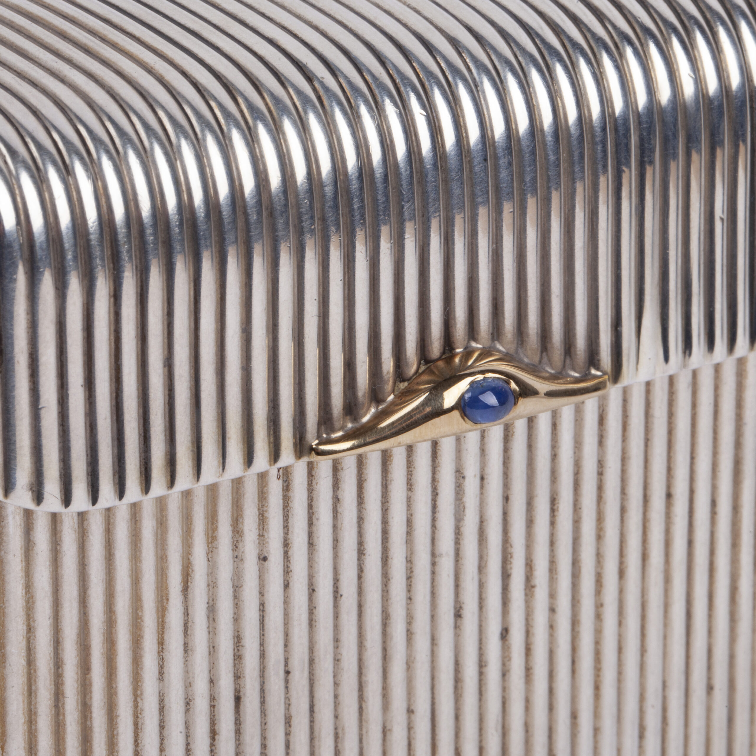 Unusual rectangular corrugated silver cigarette case with rounded edges. The button is set with a sapphire cabochon stone, in a gold rim. The cigarette case is notable for its functional construction with four separate compartments folding into each other, allowing for the storage of different types of cigarettes.