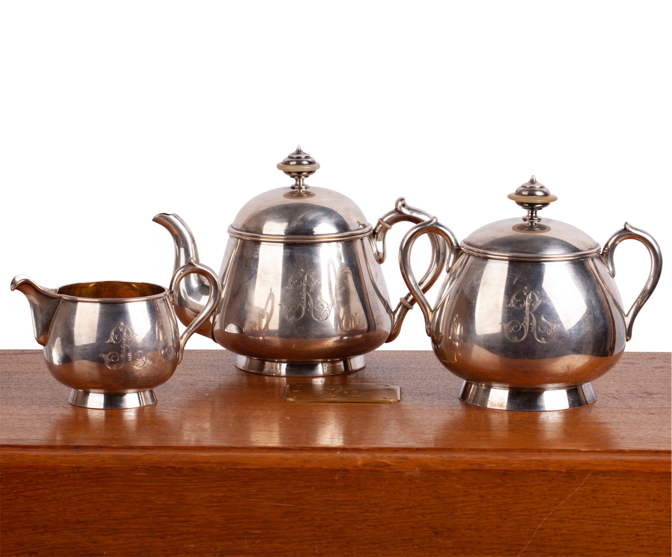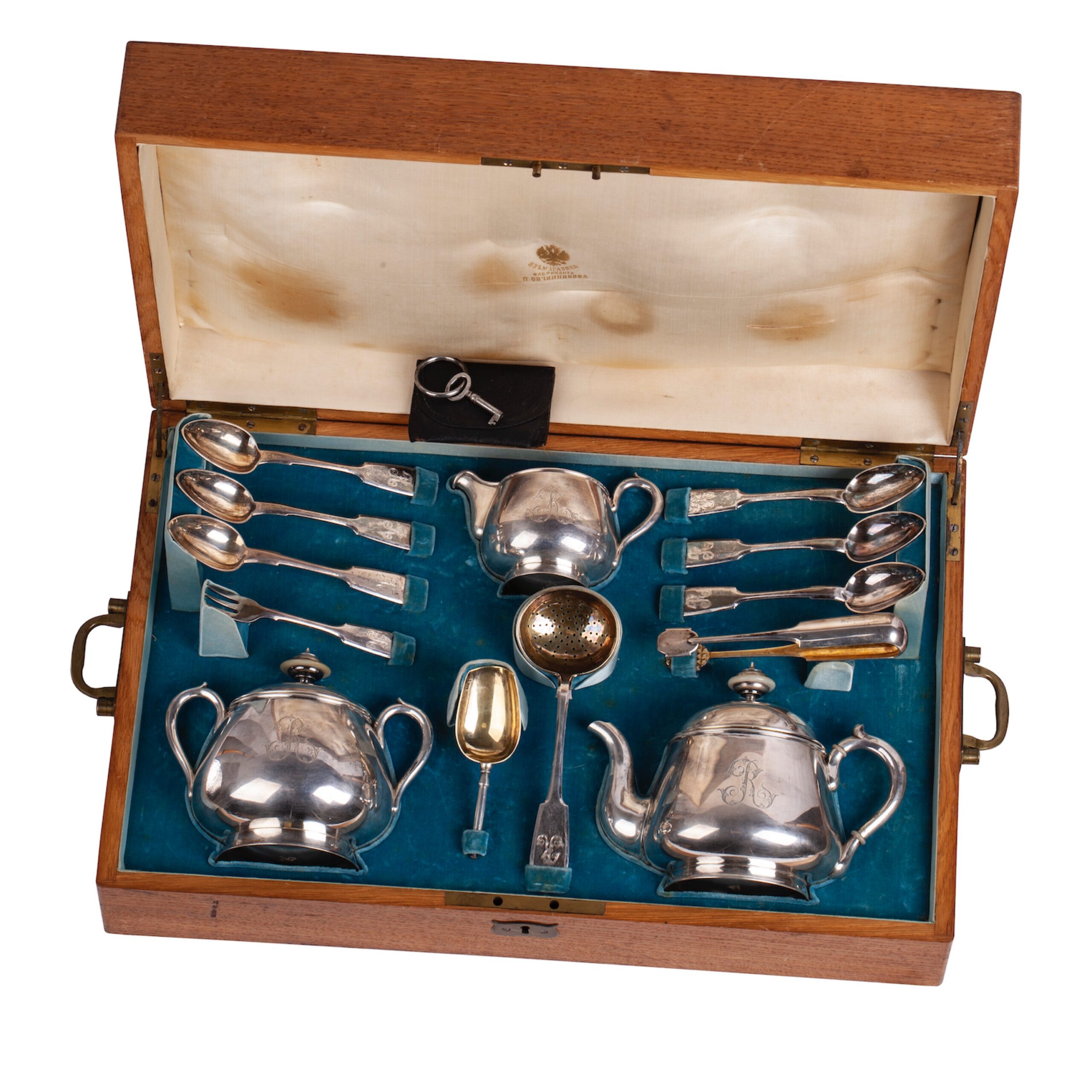 Dimensions of the box: 30.5 × 50.5 × 14 cmComprising a teapot, sugar bowl, cream jug, tea strainer, sugar tongs, and twelve spoons, all finely crafted in silver and preserved in the original velvet-lined wooden traveling case, the interior of the lid stamped in gilt with the Imperial double-headed eagle and the Cyrillic inscription Iz magazina fabrikanta P. Ovchinnikova (“From the shop of the manufacturer P. Ovchinnikov”).