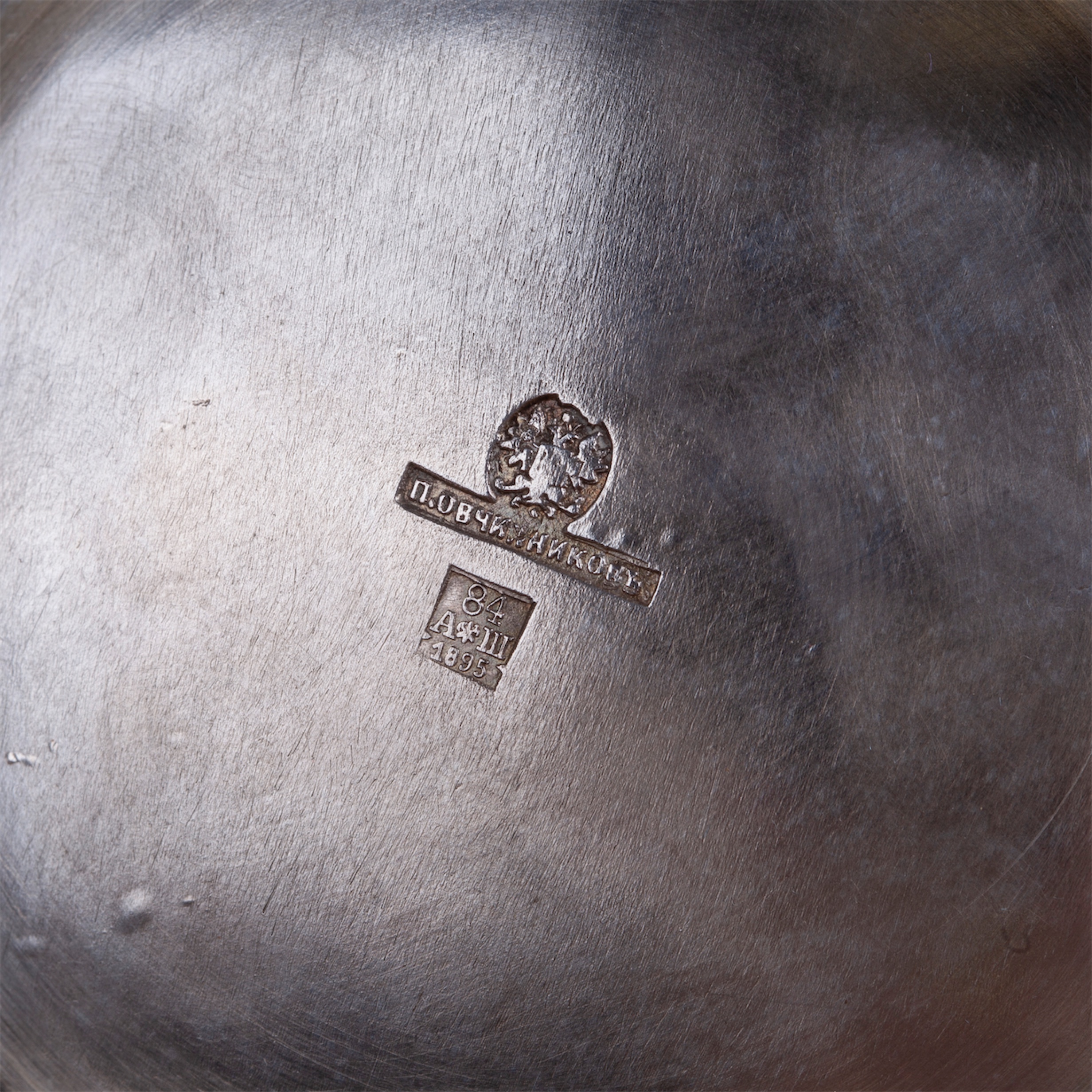 Appointed official supplier to the Imperial Court in 1865, Ovchinnikov mastered and revived ancient Russian techniques in silver creations, often decorated with folkloric motifs, became symbols of Russian national identity and artistic revival.