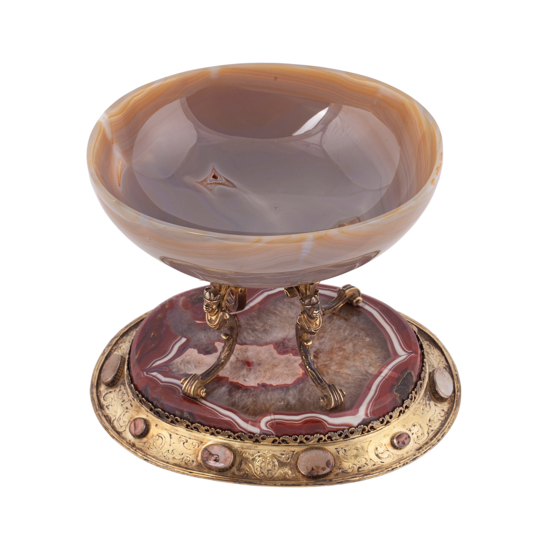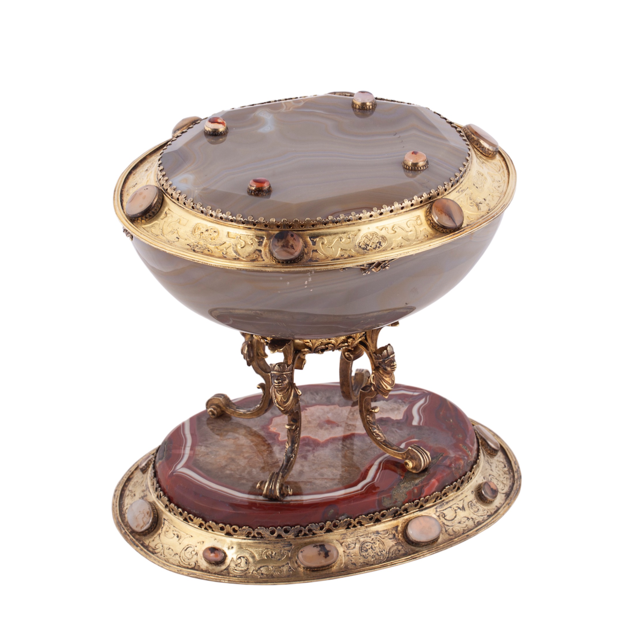 Dimensions of base: 19.2 × 15.2 cmOf oval form, the agate bowl and lid are mounted in chased silver-gilt bands with scrolling Renaissance ornament and set with cabochon stones. The entire vessel rests on a tripod of finely cast gilt-silver scroll supports terminating in lion-paw feet, on an agate plinth similarly mounted with gilt borders and cabochons.