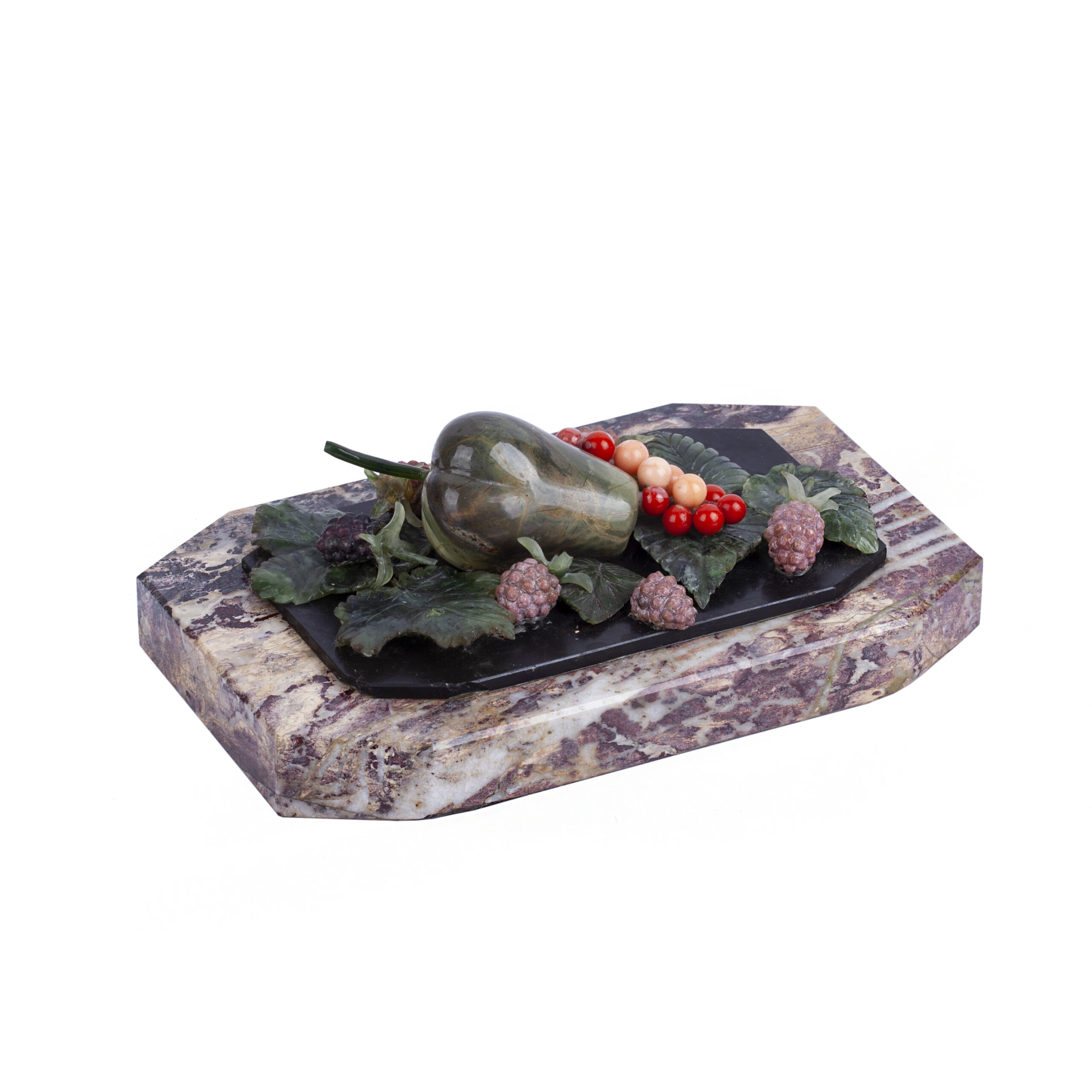 Dimensions: 11.5 x 18 x 7 cm.A naturalistic hardstone composition depicting a cluster of raspberries, currants, and cherries, carved from Ural gems including jasper, serpentine, rock crystal, carnelian, selenite, marble, and coral. The fruits and leaves are mounted on a tiered dark stone base.