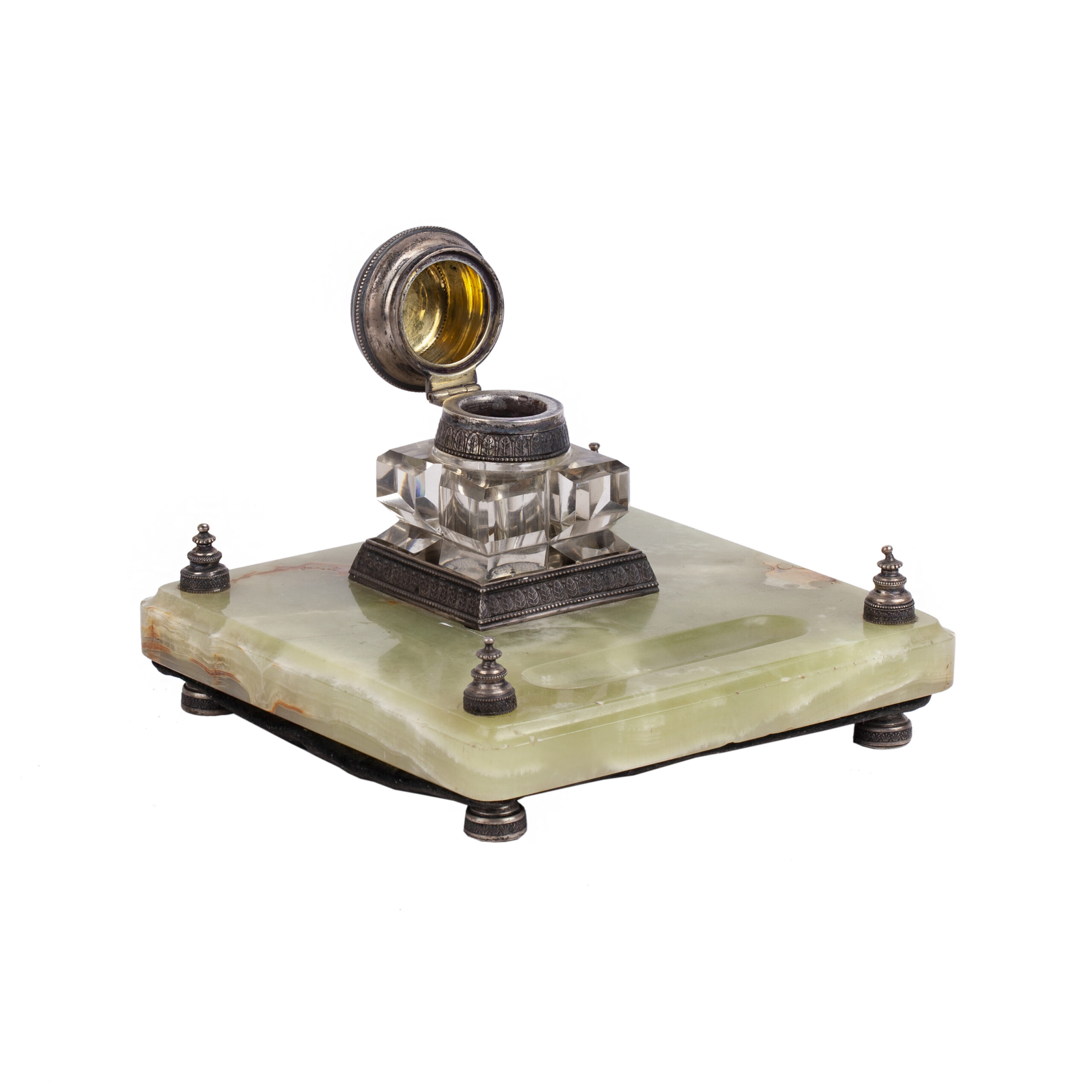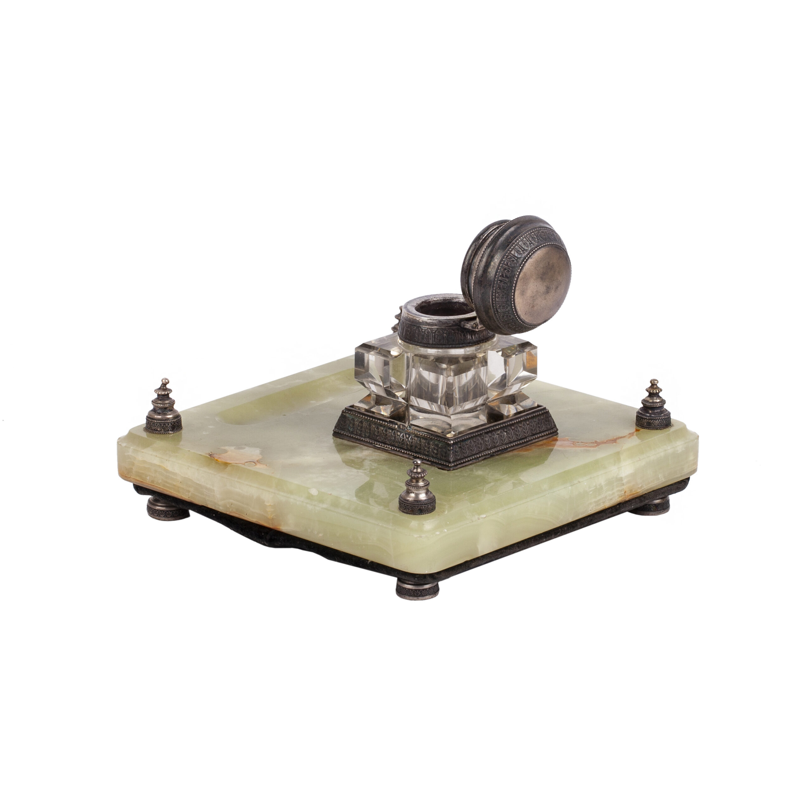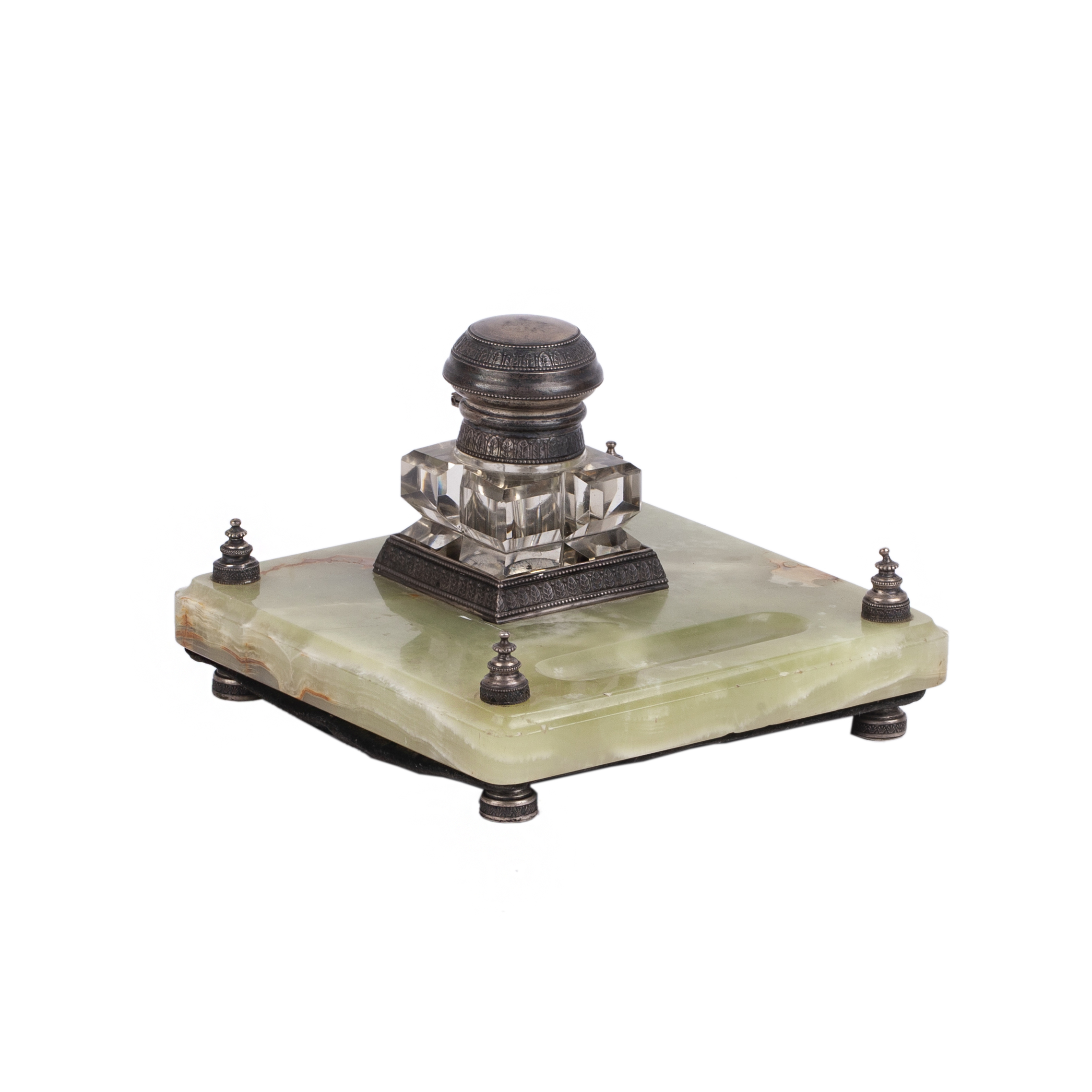 Dimensions: 12 x 16.3 x 16.3 cmA square inkwell composed of a carved onyx base with silver mounts and corner finials, supporting a faceted cut-crystal ink container with a silver hinged cover. The refined combination of hardstone, crystal, and precious metal reflects the luxurious character of Fabergé’s desk accessories, intended both for practical use and as symbols of status and taste. Julius Alexander Rappoport was one of the most important Fabergé workmasters in St. Petersburg. A trained silversmith of Jewish origin from Kovno (now Kaunas, Lithuania), he established his own workshop in the 1880s and soon entered into exclusive collaboration with the firm of Carl Fabergé.