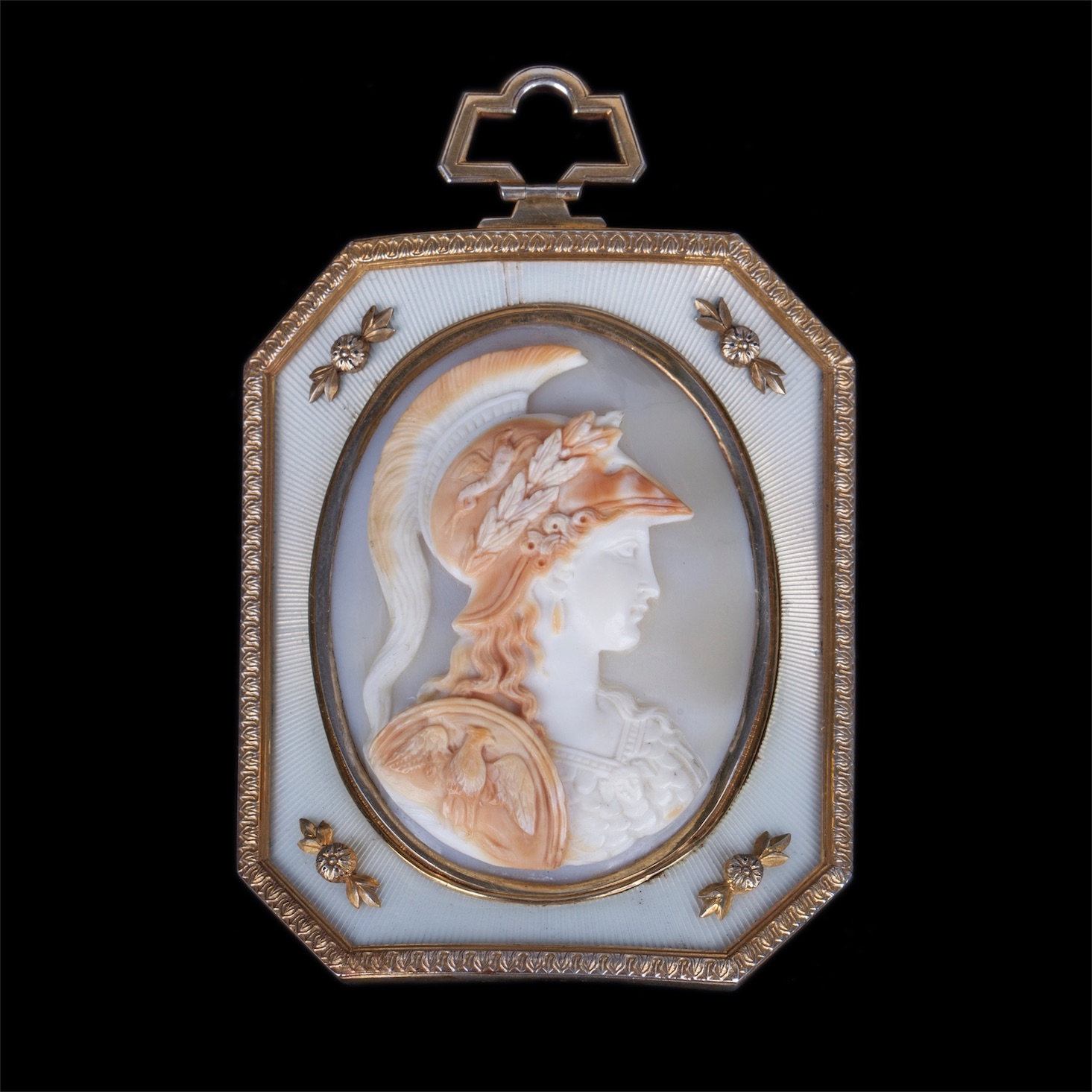 A highly rare Fabergé creation, this object unites a finely carved cameo of Minerva, goddess of wisdom and war, with an elegant silver-gilt easel mount enriched with translucent guilloché enamel. Designed by the firm’s chief workmaster Henrik Wigström, the piece exemplifies Fabergé’s ability to combine classical imagery with refined decorative settings. Comparable examples are known only from the most distinguished collections, including a related work sold at Christie’s (A Selection of Fabergé Masterpieces from the Harry Woolf Collection, 9 November 2021, lot 32 SOLD GBP 137,500). Henrik Wigström is regarded as one of the most important workmasters of the House of Fabergé, alongside his predecessor Michael Perkhin. Born in Finland, Wigström began his training as an apprentice to the local jeweler and goldsmith Peter Madsen. Through Madsen’s professional connections in Russia, he moved to St. Petersburg in 1886, where he joined the Fabergé workshops as an assistant to Perkhin, the firm’s leading workmaster at the time. Following Perkhin’s death in 1903, Wigström succeeded him as head workmaster.Under his supervision, Fabergé’s workshops produced some of their most sophisticated creations in the Louis XVI and Neoclassical styles. He was highly prolific: approximately half of the Imperial Easter Eggs, as well as the majority of miniature hardstone animals, flowers, boxes, and cigarette cases made between 1904 and 1917, bear his mark “H.W.”