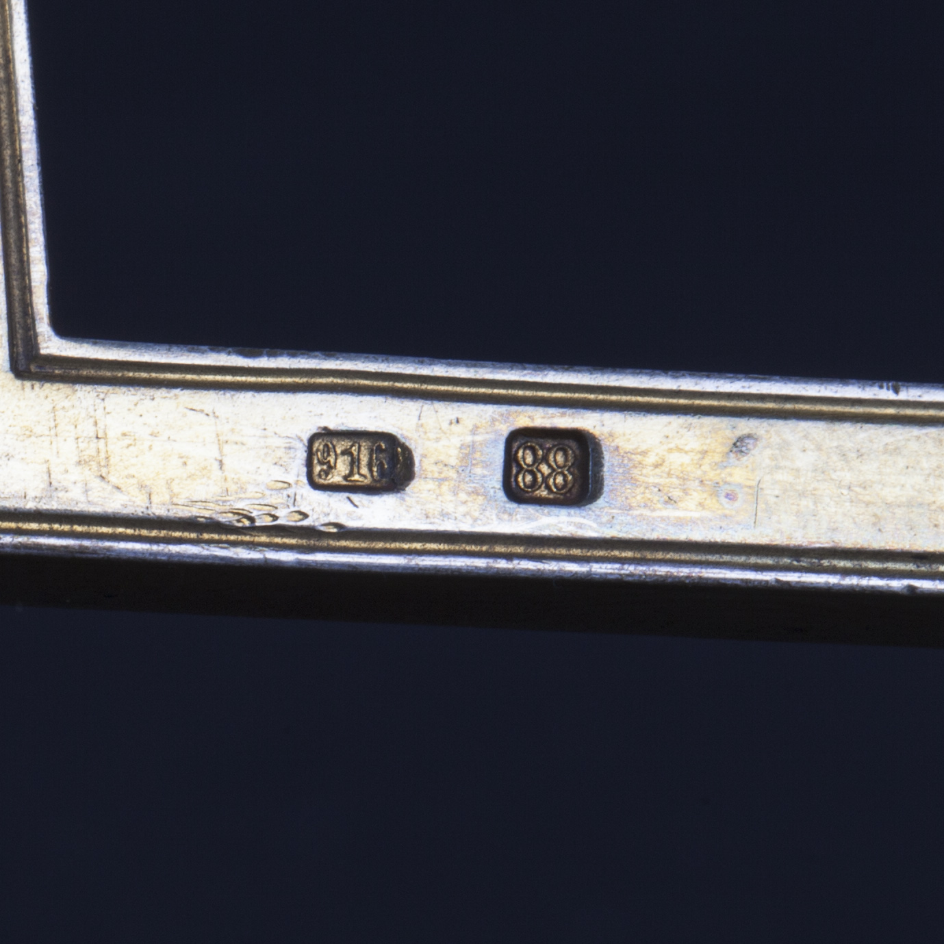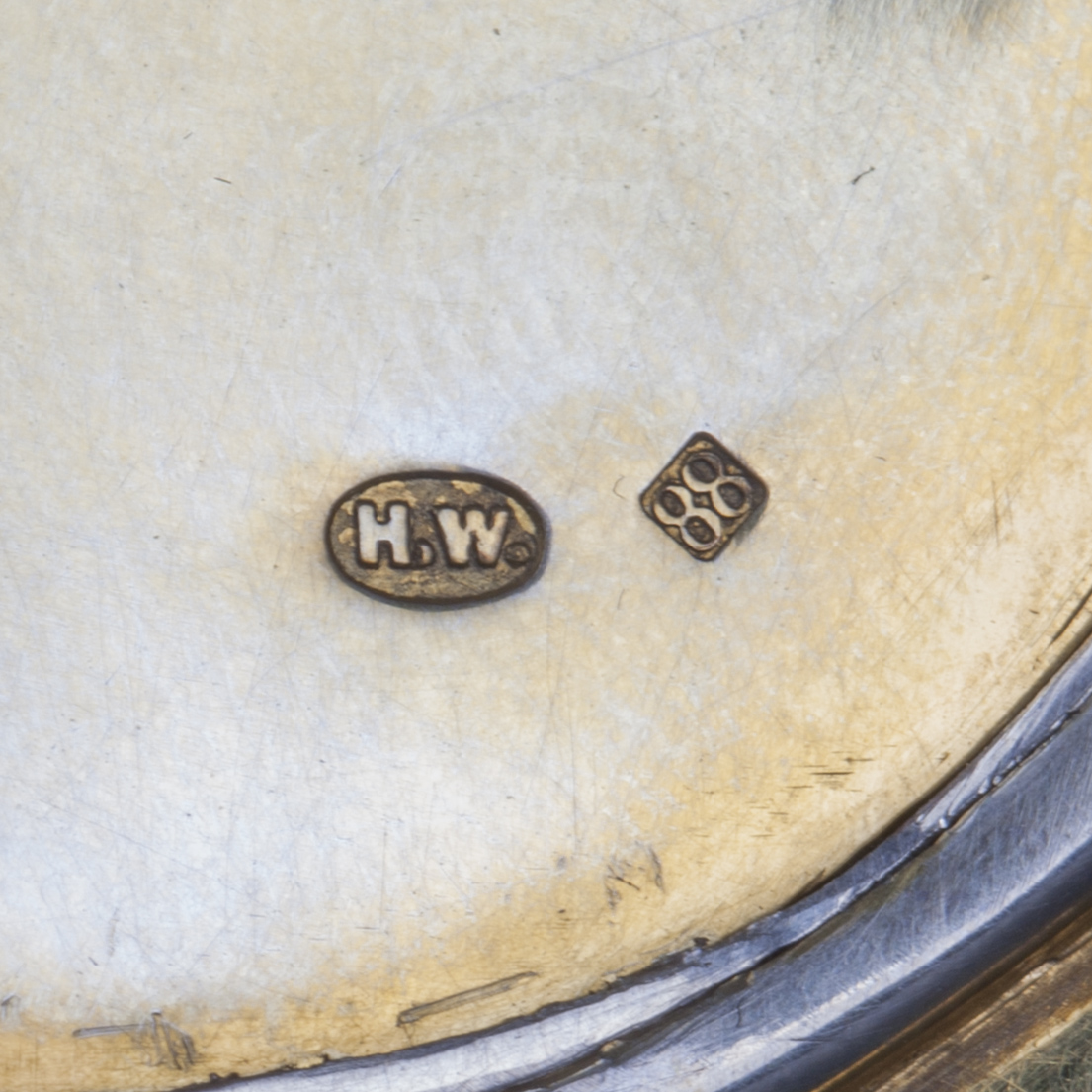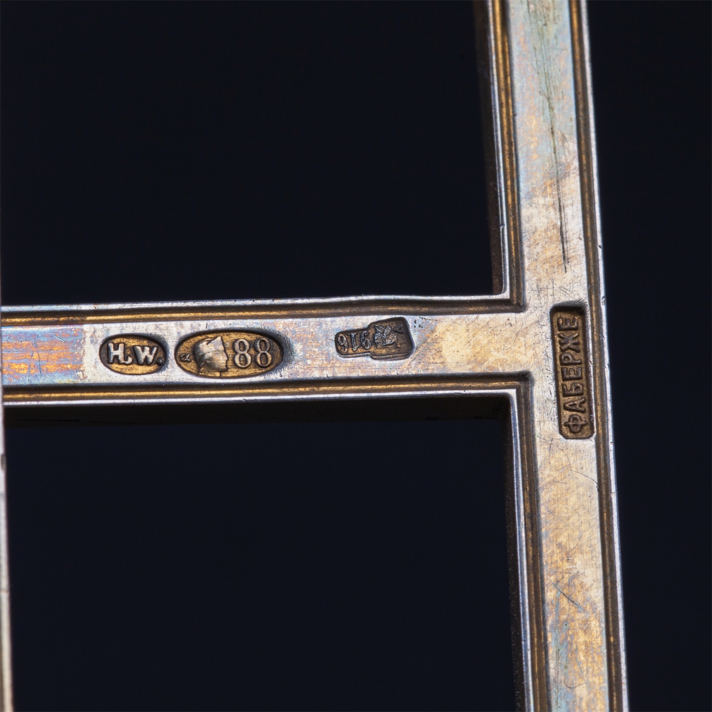 Marked on the underside with Fabergé and workmaster’s initials H.W. for Henrik Wigström, and St. Petersburg assay marks for 56 zolotniks (15ct gold) and 88 silver zolotnik.