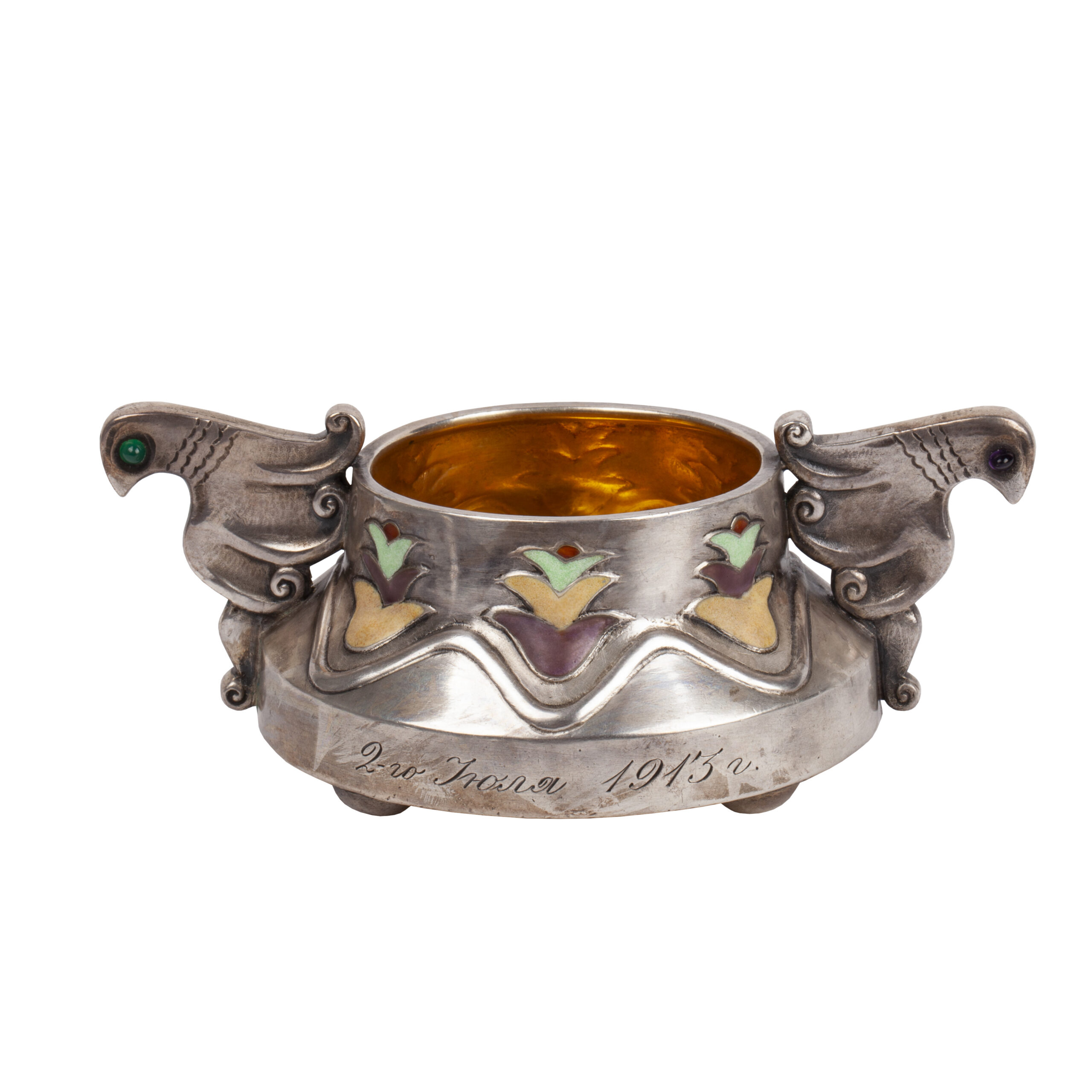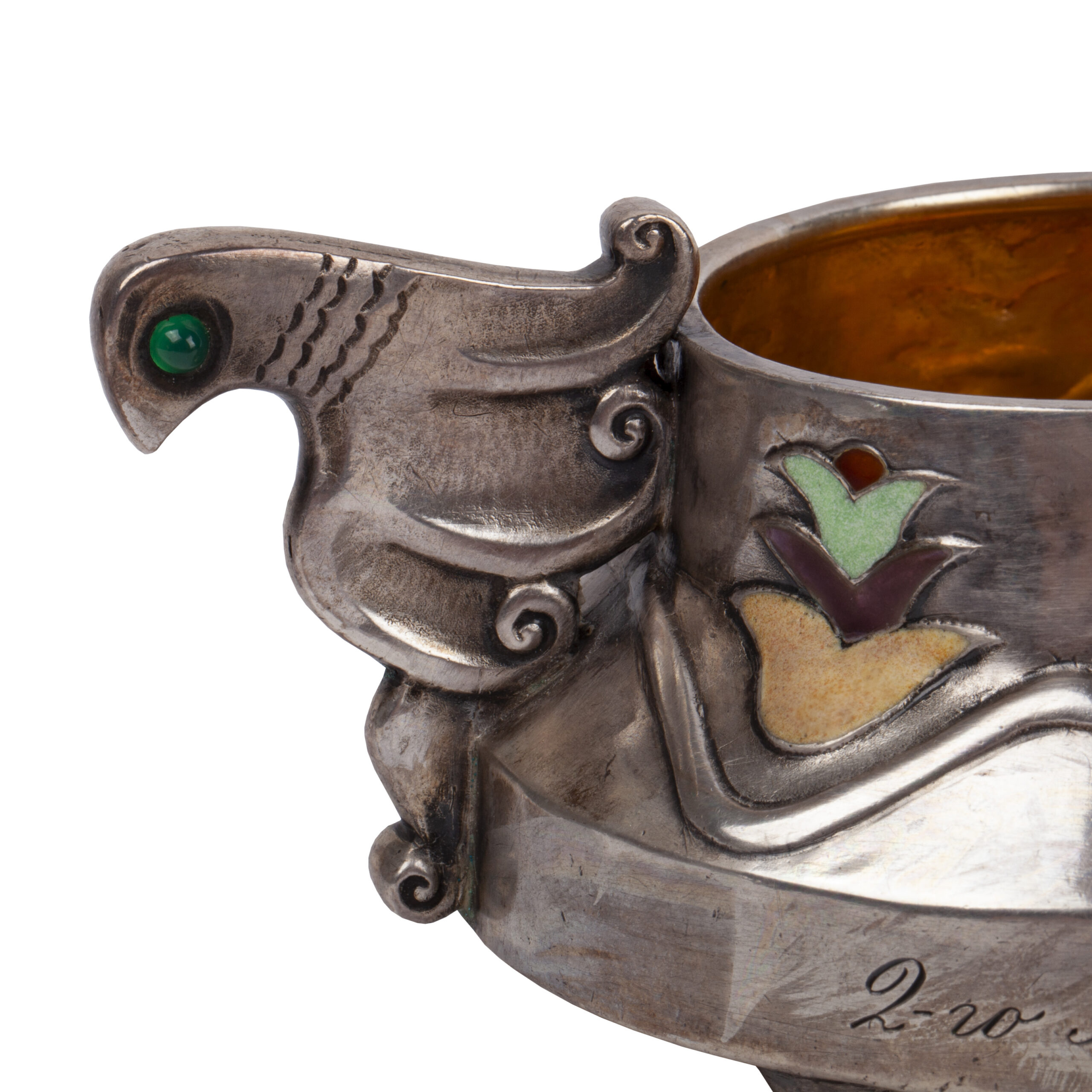 Silver beaker on four ball feet with polychrome opaque enamel decoration. This remarkable piece, created by the master jeweler Georgy (Egor) Kuzmich Cheryatov, embodies of Russian Art Nouveau style. With the bird-shaped handles with semi-precious cabochon stones incrustation.
