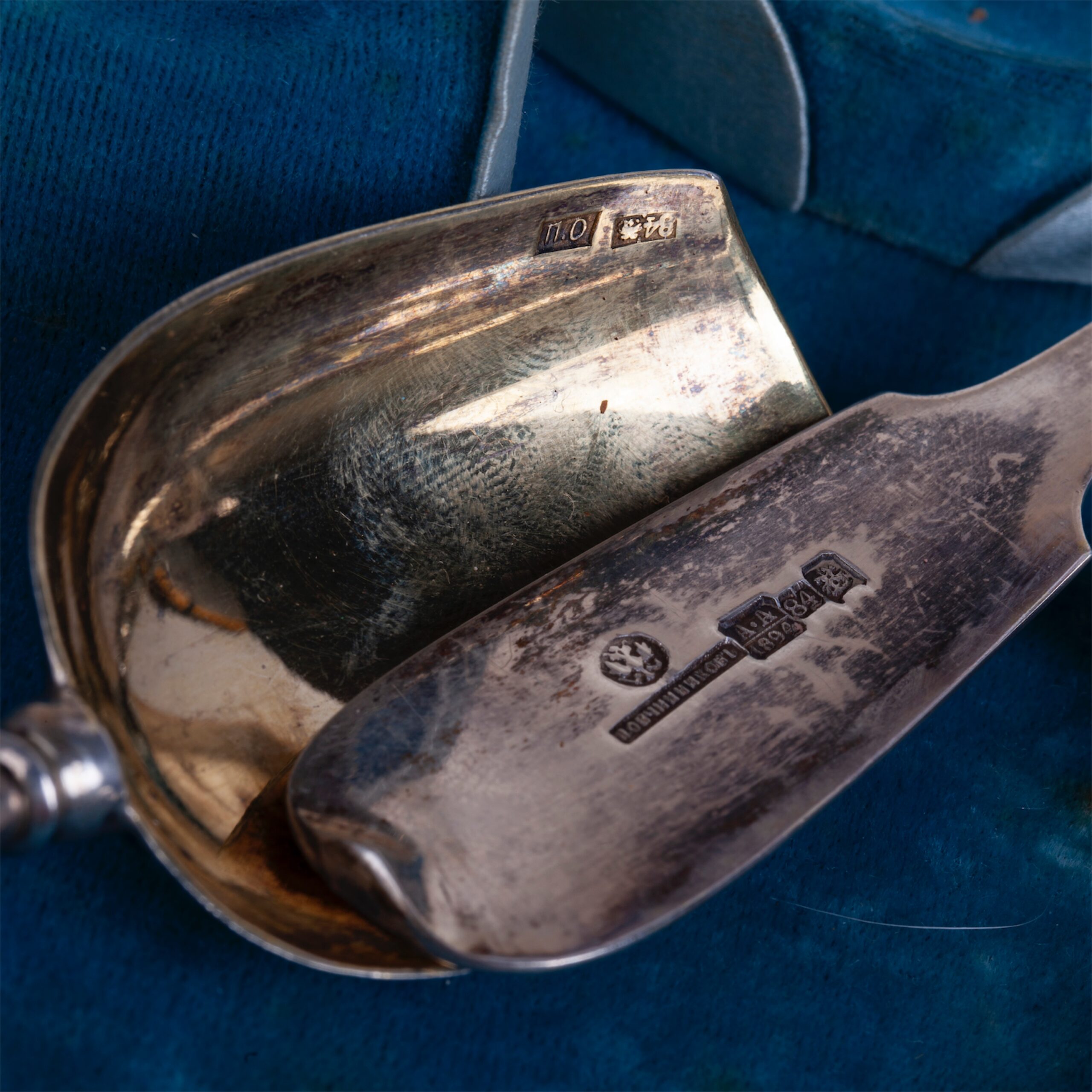 Dimensions of the box: 30.5 × 50.5 × 14 cmComprising a teapot, sugar bowl, cream jug, tea strainer, sugar tongs, and twelve spoons, all finely crafted in silver and preserved in the original velvet-lined wooden traveling case, the interior of the lid stamped in gilt with the Imperial double-headed eagle and the Cyrillic inscription Iz magazina fabrikanta P. Ovchinnikova (“From the shop of the manufacturer P. Ovchinnikov”).