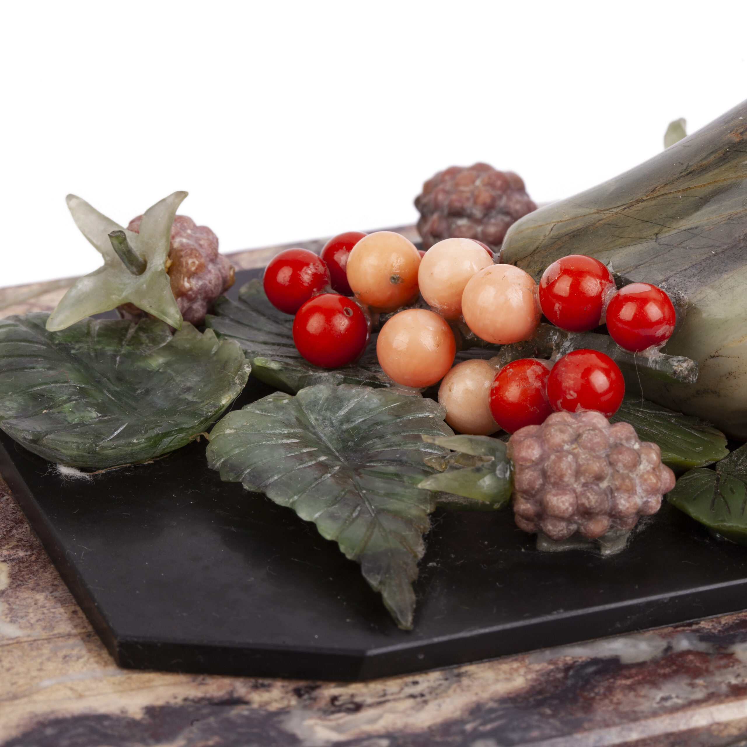 Dimensions: 11.5 x 18 x 7 cm.A naturalistic hardstone composition depicting a cluster of raspberries, currants, and cherries, carved from Ural gems including jasper, serpentine, rock crystal, carnelian, selenite, marble, and coral. The fruits and leaves are mounted on a tiered dark stone base.