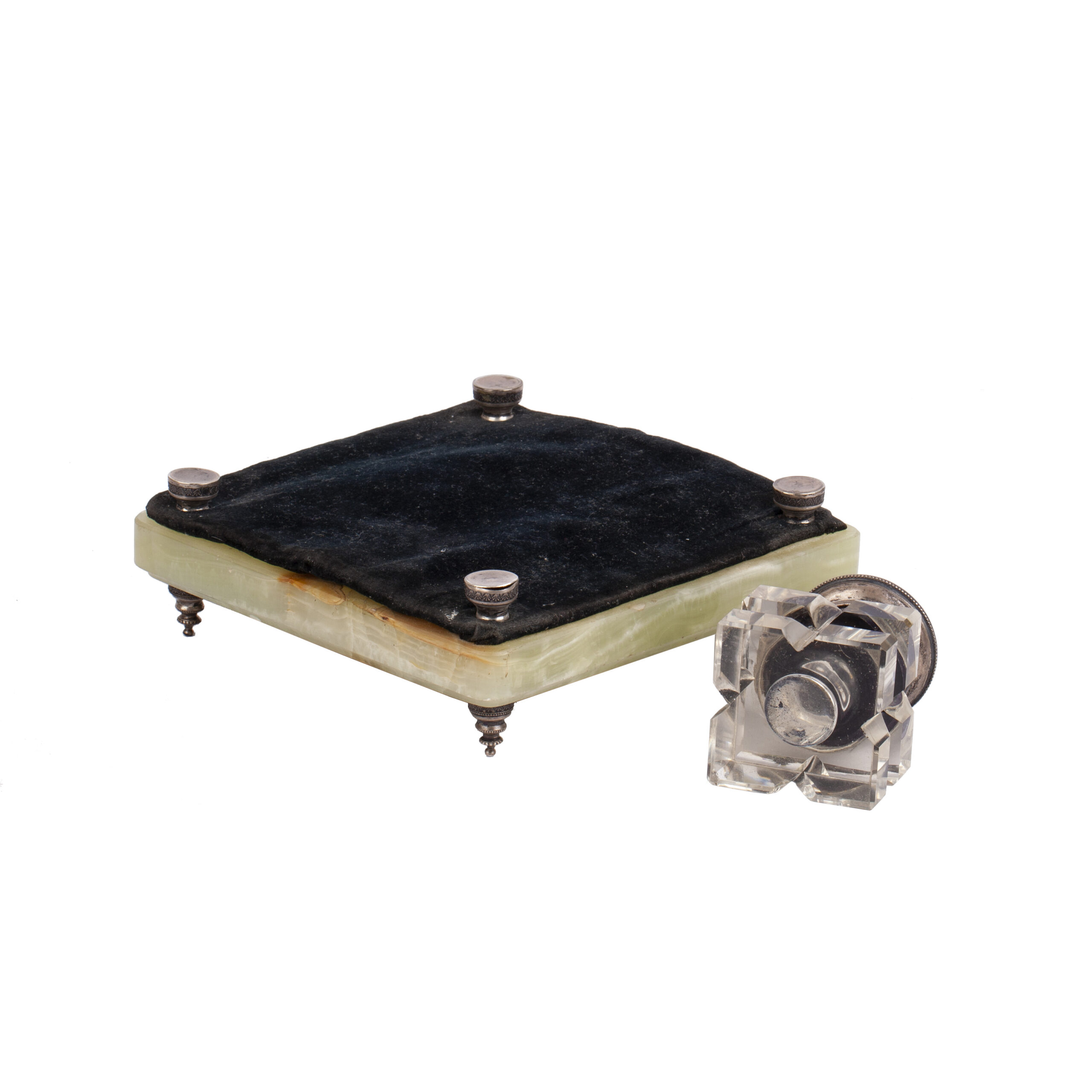 Dimensions: 12 x 16.3 x 16.3 cmA square inkwell composed of a carved onyx base with silver mounts and corner finials, supporting a faceted cut-crystal ink container with a silver hinged cover. The refined combination of hardstone, crystal, and precious metal reflects the luxurious character of Fabergé’s desk accessories, intended both for practical use and as symbols of status and taste. Julius Alexander Rappoport was one of the most important Fabergé workmasters in St. Petersburg. A trained silversmith of Jewish origin from Kovno (now Kaunas, Lithuania), he established his own workshop in the 1880s and soon entered into exclusive collaboration with the firm of Carl Fabergé.