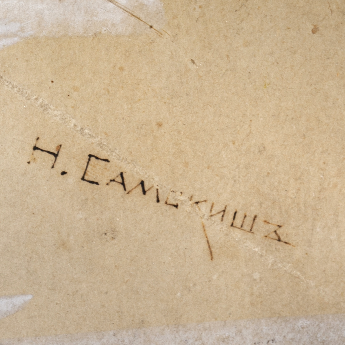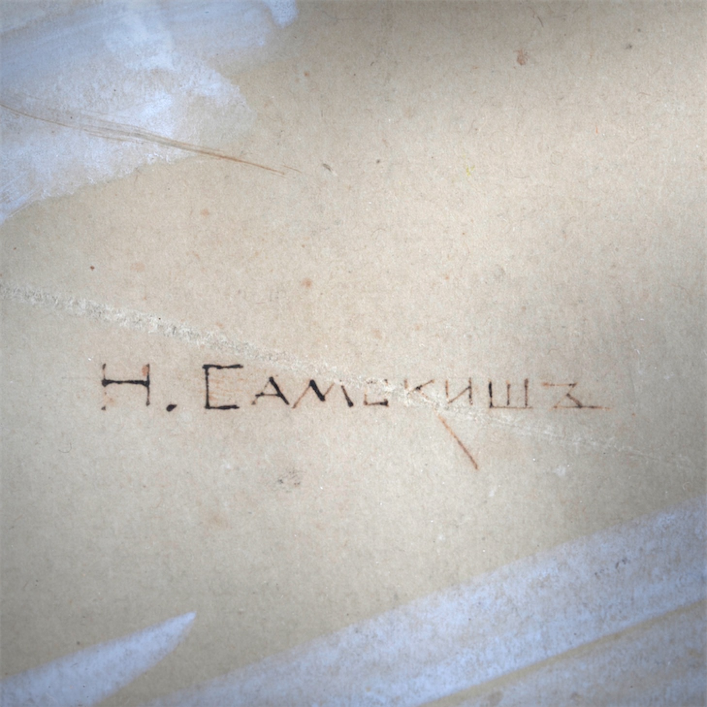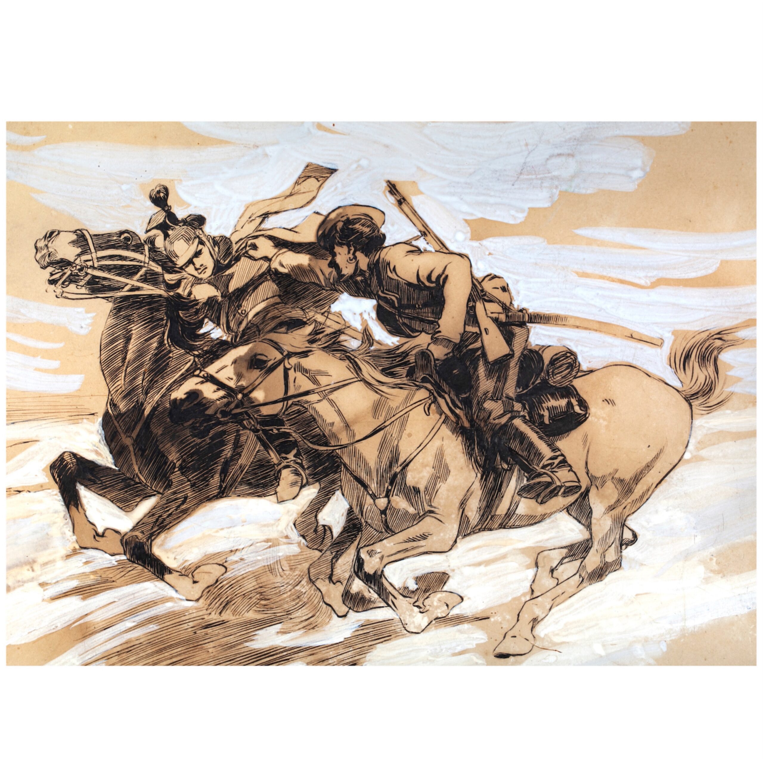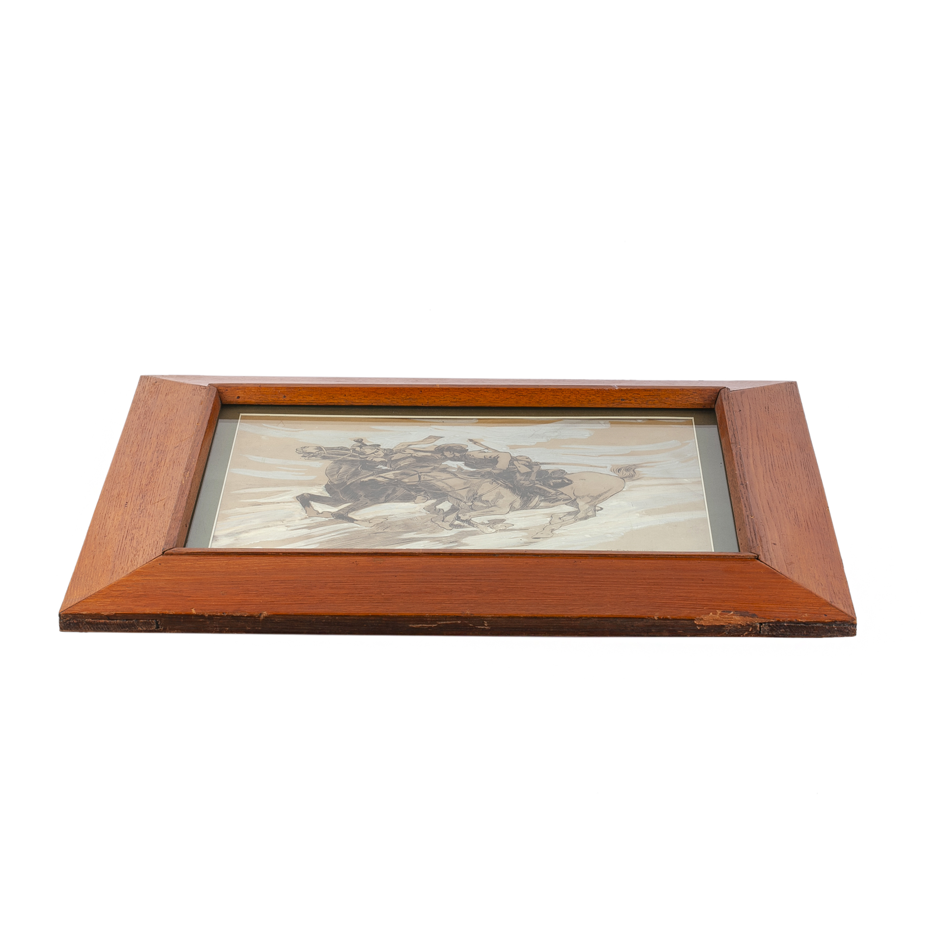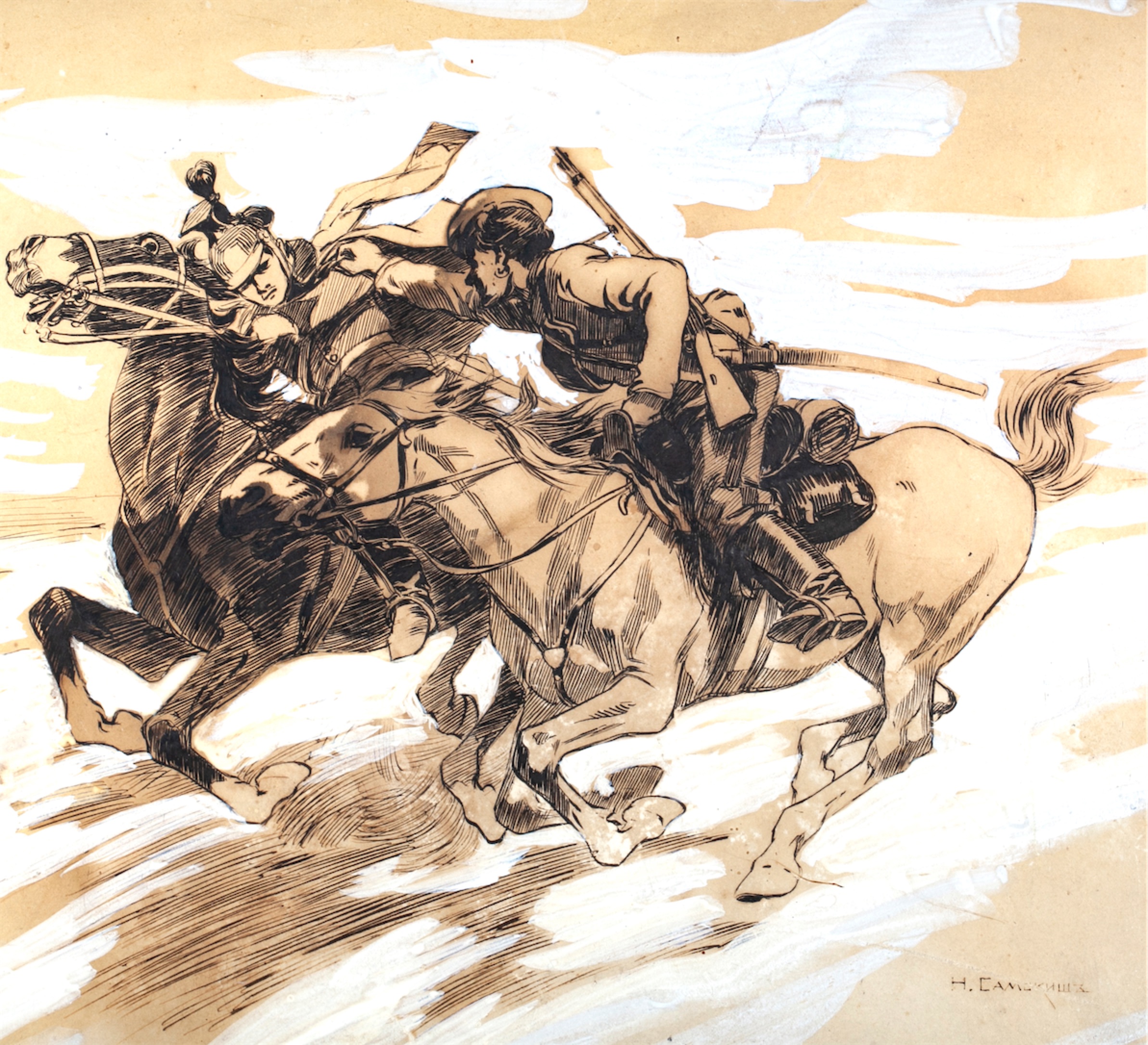 Estimate: 1800-2500€Battle scene from the First World War (1914-1918). Mixed technique. The signature on the background: “The work of Academician N. S. Samokish-professor of battle painting of the Academy of Arts.” Artist: Nikolai Semyonovich Samokish, a Russian and Soviet battle painter, teacher, animalist, and book graphic artist. Academician of Painting and a full member of the Imperial Academy of Arts, Honored Artist of the RSFSR, and recipient of the Stalin Prize (second degree). Dimensions with a frame: 43 x 53 cm.