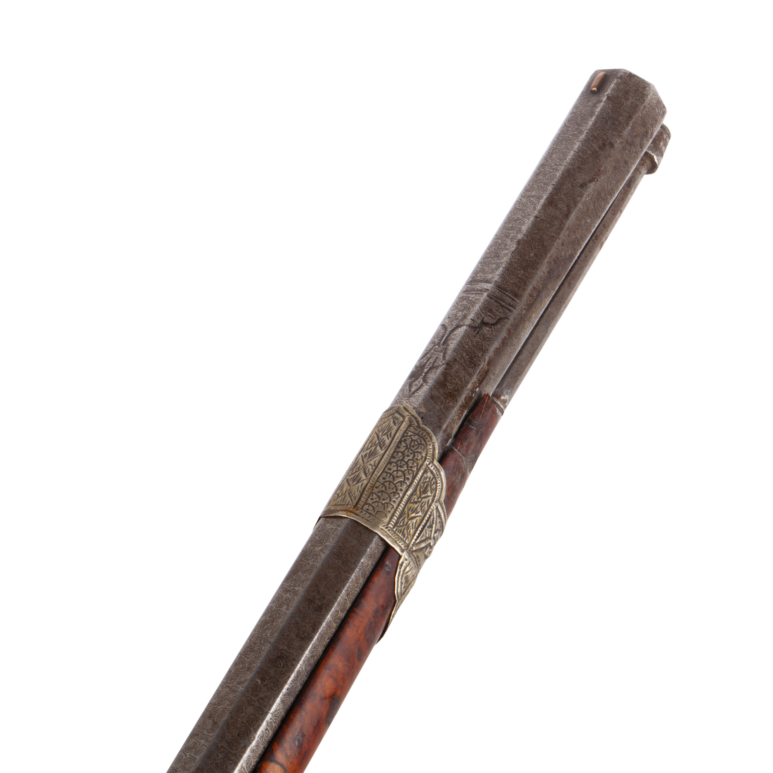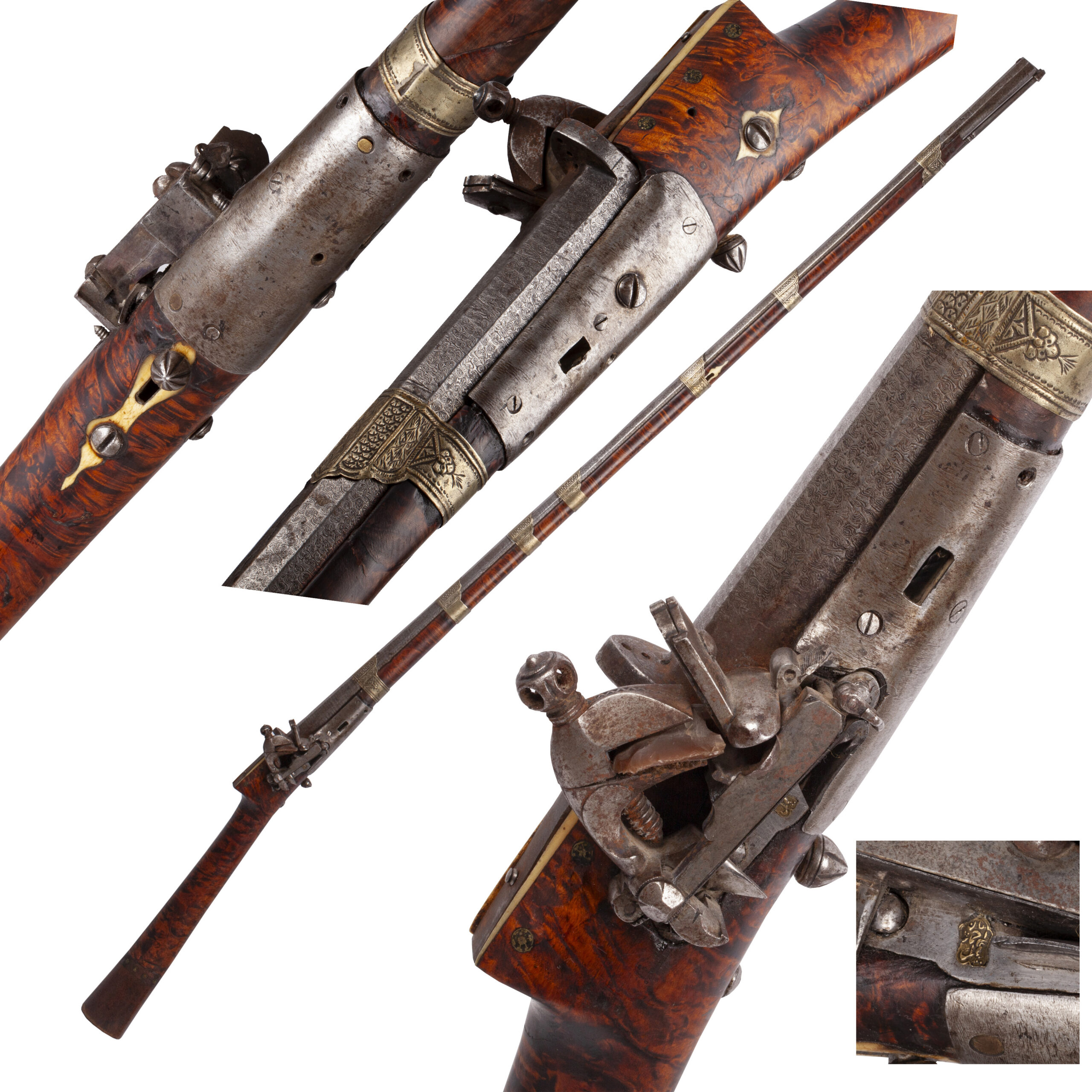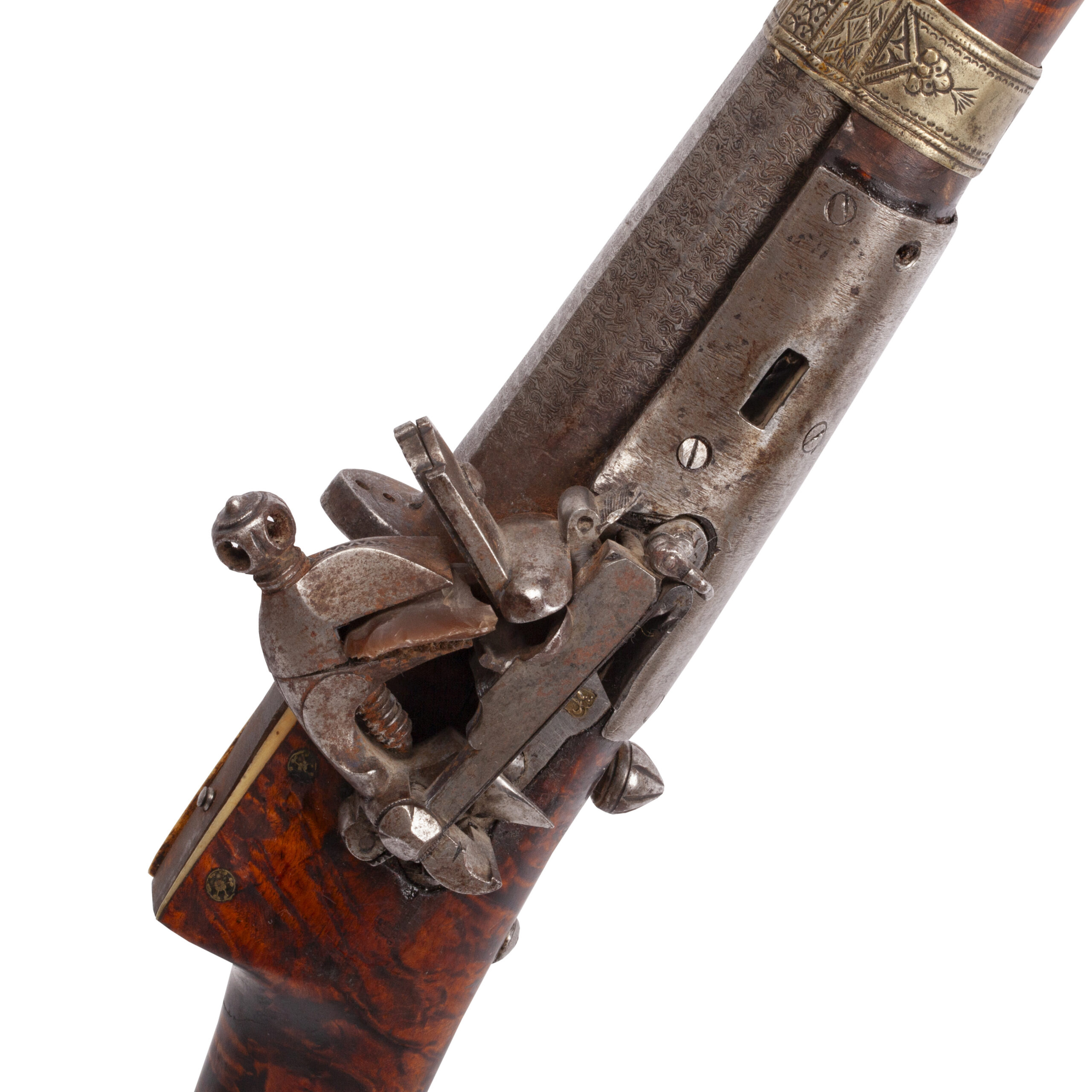 The ferrules (muzzle bands) are crafted from a white metal, intricately chiseled and ornamented with repoussé decoration, typical of high-status weapons from the region.The lock plate bears a maker’s mark inscribed in Arabic, further emphasizing the piece’s regional and cultural authenticity.