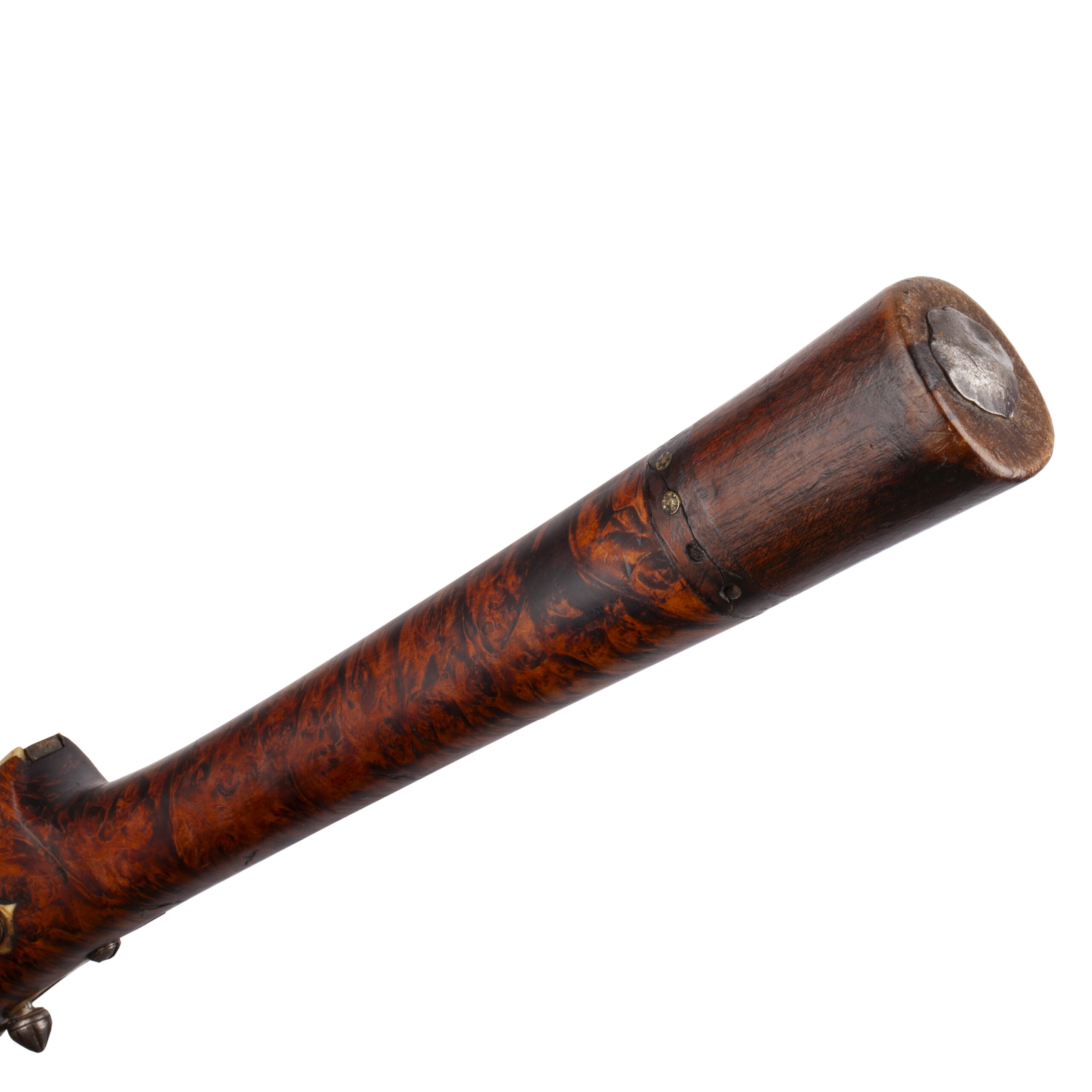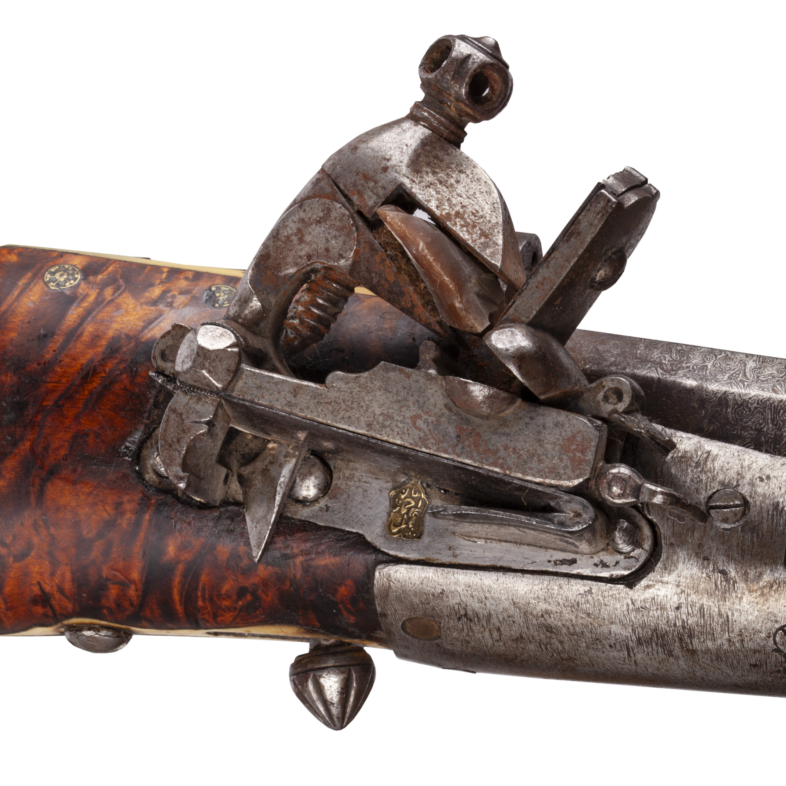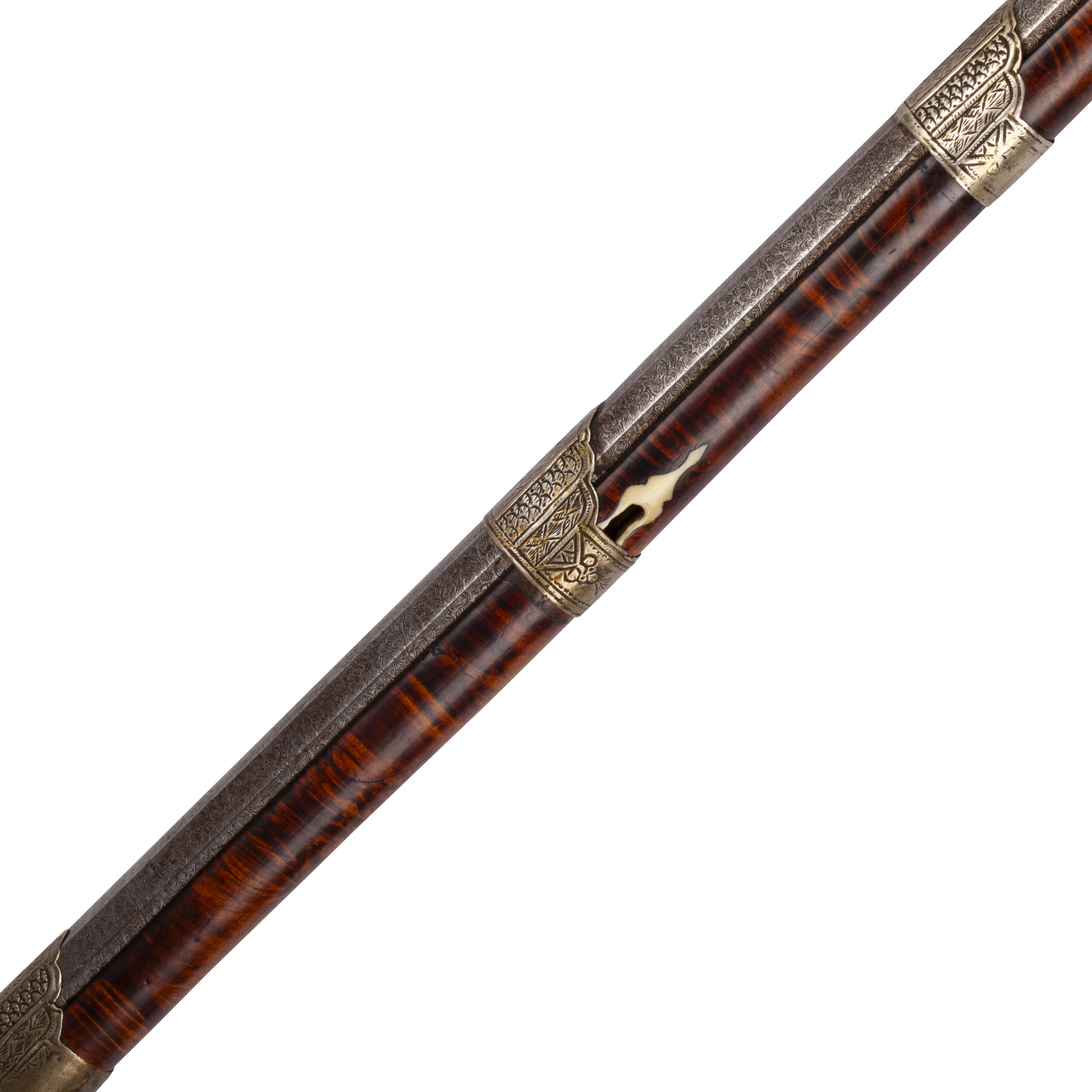 The ferrules (muzzle bands) are crafted from a white metal, intricately chiseled and ornamented with repoussé decoration, typical of high-status weapons from the region.The lock plate bears a maker’s mark inscribed in Arabic, further emphasizing the piece’s regional and cultural authenticity.