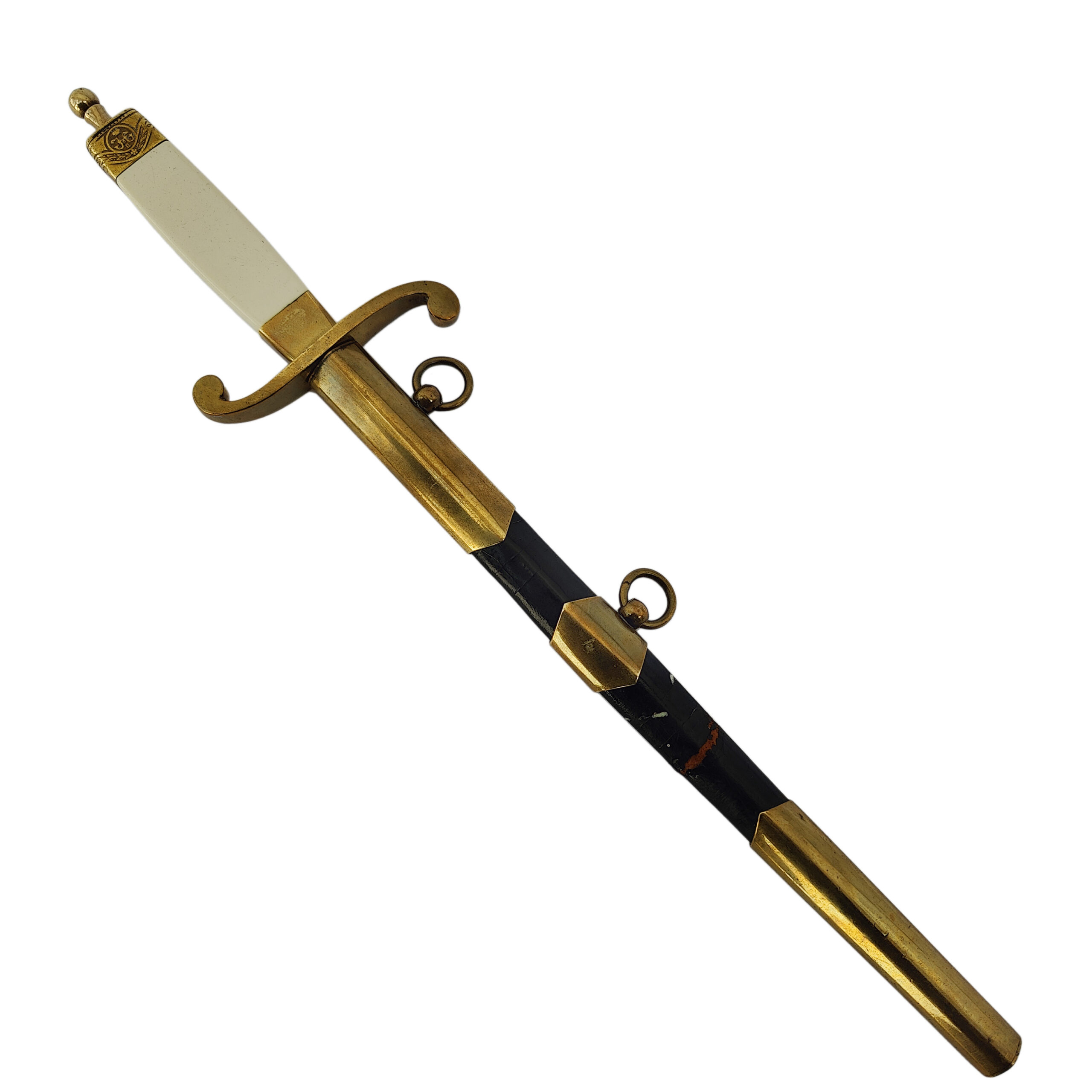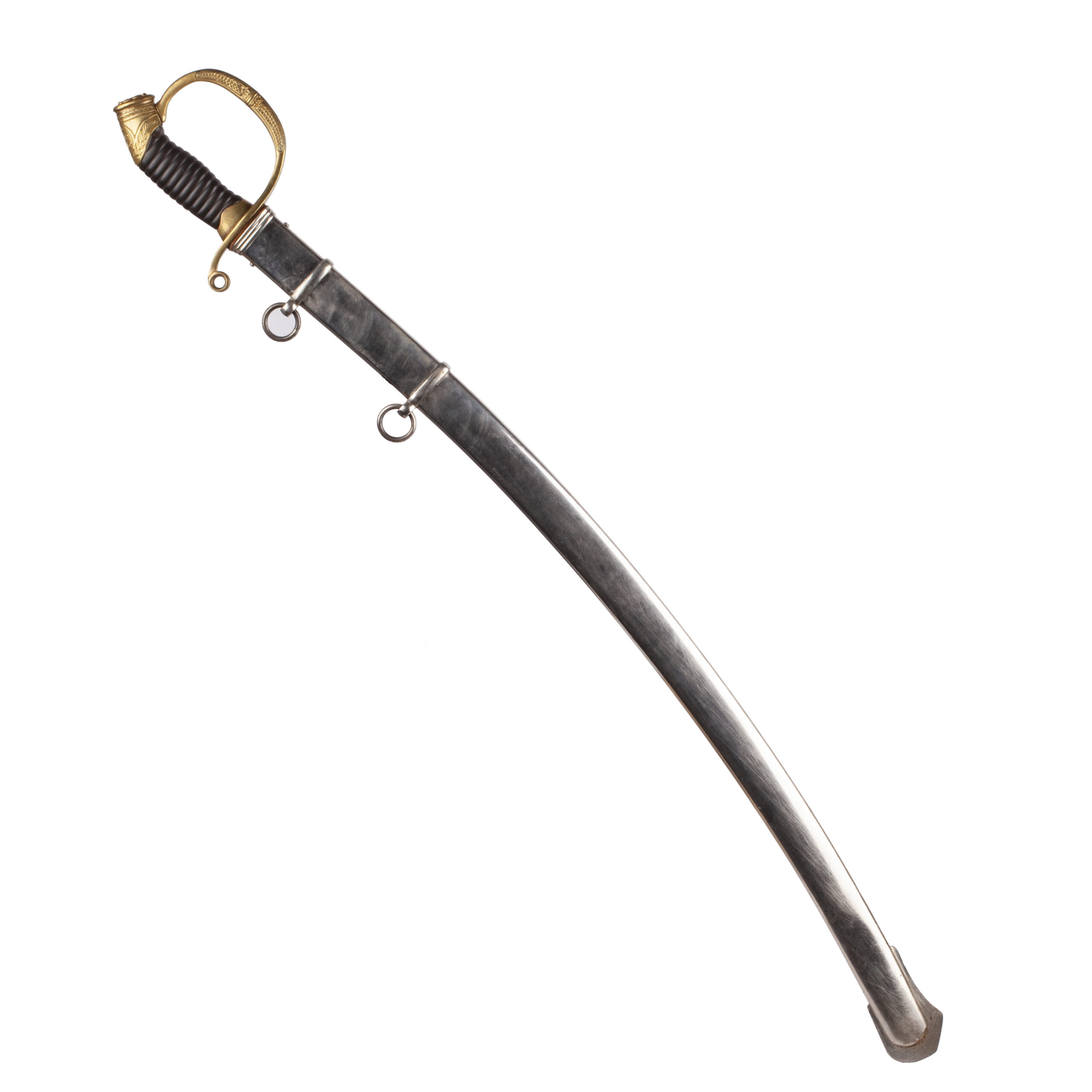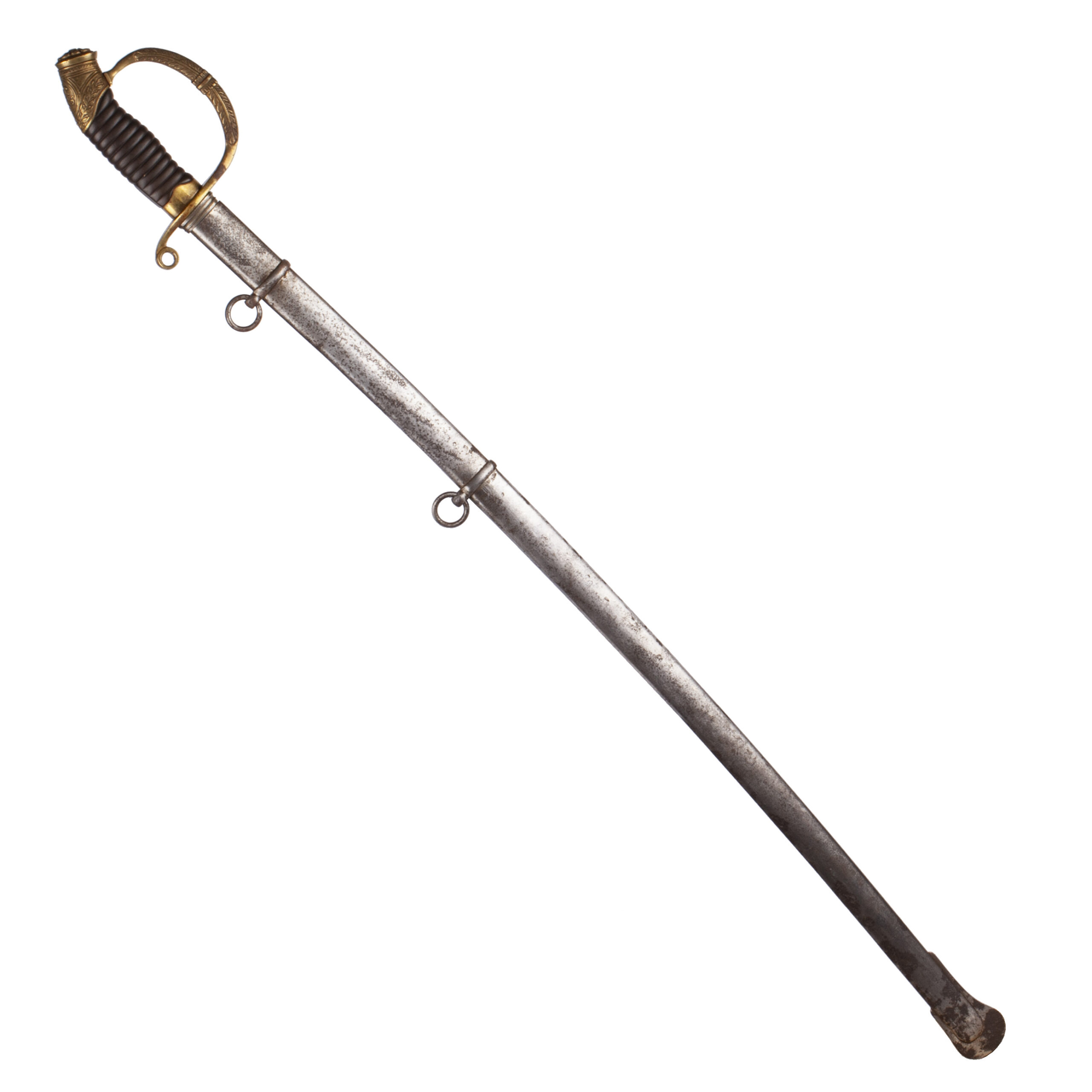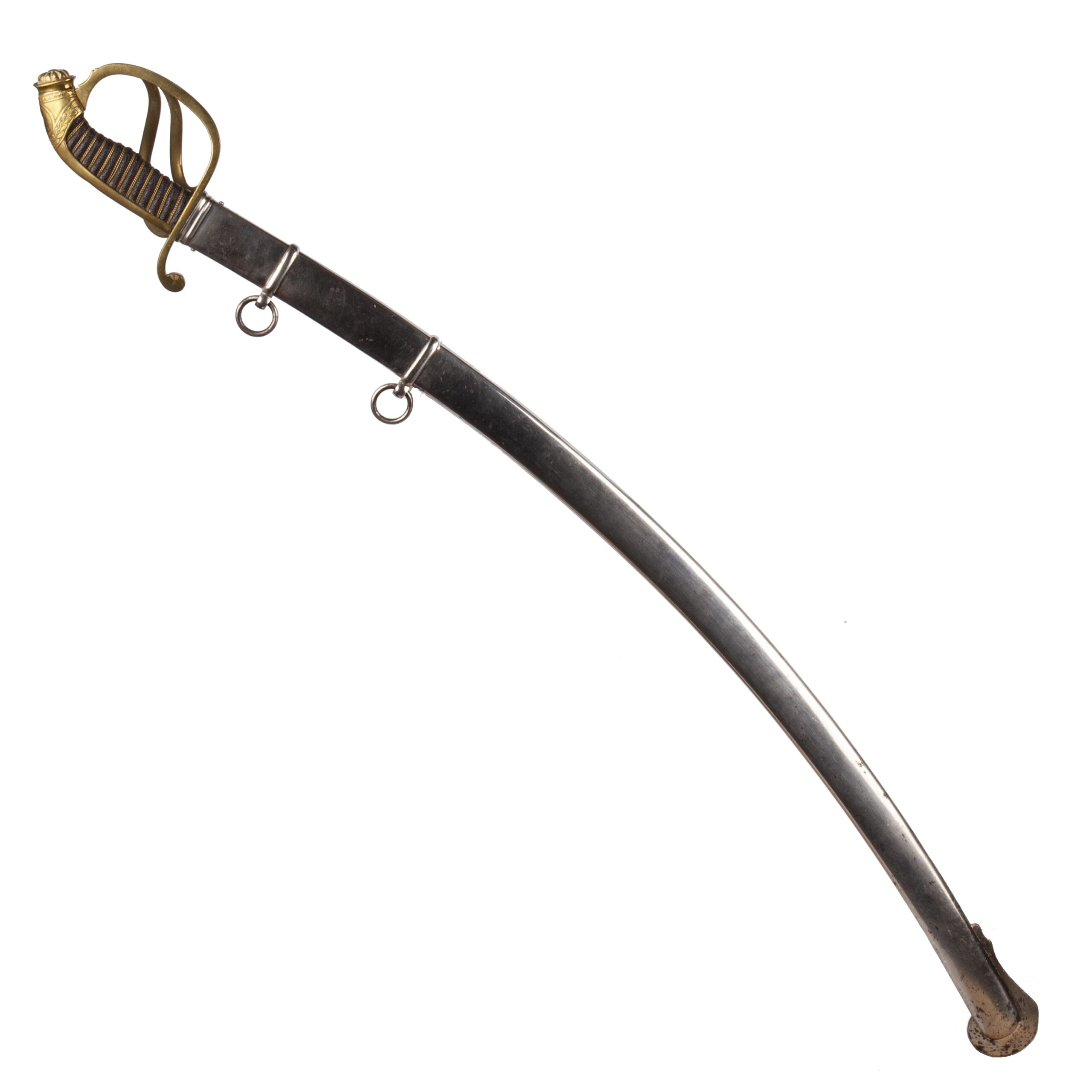 The sword retains its black-lacquered metal scabbard with gilt brass fittings and two suspension rings, showing only light wear.