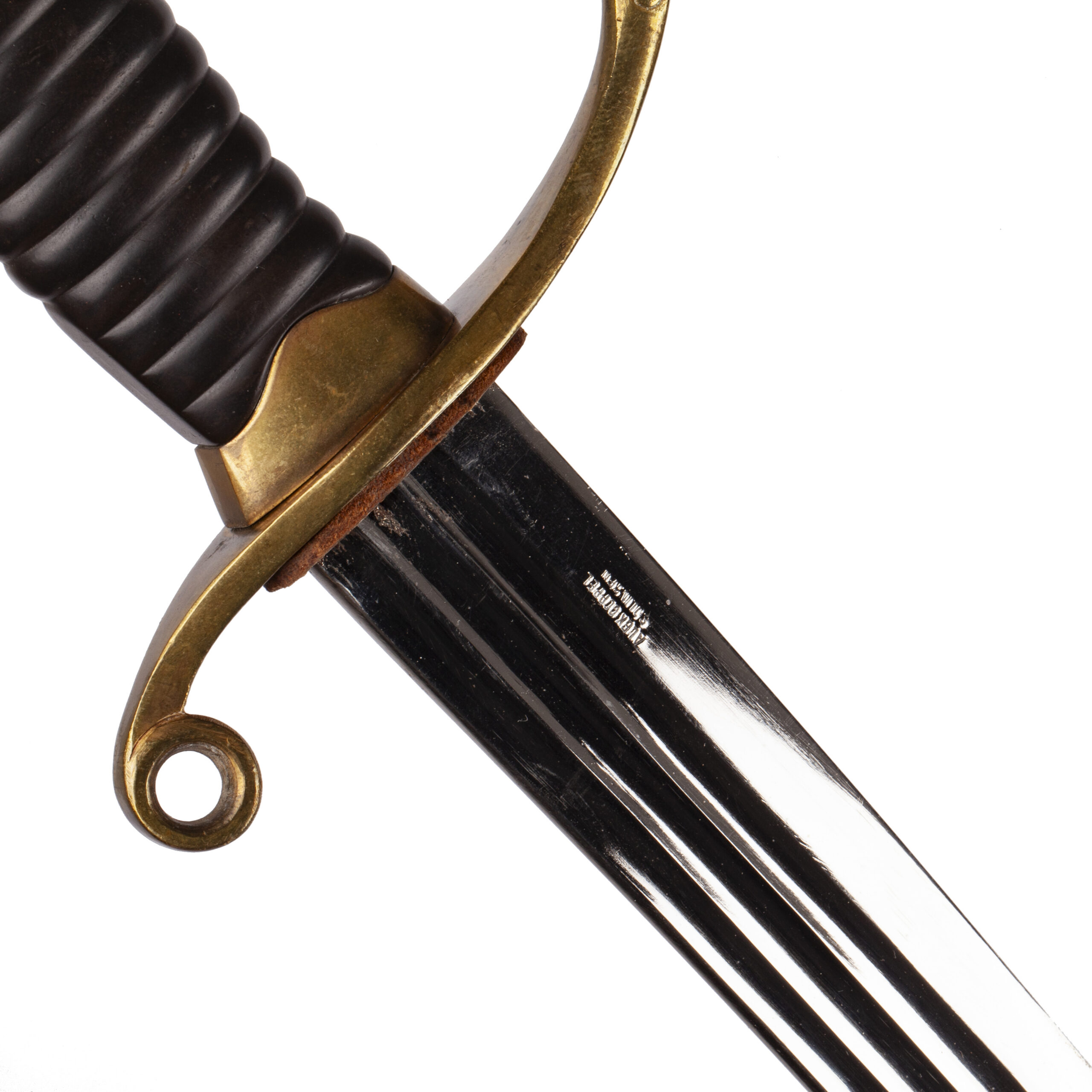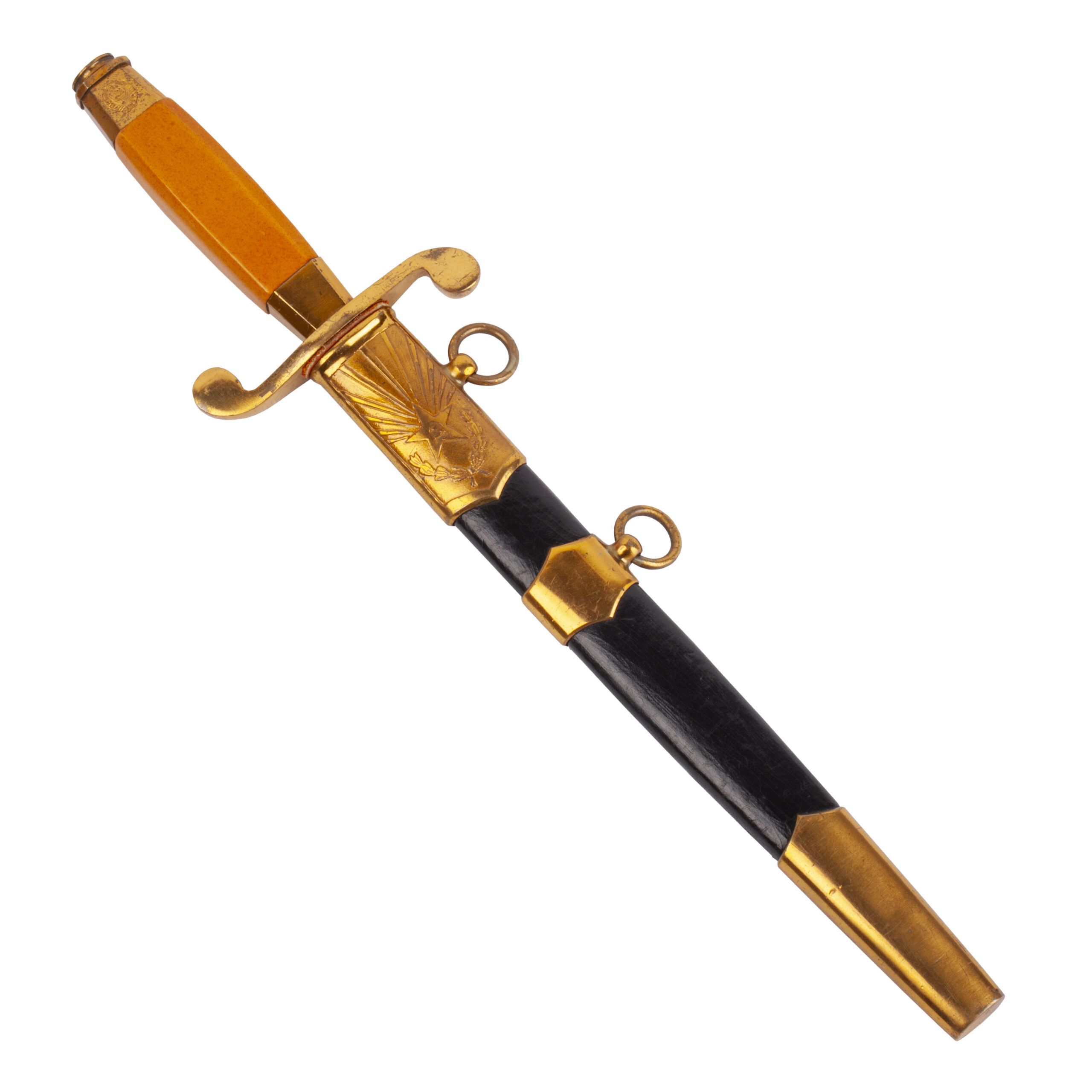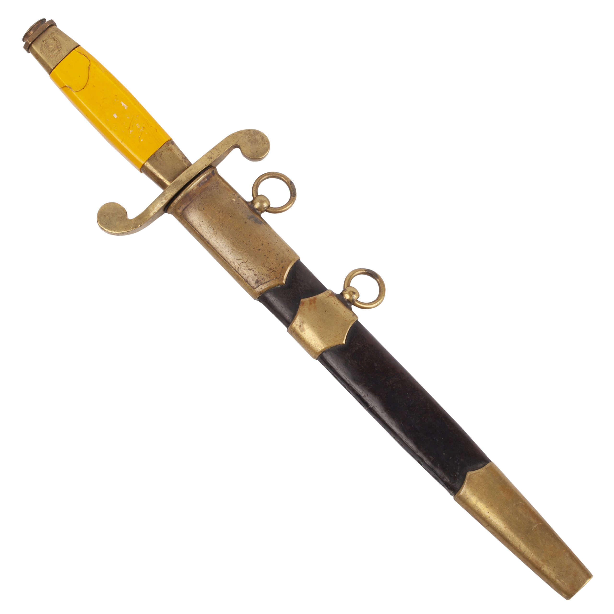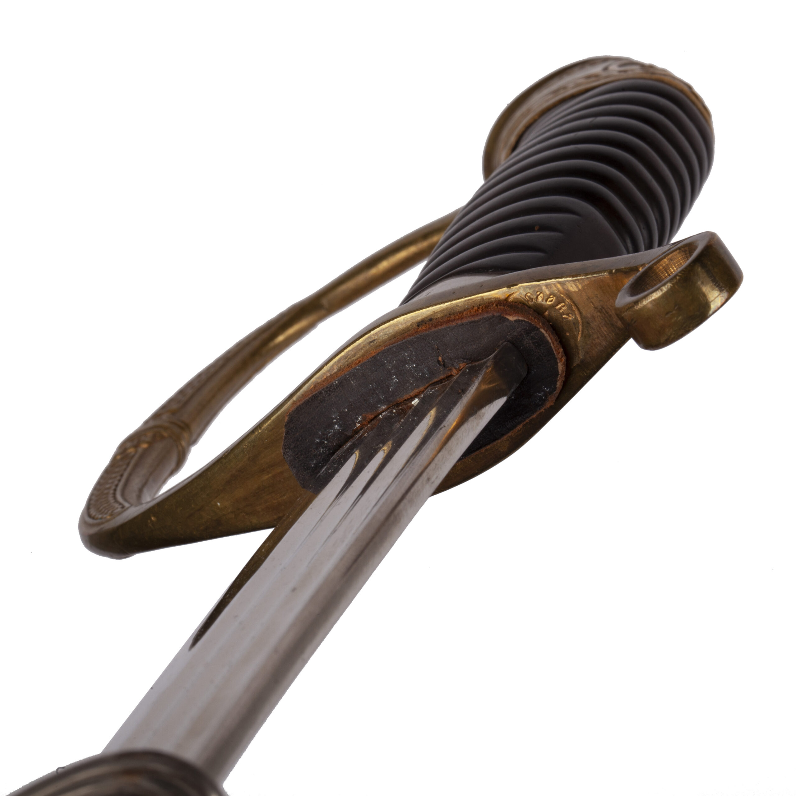 The sword retains its black-lacquered metal scabbard with gilt brass fittings and two suspension rings, showing only light wear.