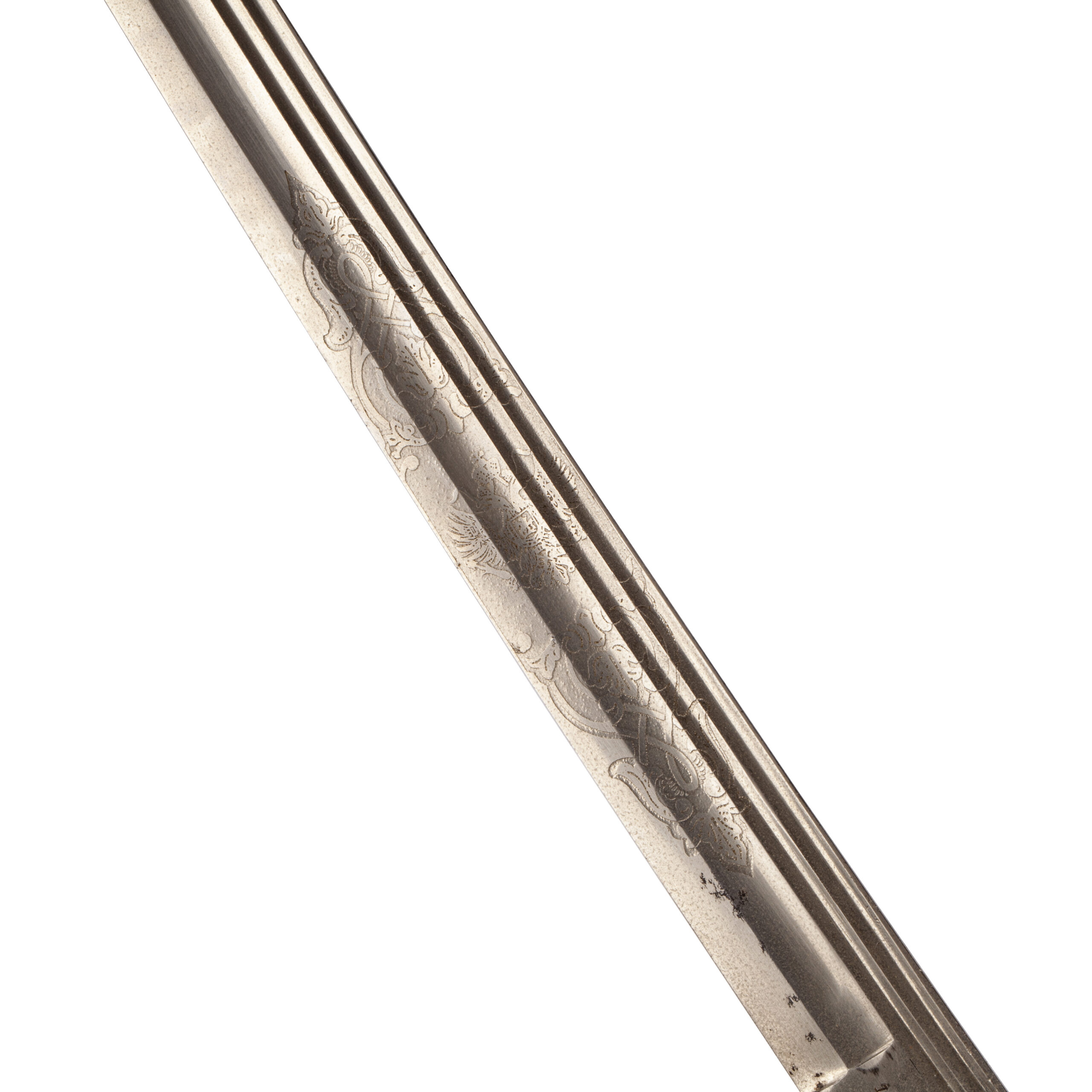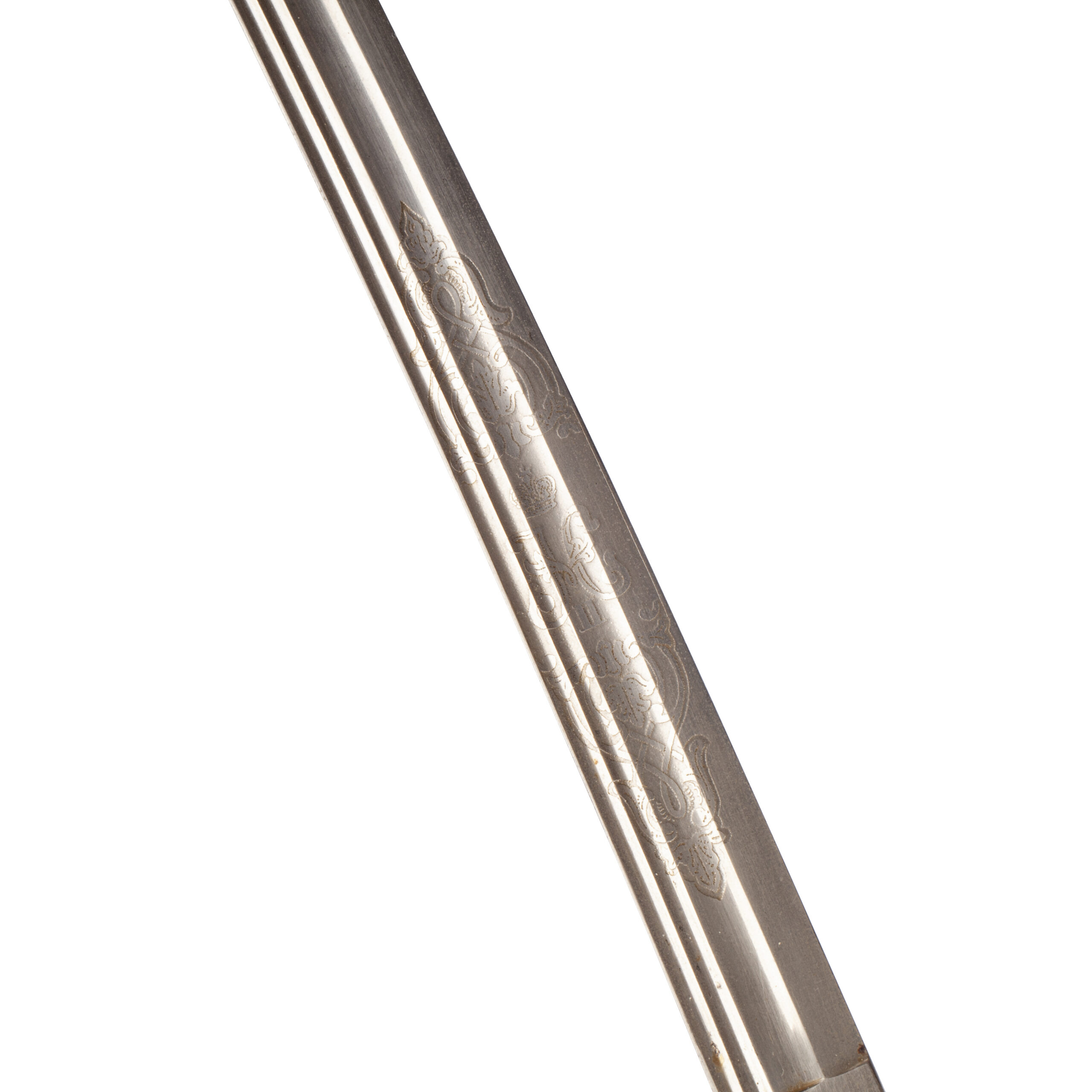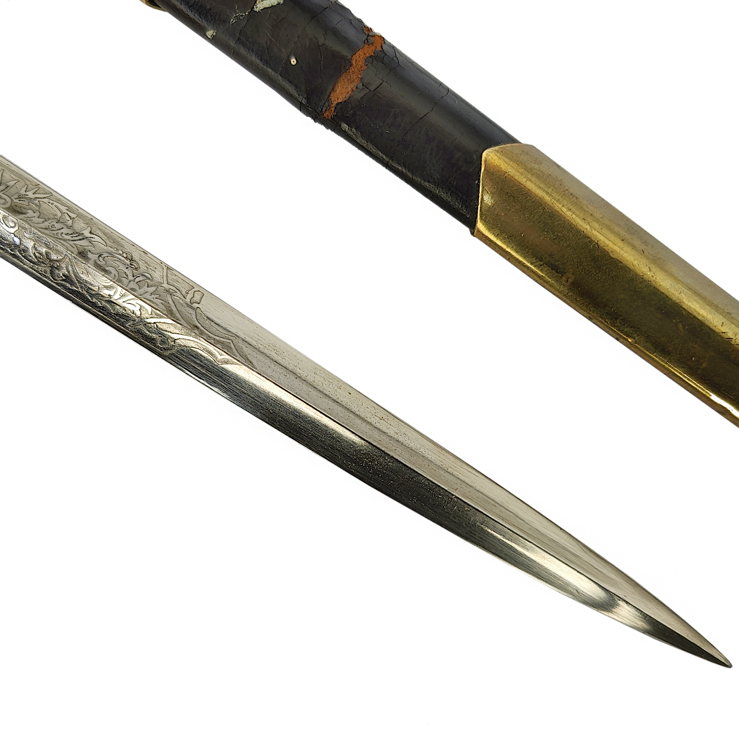 The single-edged blade features a central fuller and remains decorated with etched floral and geometric ornamentation, partly preserved despite visible age patina. The decorative etching reflects the characteristic artistic motifs of late Imperial Russia.