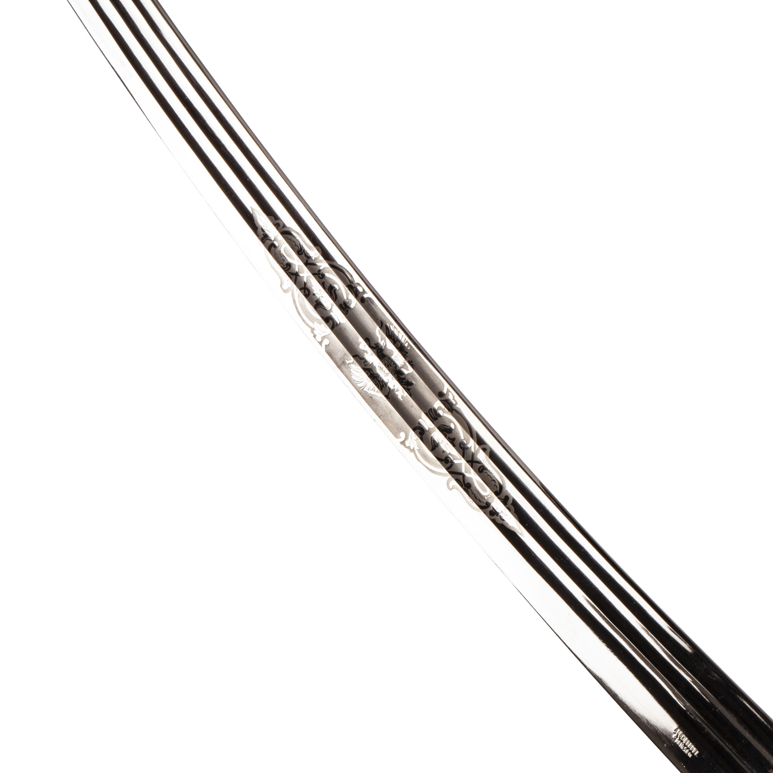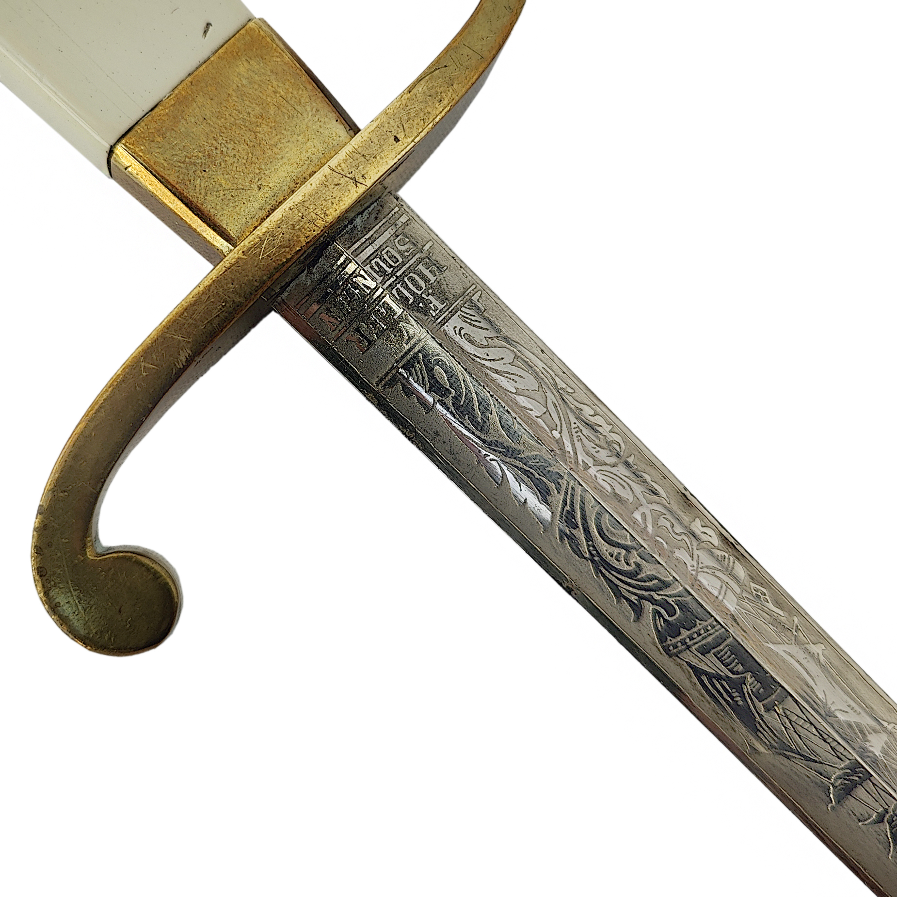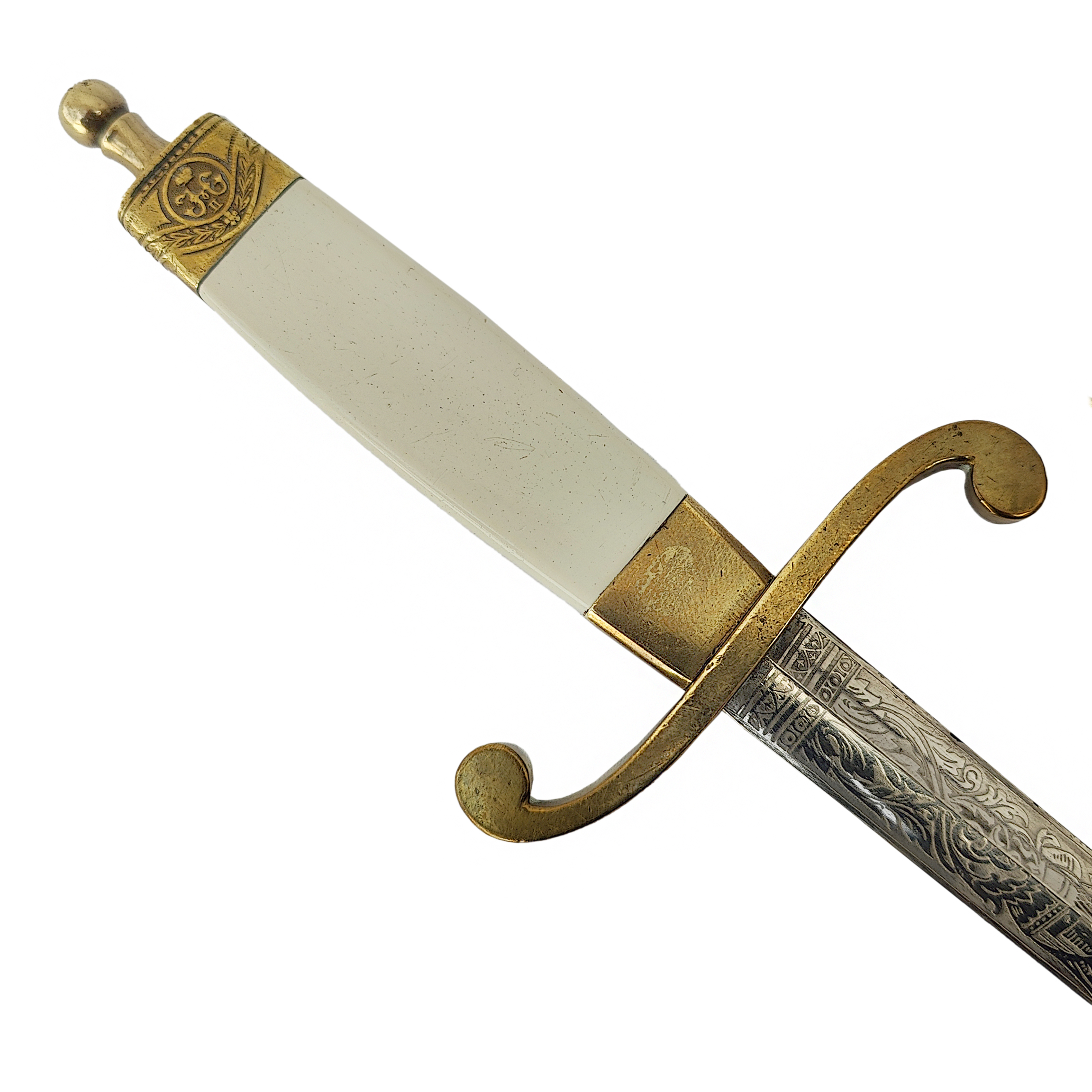 The single-edged blade features a central fuller and remains decorated with etched floral and geometric ornamentation, partly preserved despite visible age patina. The decorative etching reflects the characteristic artistic motifs of late Imperial Russia.