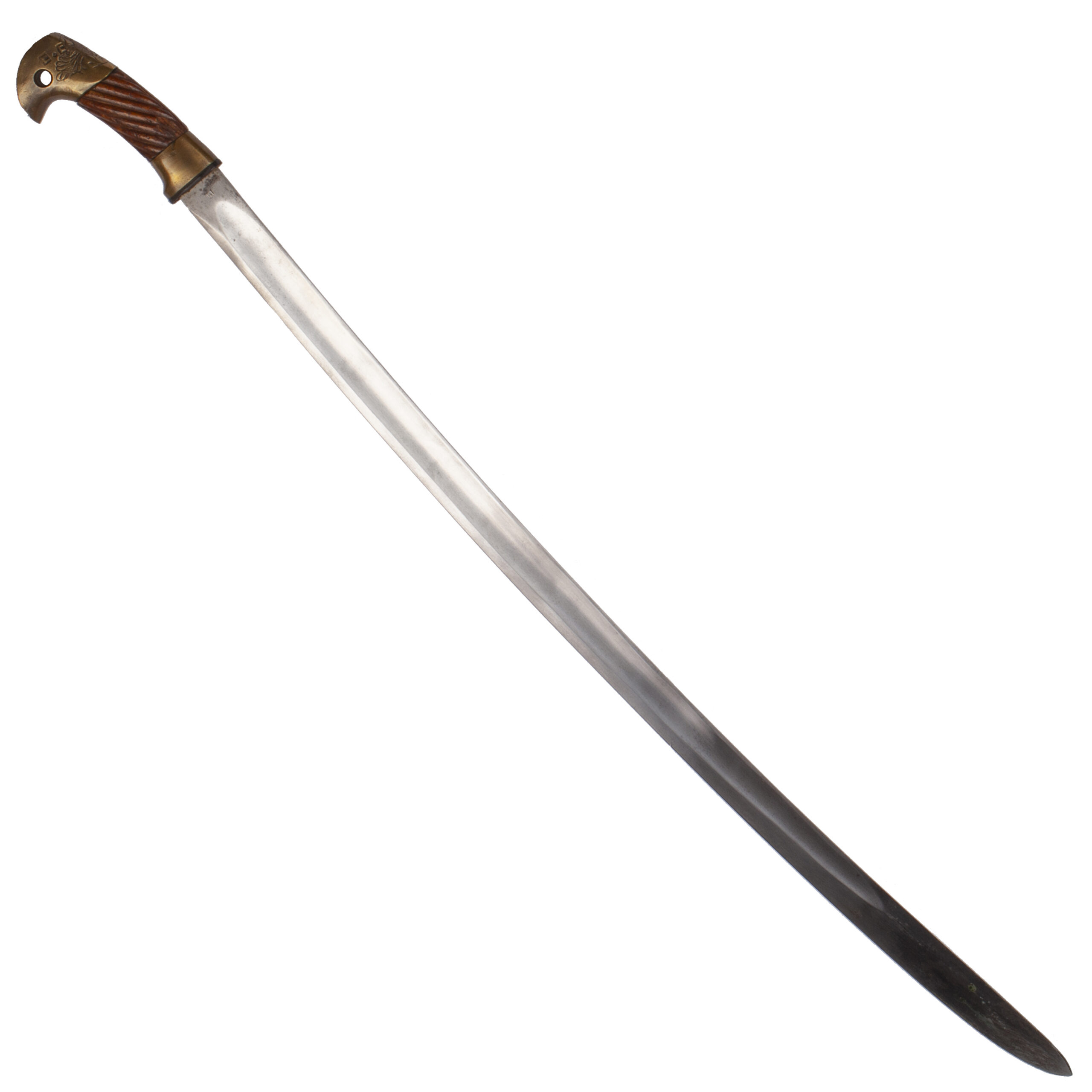 The broad single-edged blade, 23.6 cm in length, features a shallow fuller and retains traces of its original polish and etching. The hilt is fitted with a finely carved wooden grip decorated with floral scroll motifs, complemented by engraved steel mounts of rich ornamental character.