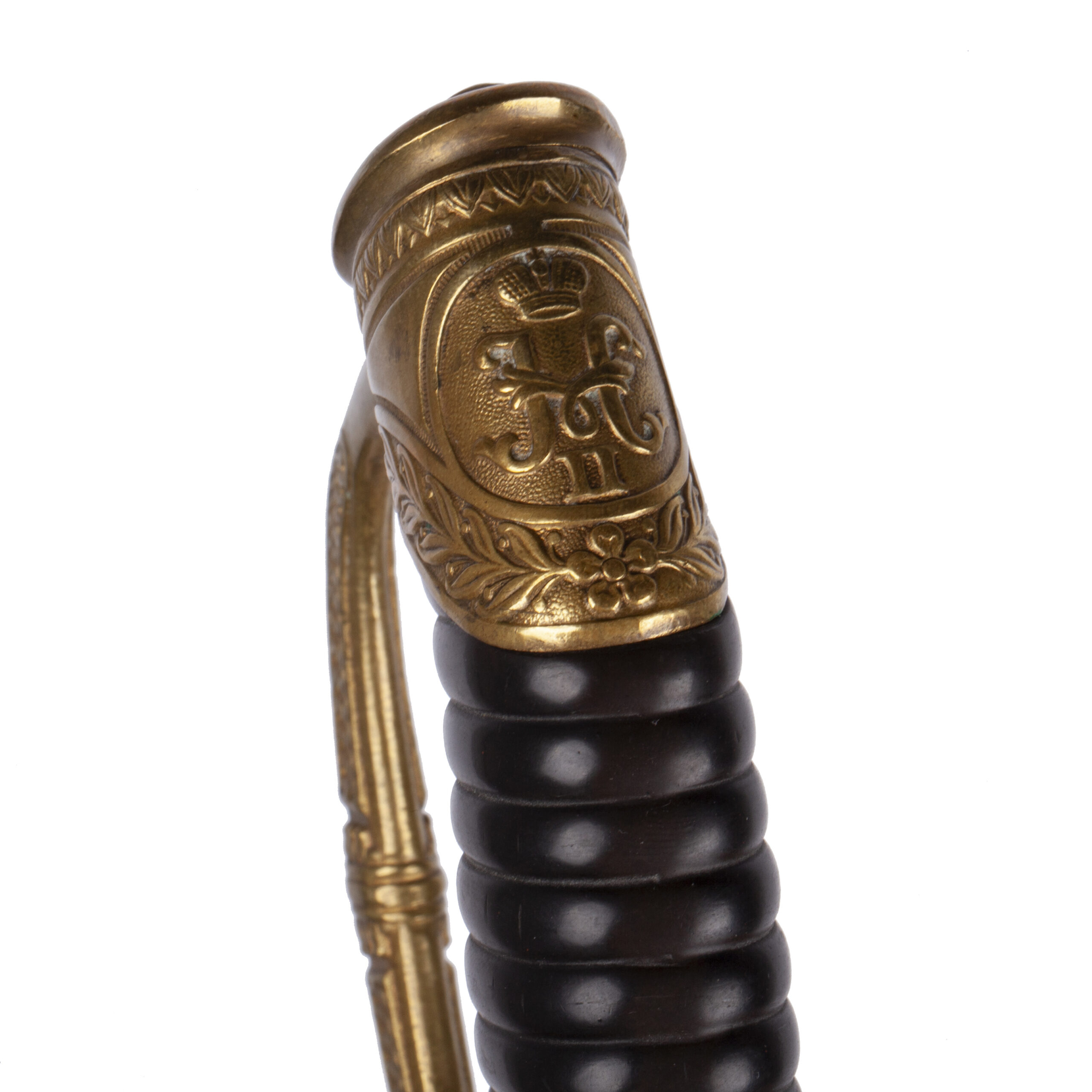 A finely crafted Imperial Naval saber. This luxuriously decorated weapon bears the initial “W” on an anchor motif, signifying respect for the German Kaiser. The lion’s head pommel is set with red and green gemstone eyes, and the grip is elegantly wrapped with gilt wire.Total length: 92.5 cm