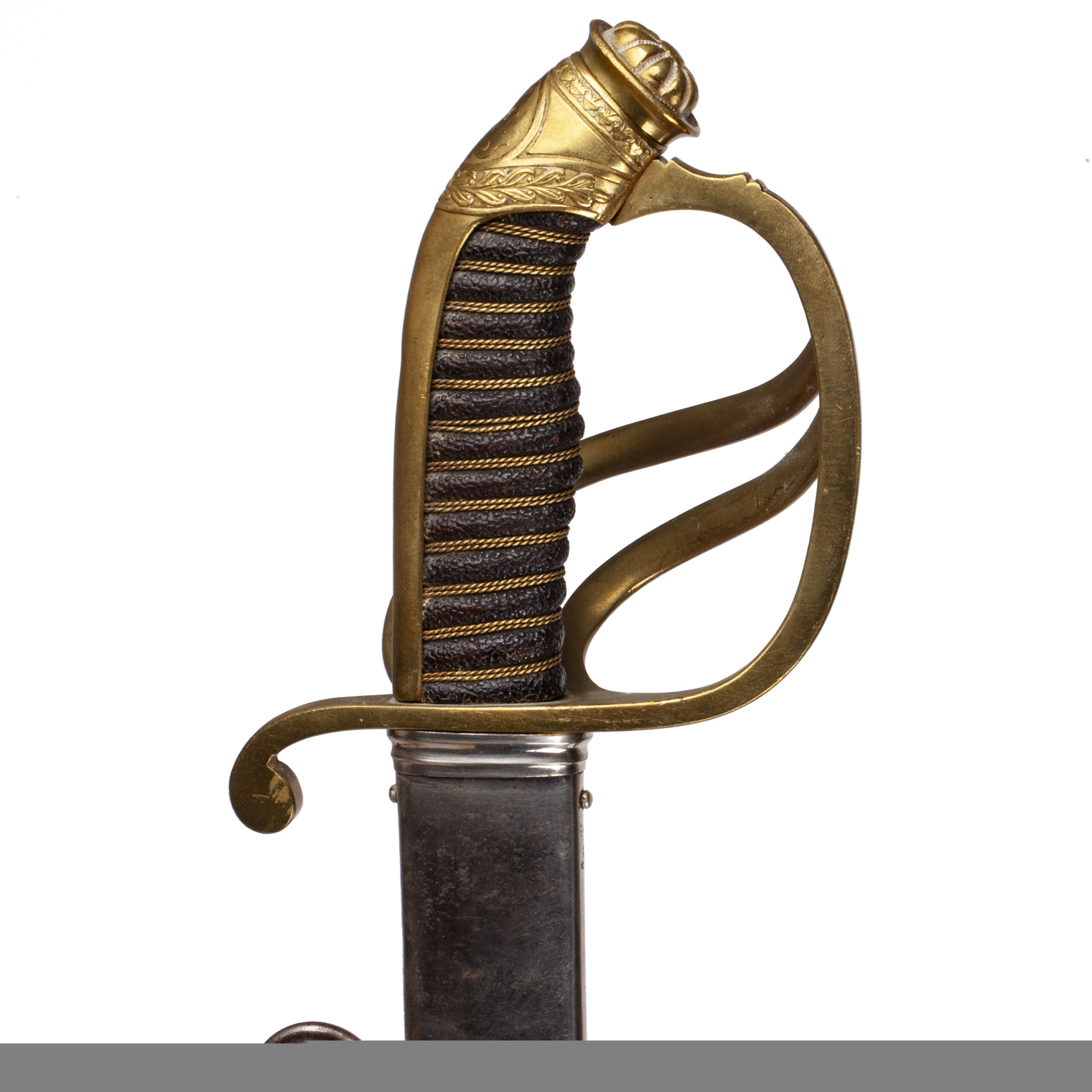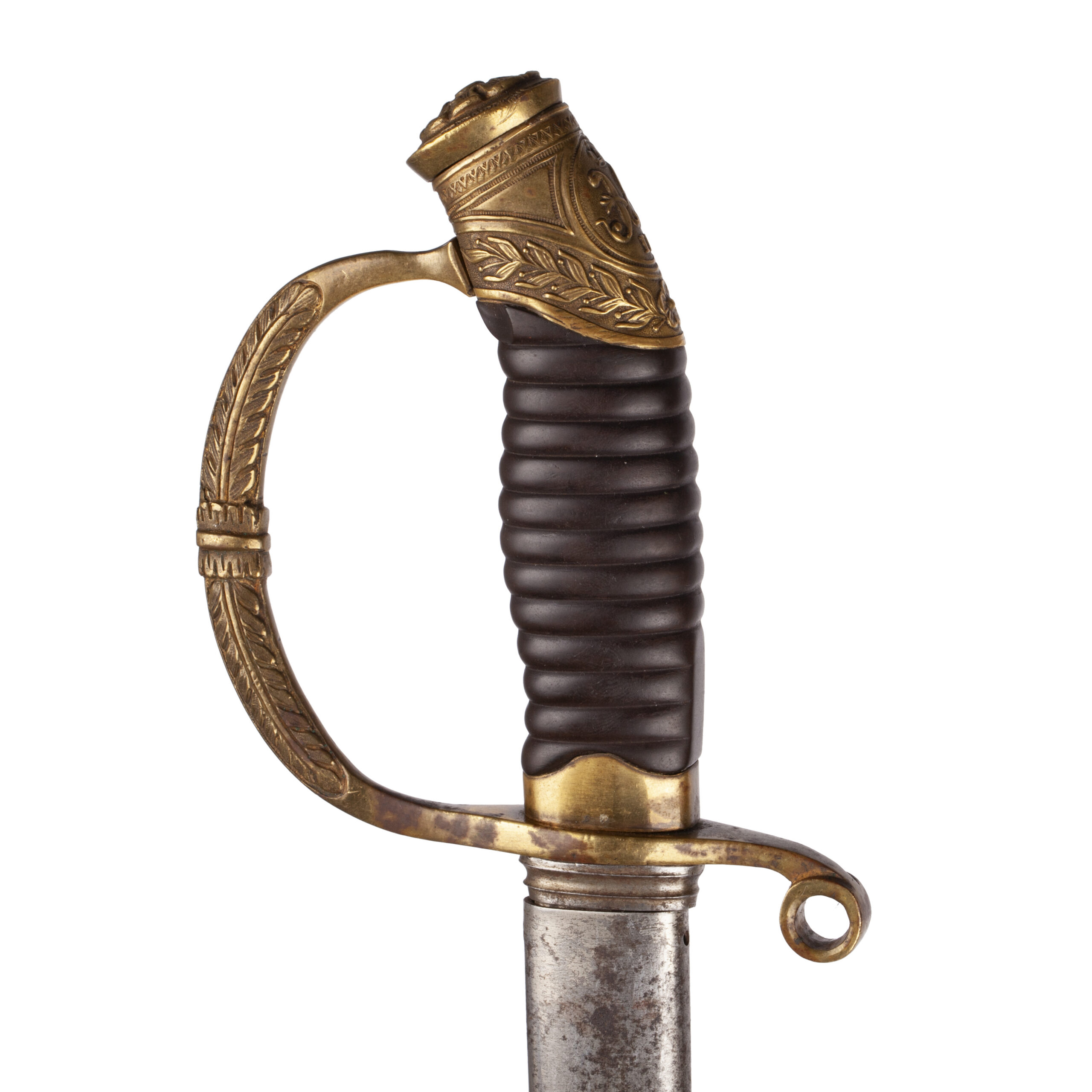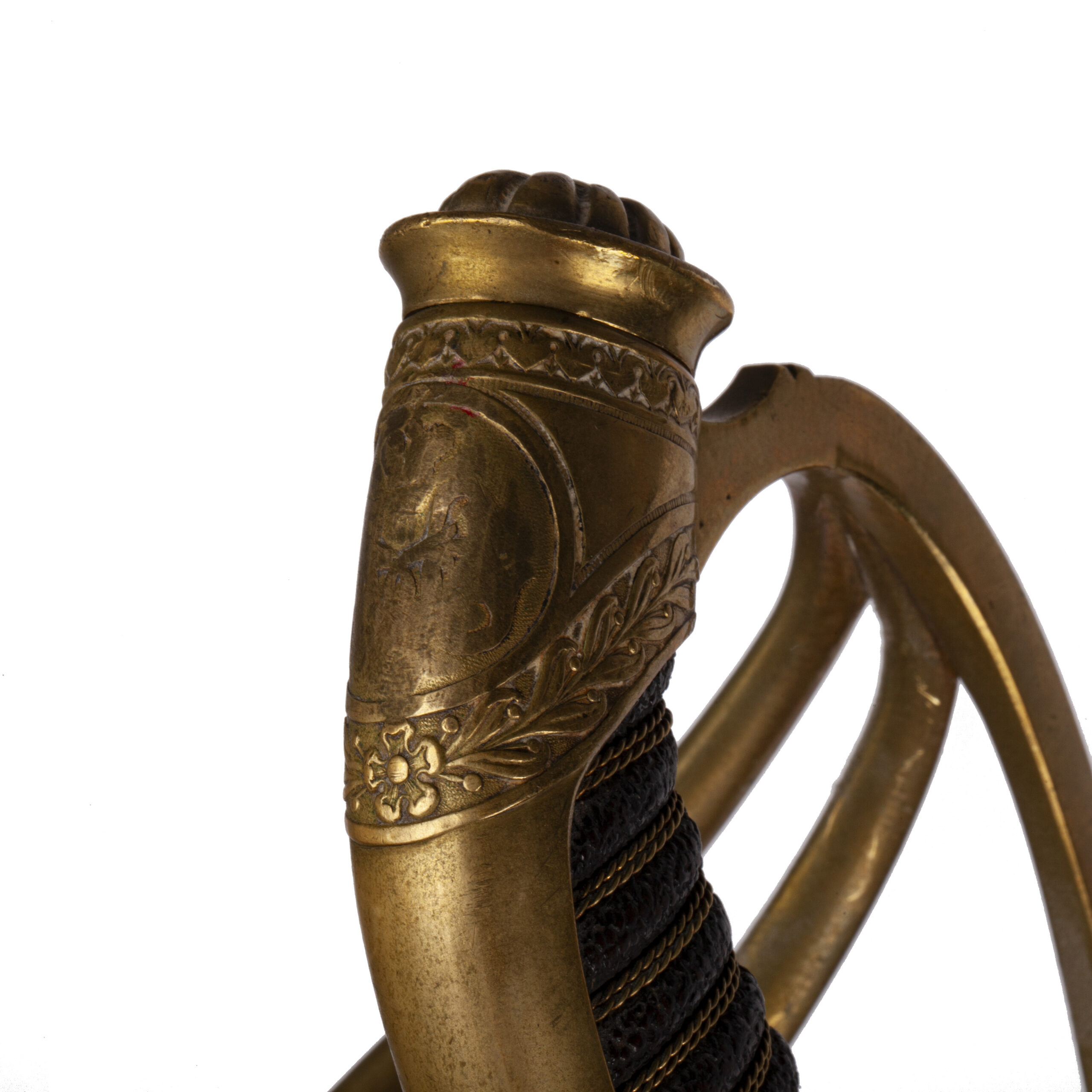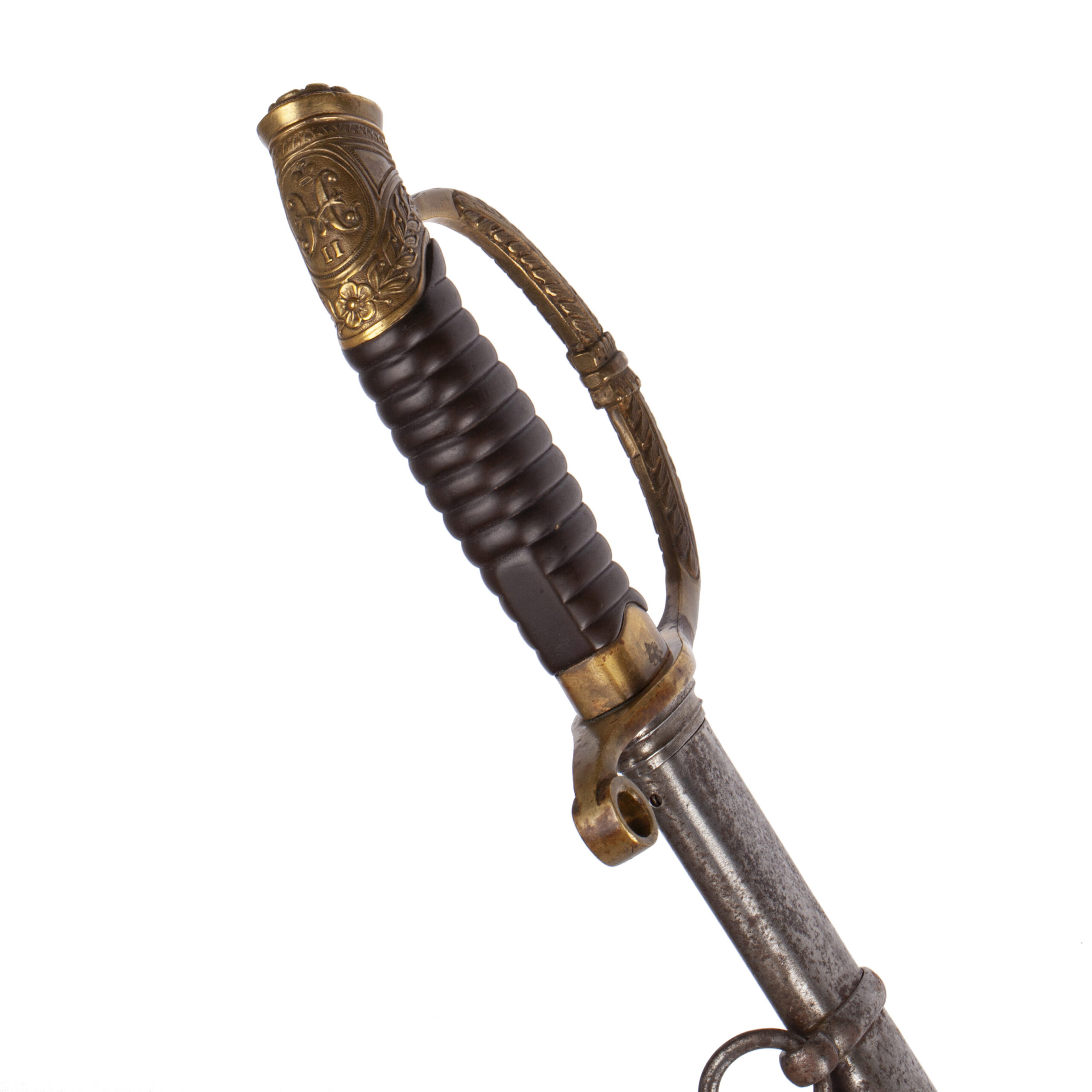 The hilt is of gilded brass, richly decorated with acanthus leaves, oak branches, and the Imperial crown over fouled anchor in relief. The lion’s head pommel has inset red glass “eyes,” and the white grip is bound with gilt wire. The original officer’s bullion portépée is still attached.