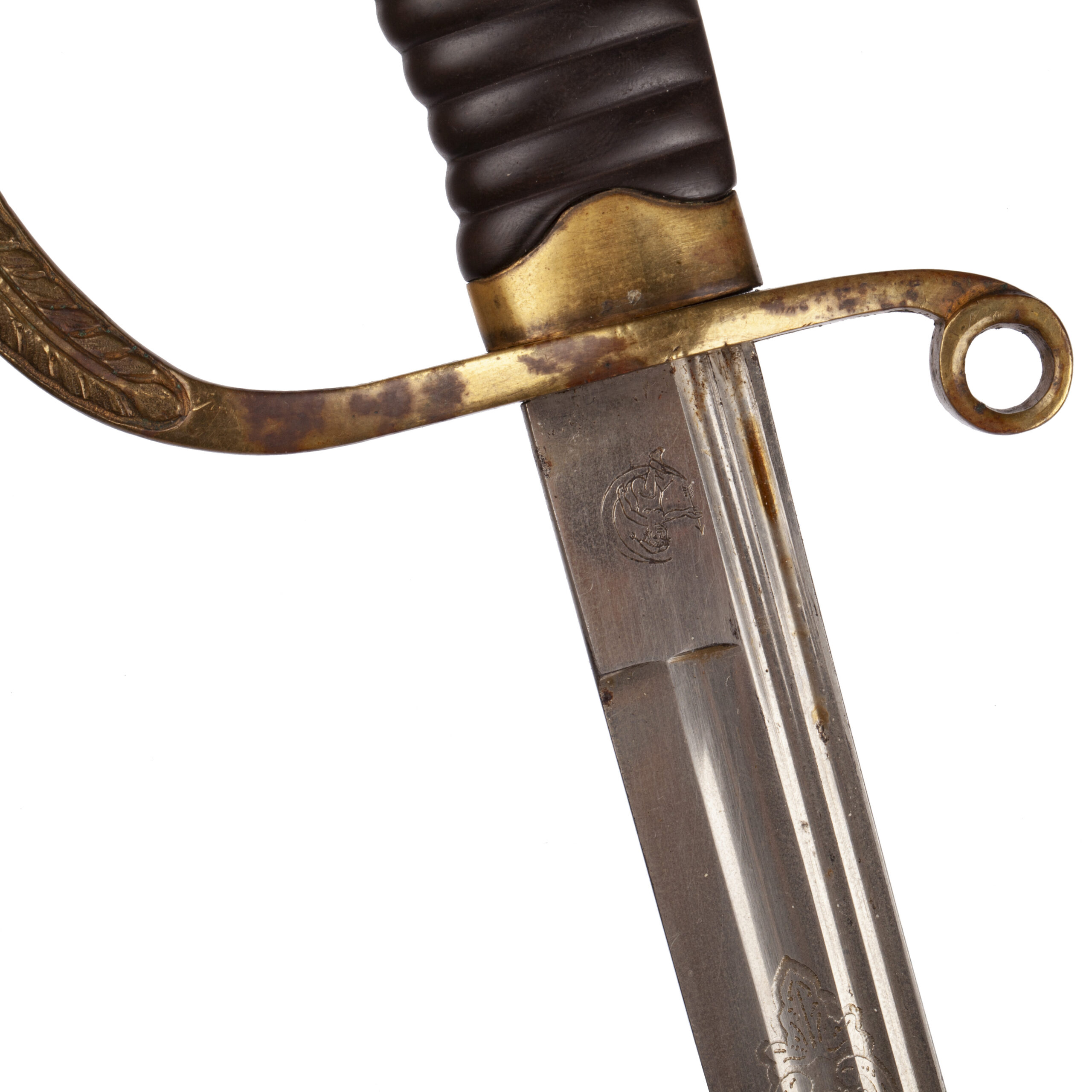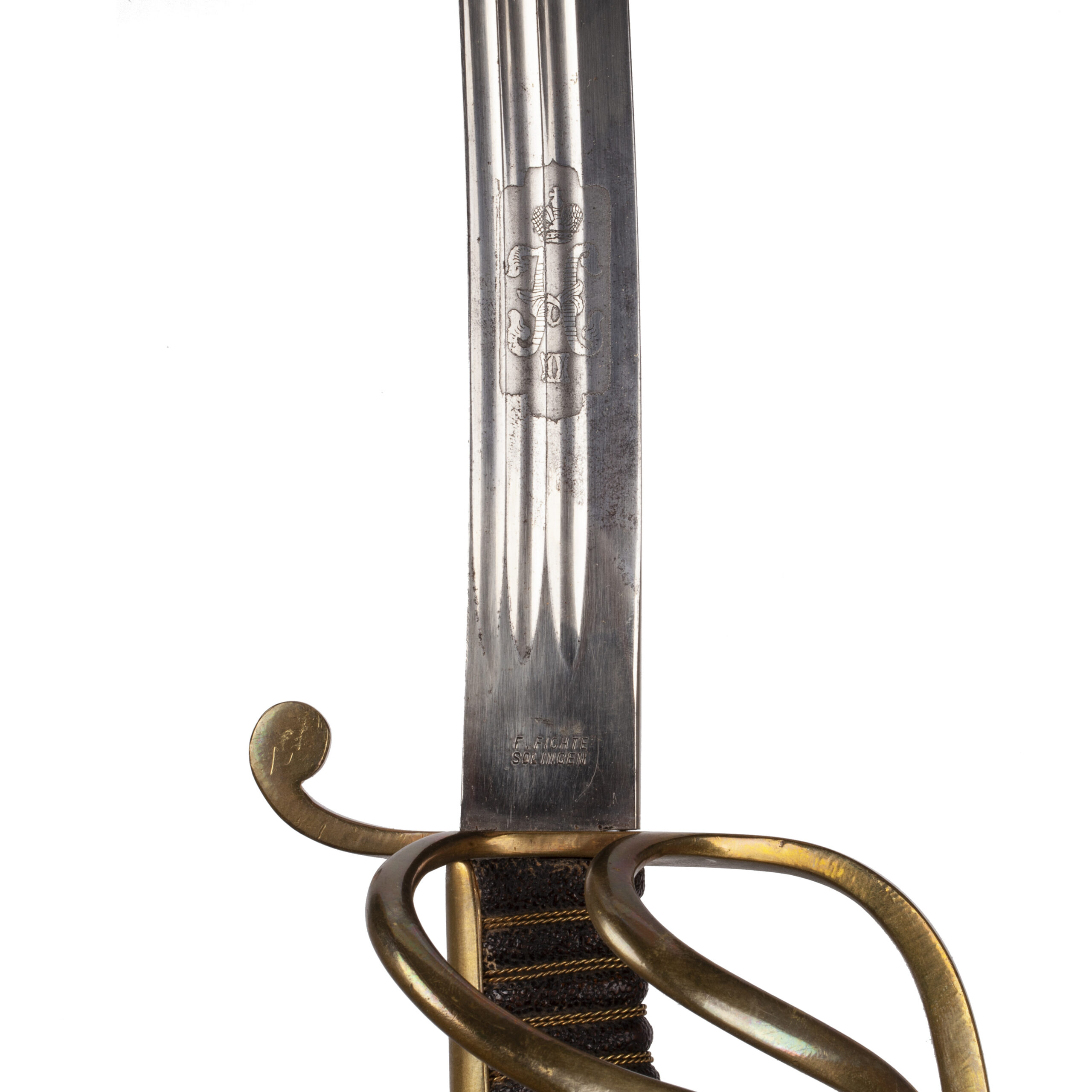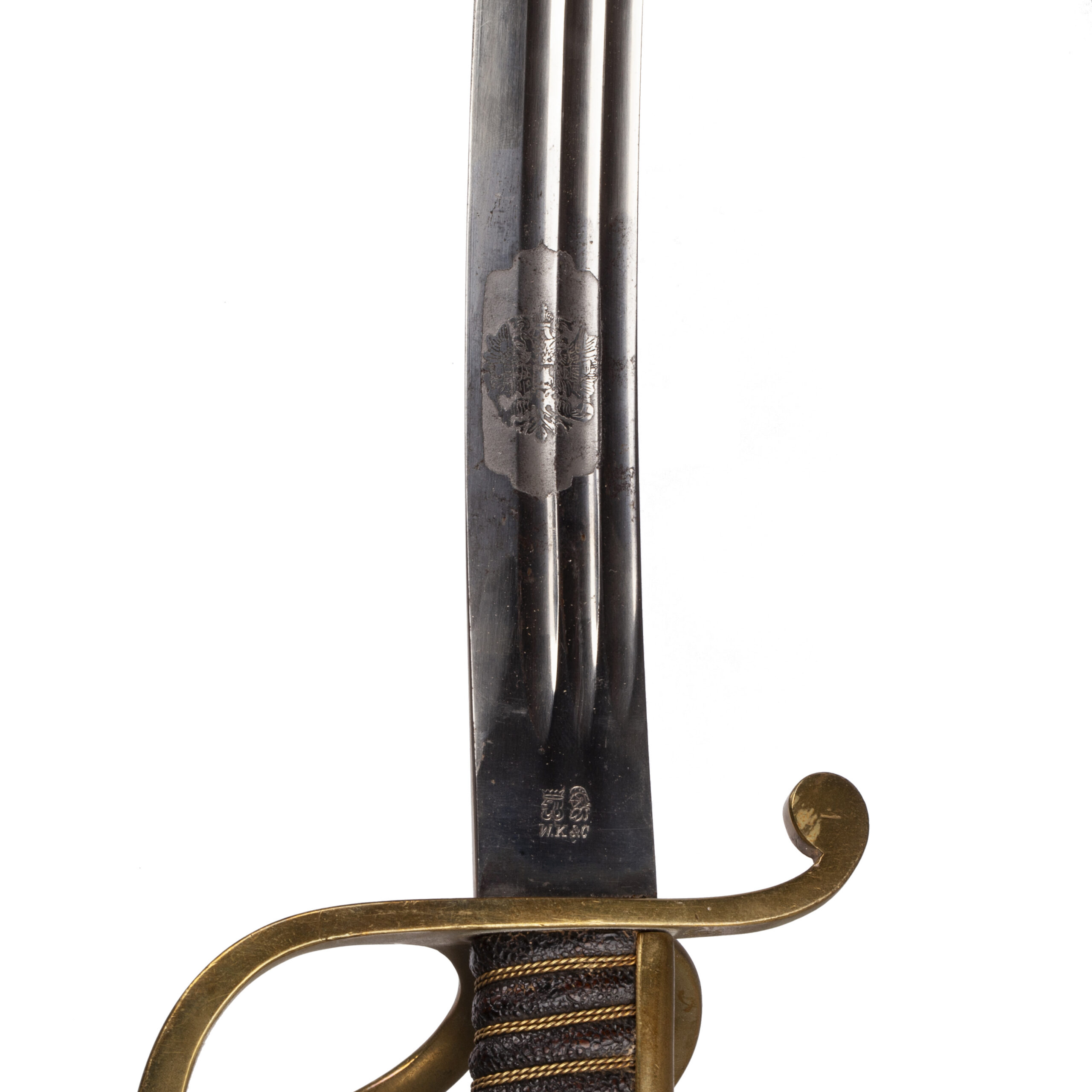 Estimate: 6000-7000€Ultra- Rare Imperial Army/Navy Presentation Sword. Model- 1889( I.O.D. 89). W 154 The upper side of the guard in detail. This weapon (W 153) has a special feature—an indistinct anchor beneath an Imperial crown (with pendilia). Thus, this weapon is undoubtedly attributable to a member of the Naval Infantry. (STJ)