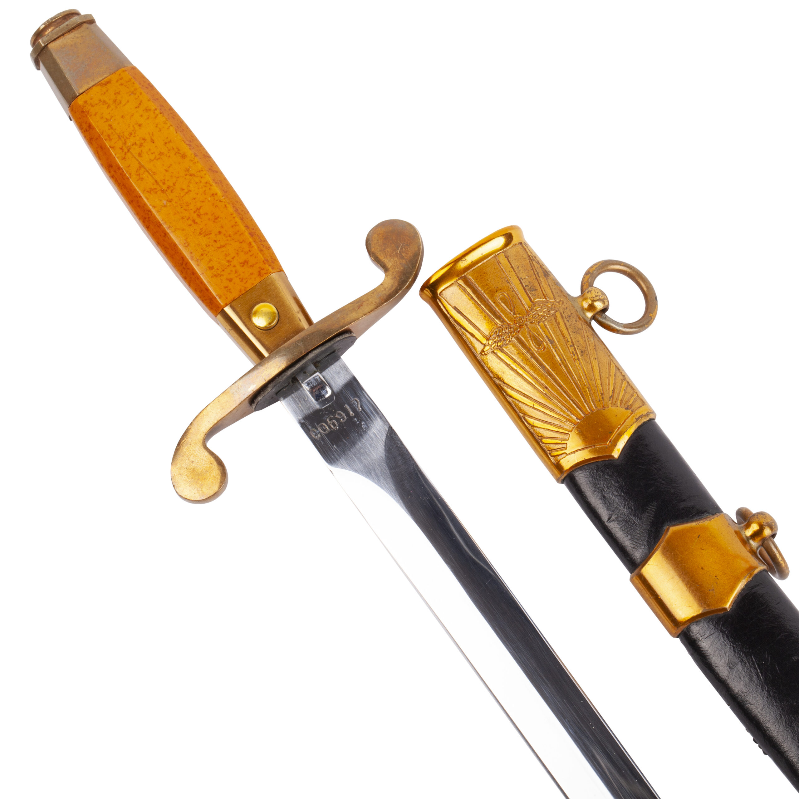 Presented with its black-lacquered metal scabbard with gilded brass fittings and two suspension rings, all in excellent preservation.