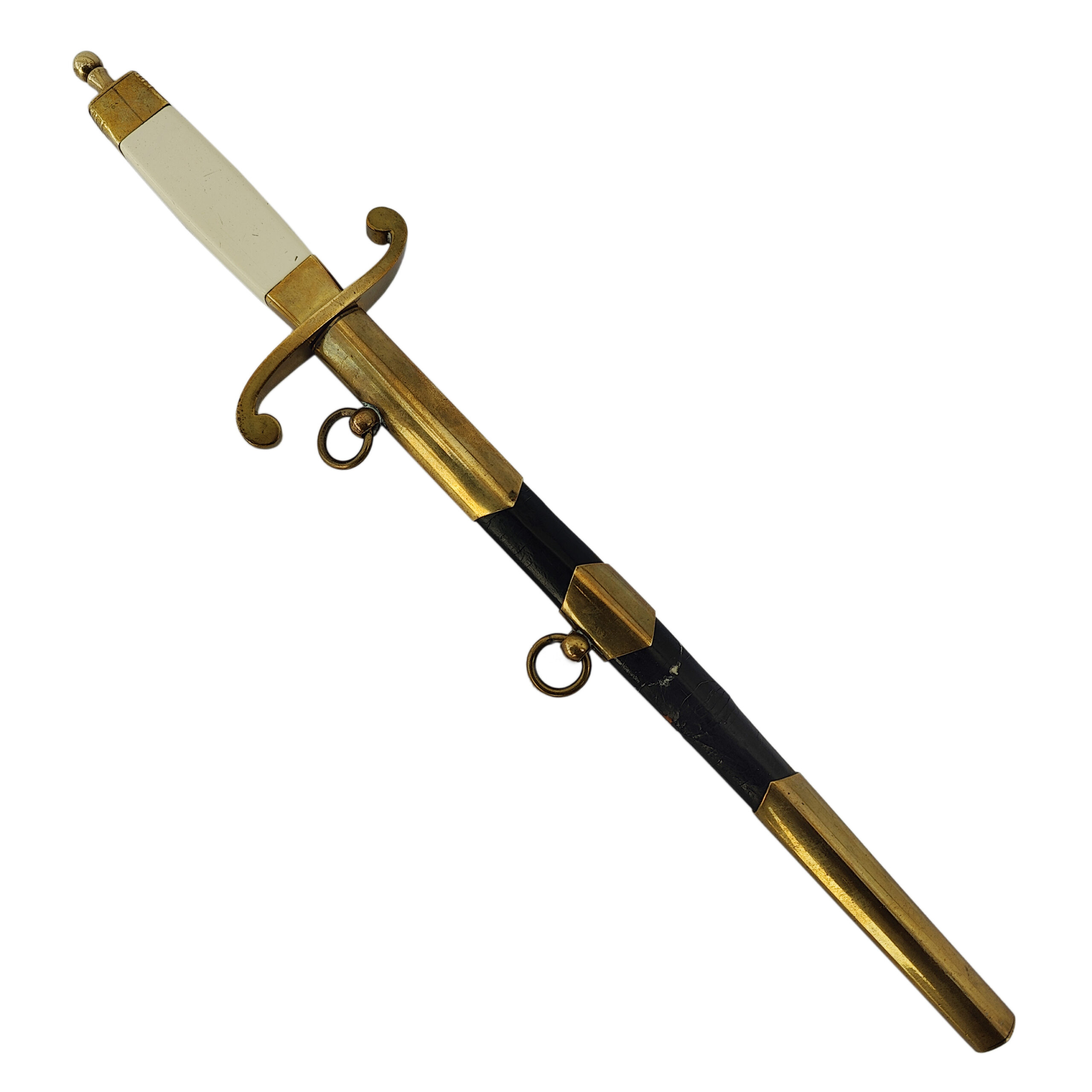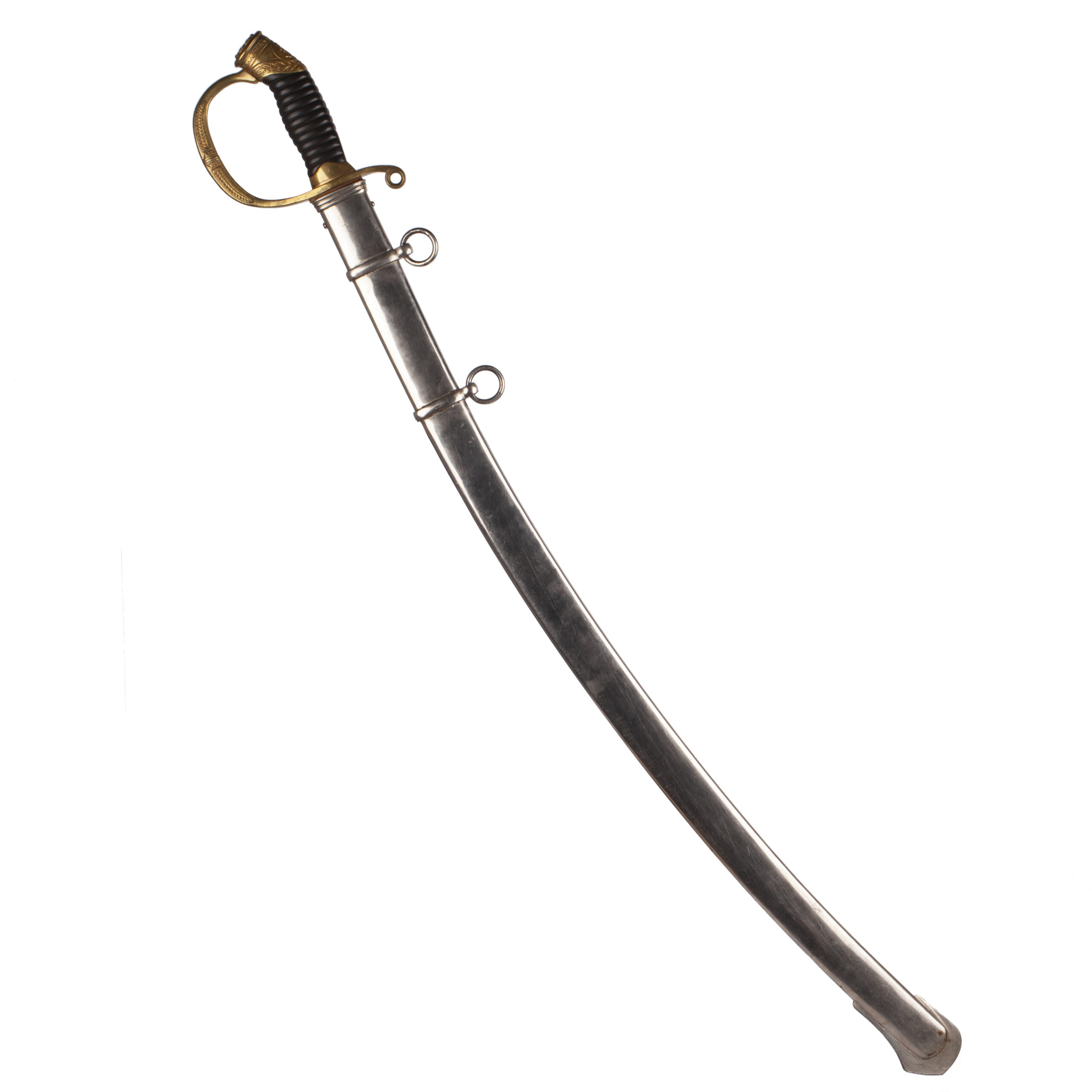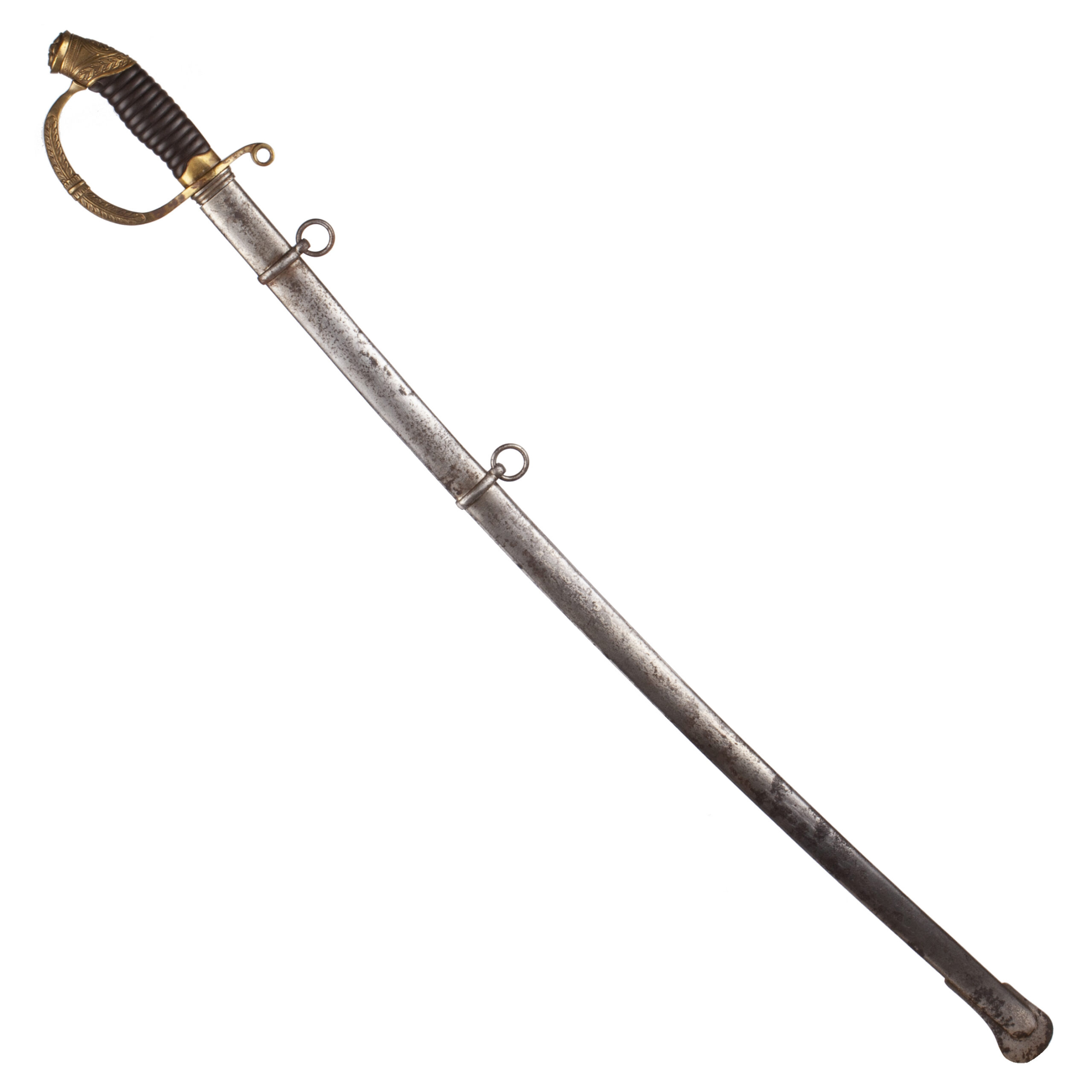 The sword retains its black-lacquered metal scabbard with gilt brass fittings and two suspension rings, showing only light wear.
