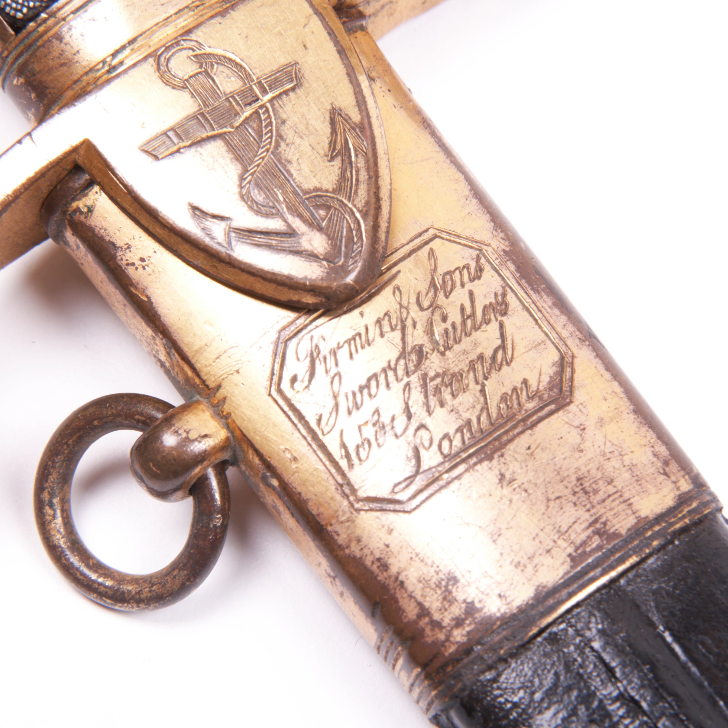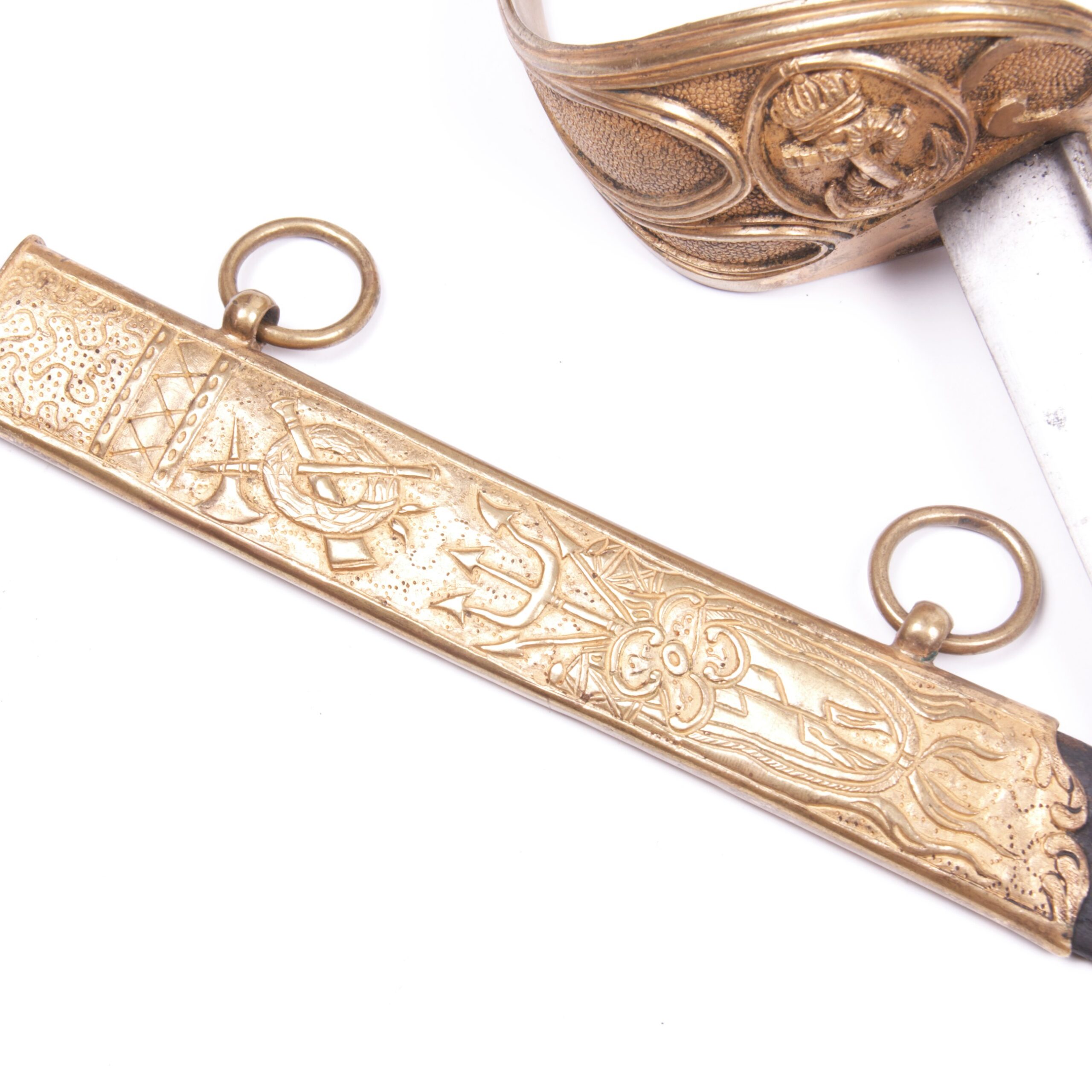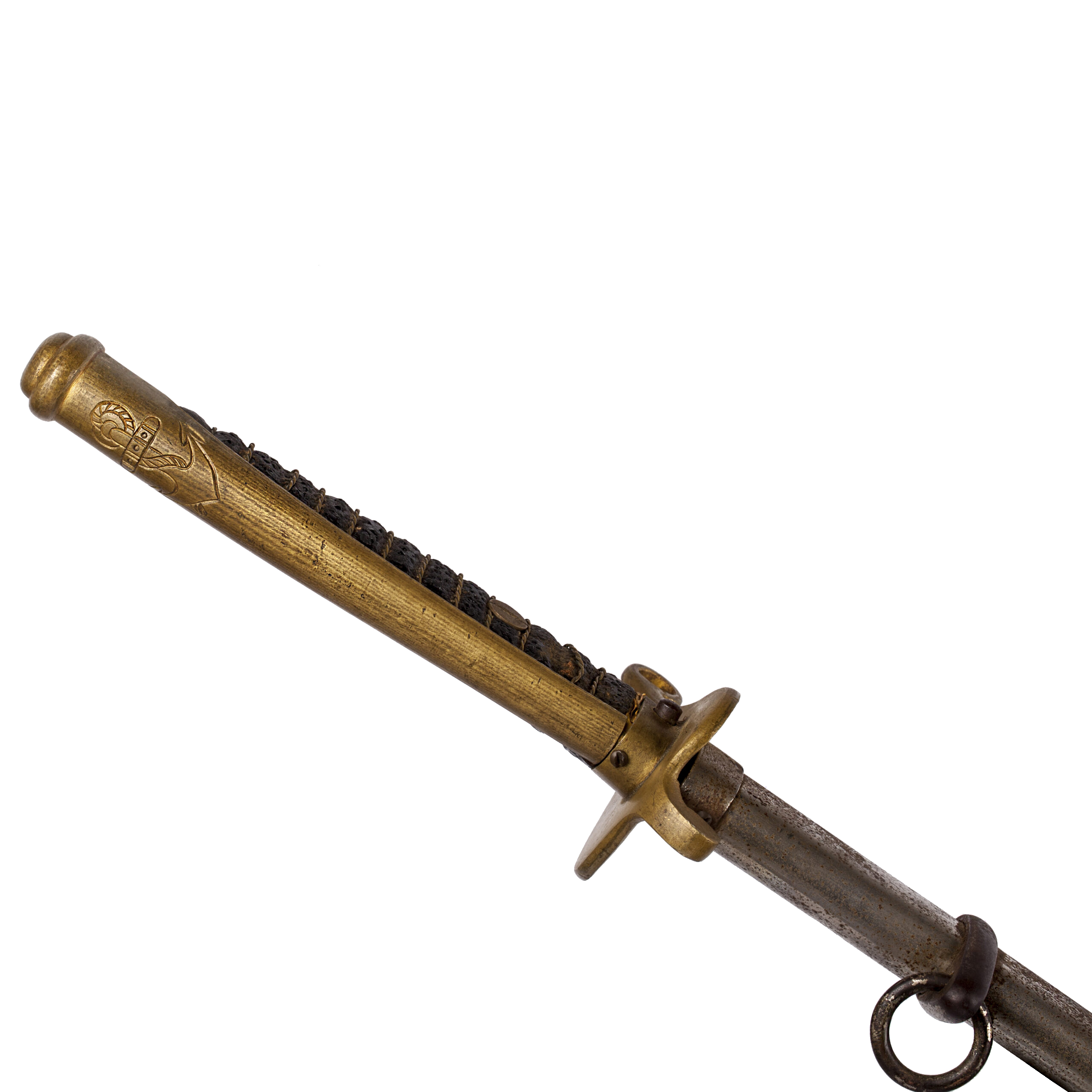 The gilded brass hilt is finely cast with a fouled anchor within a laurel wreath on the guard, surmounted by the Imperial crown. The sharkskin grip, bound with twisted brass wire, remains in very good condition. The sword retains its original leather scabbard with two suspension rings, showing only light age patina.