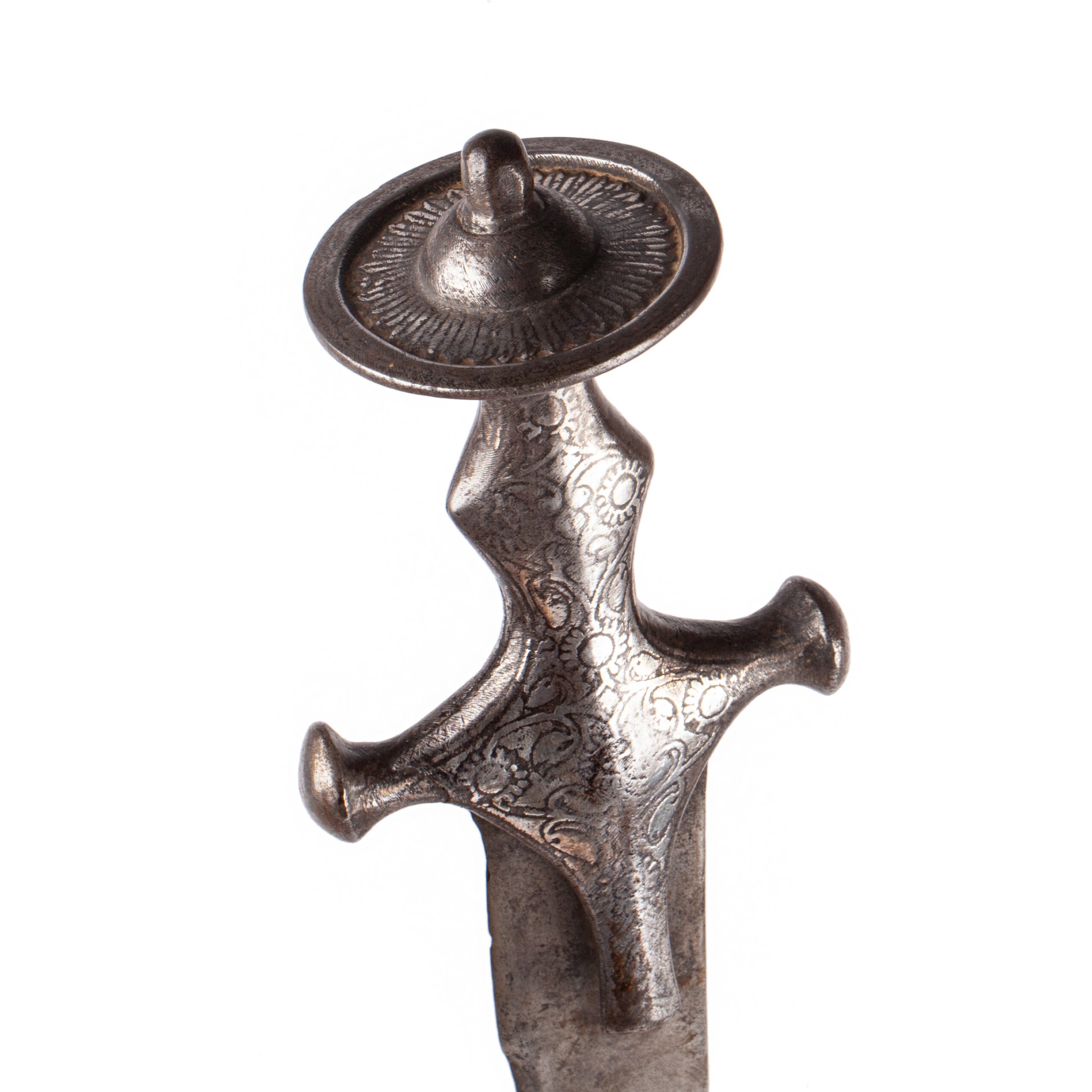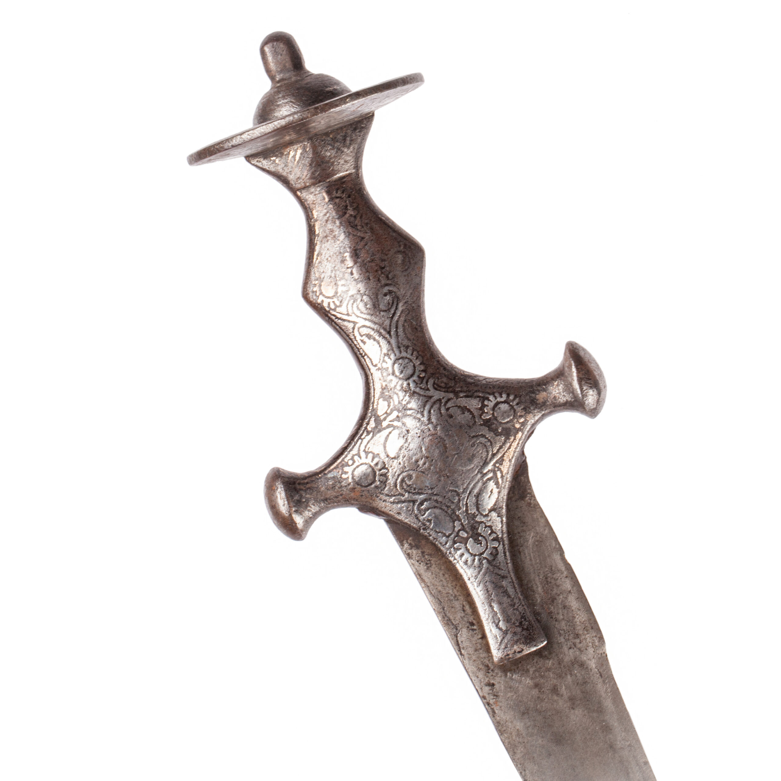The blade is likely made of wootz steel. The steel hilt is decorated with silver.