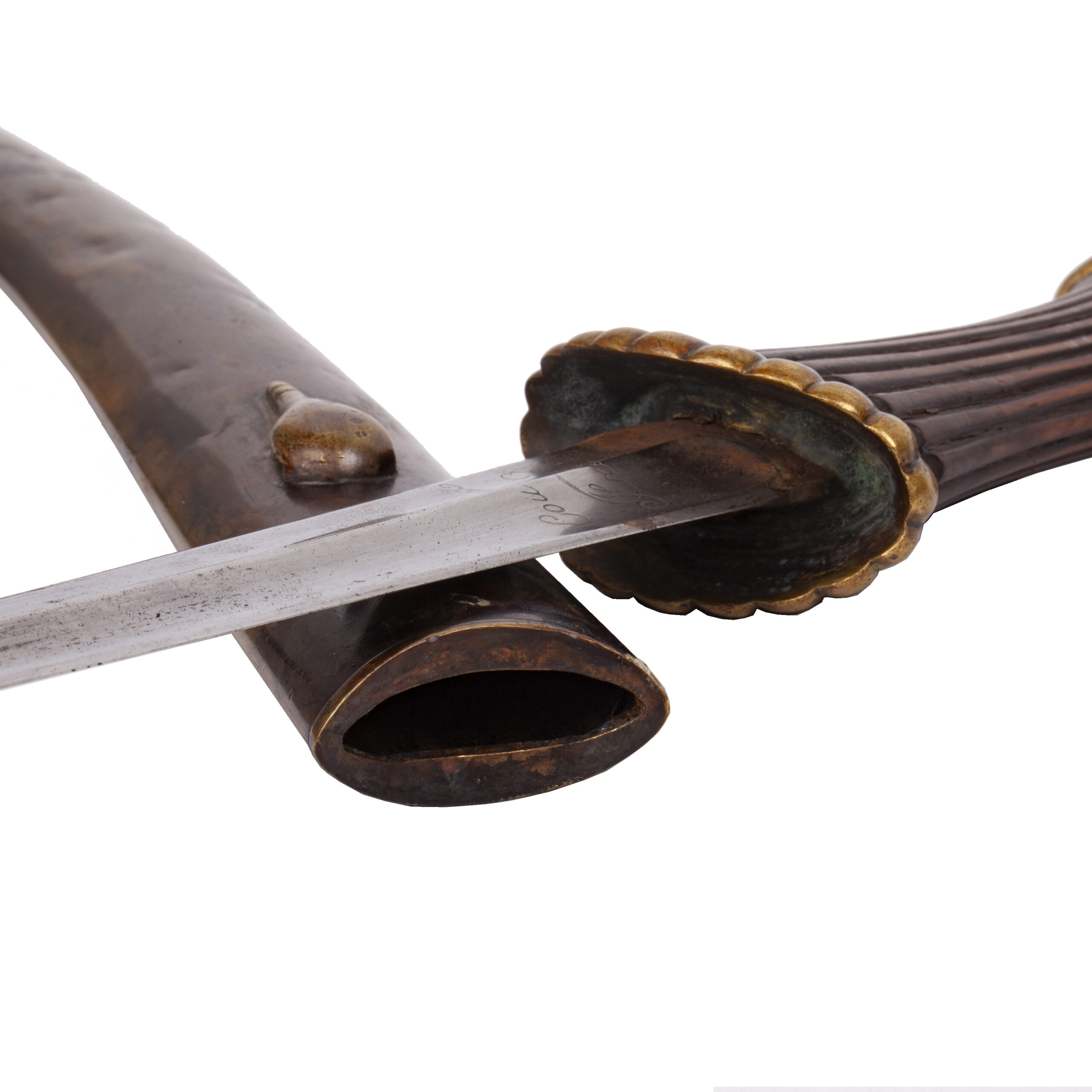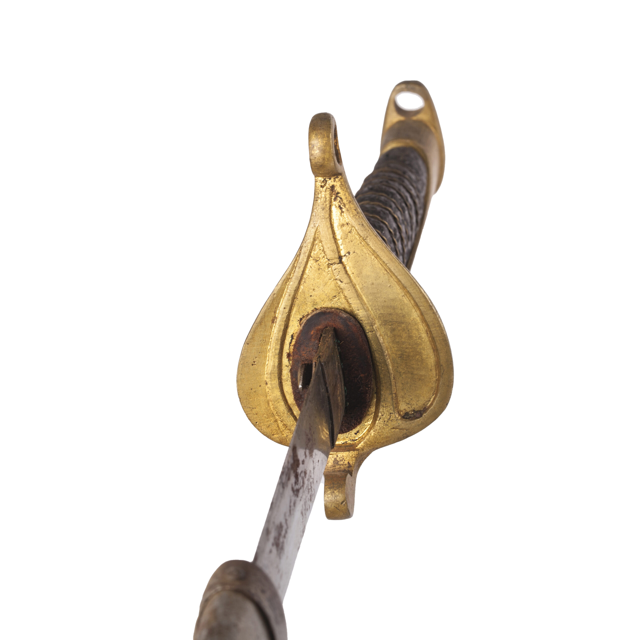 The gilded brass hilt is finely cast with a fouled anchor within a laurel wreath on the guard, surmounted by the Imperial crown. The sharkskin grip, bound with twisted brass wire, remains in very good condition. The sword retains its original leather scabbard with two suspension rings, showing only light age patina.