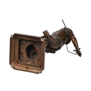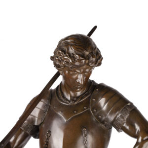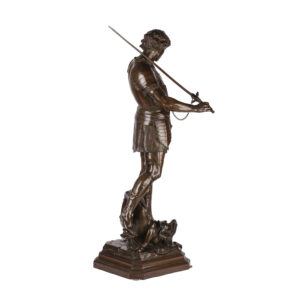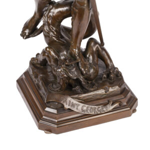 This monumental bronze by Émile Louis Picault depicts St. George, the Christian knight and dragon-slayer, standing triumphantly over the defeated beast. The sculpture captures the hero at rest after battle — his pose calm and resolute, his gaze lowered in quiet reflection. The finely rendered armor, detailed sword, and naturalistic anatomy reveal Picault’s exceptional skill in modeling bronze with both strength and grace.