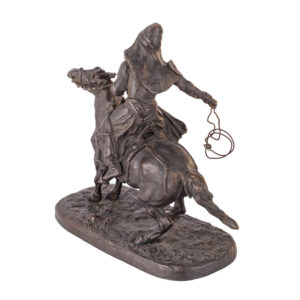 This bronze composition by Evgeny Lanceray represents a mounted Bashkir herdsman, shown in dynamic motion, holding a lasso in his hand. The work belongs to Lanceray’s celebrated ethnographic series, inspired by his extensive travels across Russia and its borderlands.