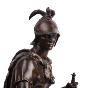 Depicted as a seated Roman warrior, the figure embodies noble restraint and strength through a masterful synthesis of naturalism and classical idealization. The serene dignity of the soldier’s pose and the finely rendered drapery are hallmarks of Dubois’s distinctive “Neo-Florentine” style, blending Renaissance influence with French academic sculpture of the 19th century.