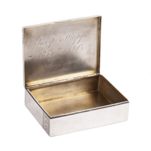 Estimate: 1200-1500€A Soviet silver-gilt cigar box, Latvia, 1937. Rectangular form, the hinged cover engraved with stylized borders imitating a cigar band. The inscriptions within the band read: