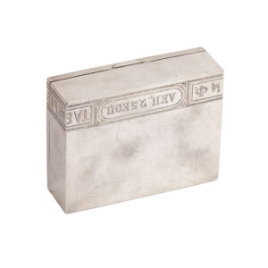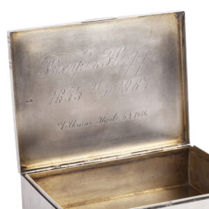A Russian silver-gilt advertising cigar box, made by the K. Skvortsov manufactory, Moscow, 1899–1908. The hinged cover finely engraved with inscriptions and ornaments imitating a tobacco package, promoting the Rostov-on-Don tobacco company “Asmolov & Co”, one of the leading Russian tobacco traders of the time. Dimensions: 14 × 10.9 × 4.3 cm. Weight: 417 g.