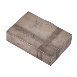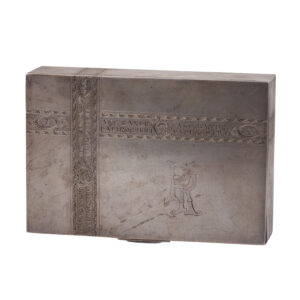 Estimate: 2000-2500€A Russian silver-gilt advertising cigar box, made by the K. Skvortsov manufactory, Moscow, 1899–1908. The hinged cover finely engraved with inscriptions and ornaments imitating a tobacco package, promoting the Rostov-on-Don tobacco company “Asmolov & Co”, one of the leading Russian tobacco traders of the time. Dimensions: 14 × 10.9 × 4.3 cm. Weight: 417 g.