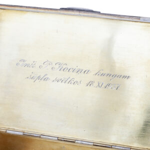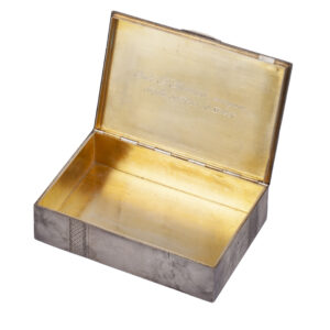 A Soviet silver-gilt cigar box, Latvia, 1937. Rectangular form, the hinged cover engraved with stylized borders imitating a cigar band. The inscriptions within the band read: