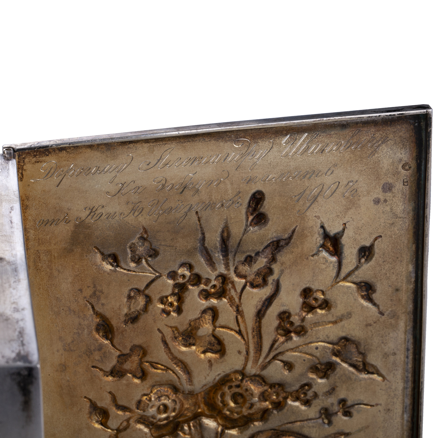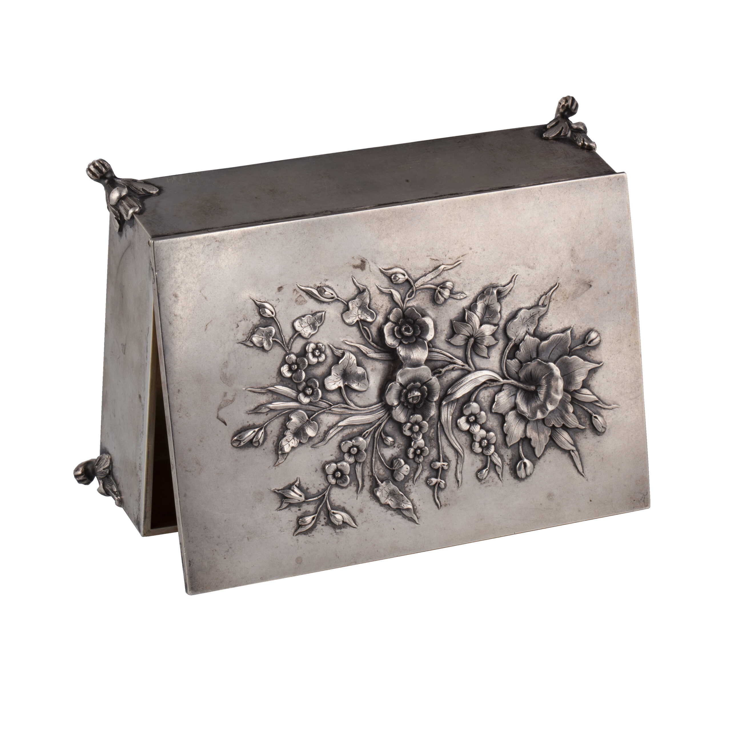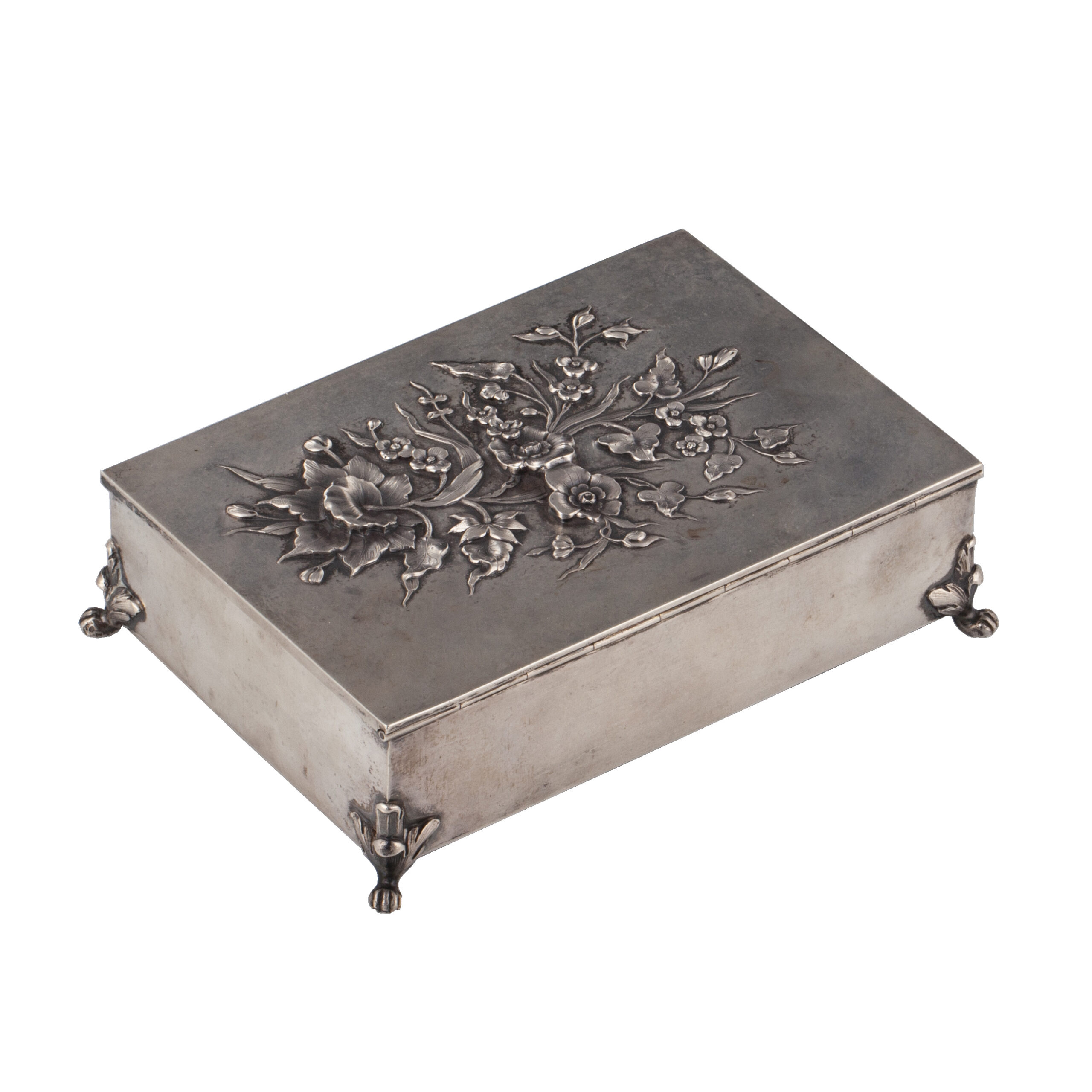 Estimate: 4000-5000€A Russian silver-gilt cigar box, “Flowers Bouquet” the hinged cover applied with a sculptural relief of blossoming flowers and leaves. The rectangular body raised on four stylized feet. Maker’s mark of Vasiliy Rukavishnikov, Moscow, 1899–1908.