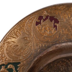 An interesting silver-gilt and champlevé enamel ashtray, decorated with polychrome enamel motifs and intricate floral engraving. Maker’s mark of Emil Radke, Minsk, 1894. Marked Radke 84.
