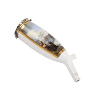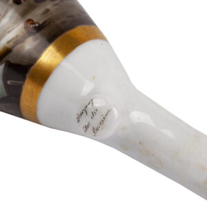The pipe bowl is made in the most famous porcelain pipe form, the stummel — an oval bowl with a knob heel and a short stem, originally derived from the Gouda clay pipe. Its shape made it especially suitable for miniature painting, and from around 1780 workshops such as Meissen and the Königliche Porzellan Manufaktur in Berlin perfected the art of lifelike decoration, often based on contemporary engravings. Painted subjects included portraits, landscapes, and historical events such as the Napoleonic Wars.