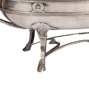 An elegant oval silver vase with two sweeping handles, raised on four shell-capped supports joined by a stretcher. The body is encircled by a delicate frieze of laurel wreaths and beading, while the interior is richly gilded.